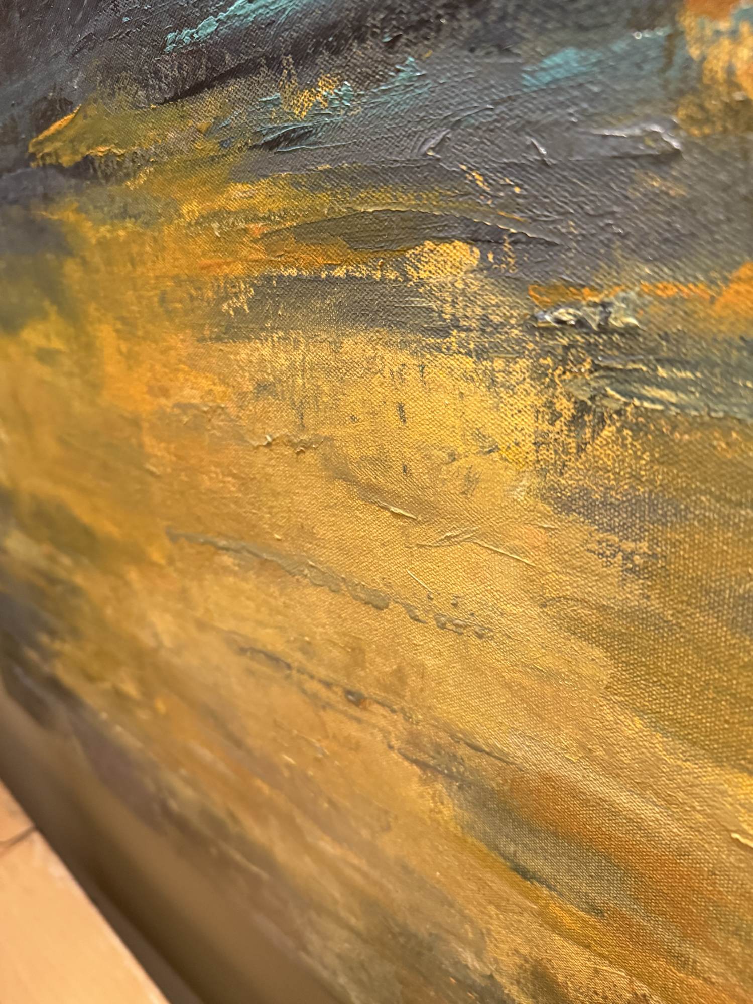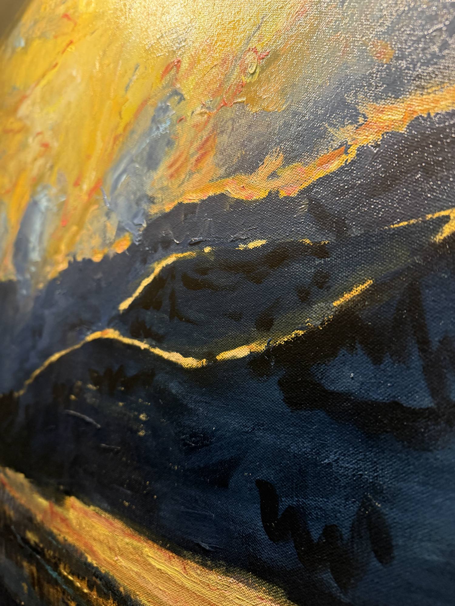 Expressionistic painting of the Ashokan Reservoir. Loose style with most painterly detail in the sky