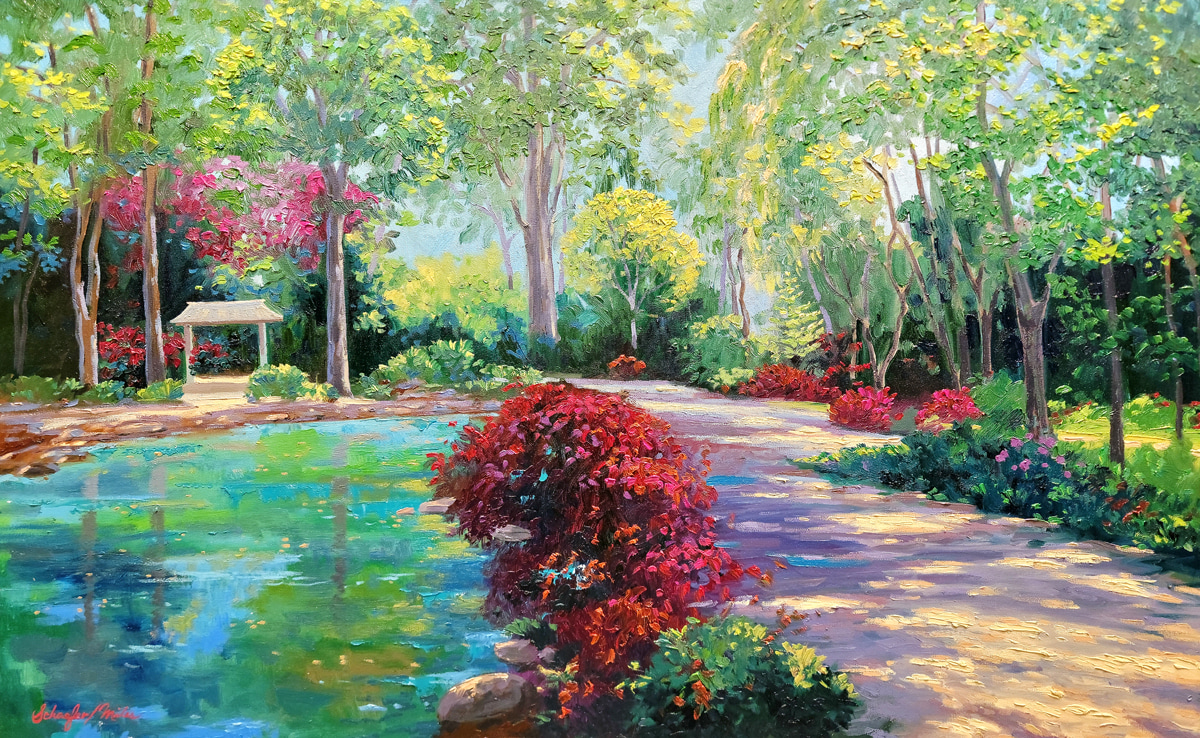 - Signature: Signed lower front in red oil paint. Signed in Verso in pencil: "A Place of Beauty" Original Oil ©Schaefer/Miles