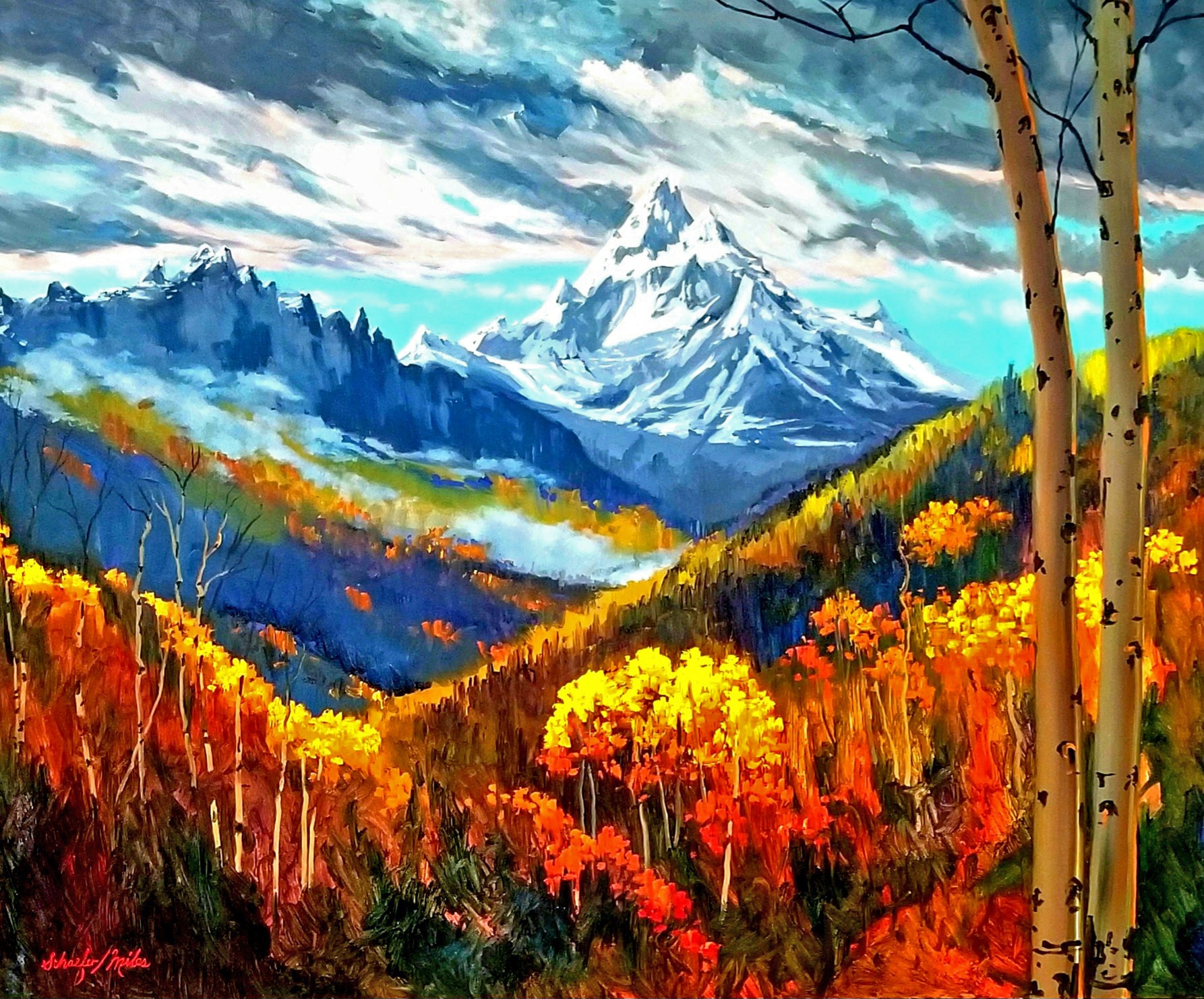 - Signature: It is signed in Red Oil Paint on the lower front. Schaefer/Miles Signed in Verso in pencil upper corner. "Moody Mountain Majesty" ©Schaefer/Miles Original Oil