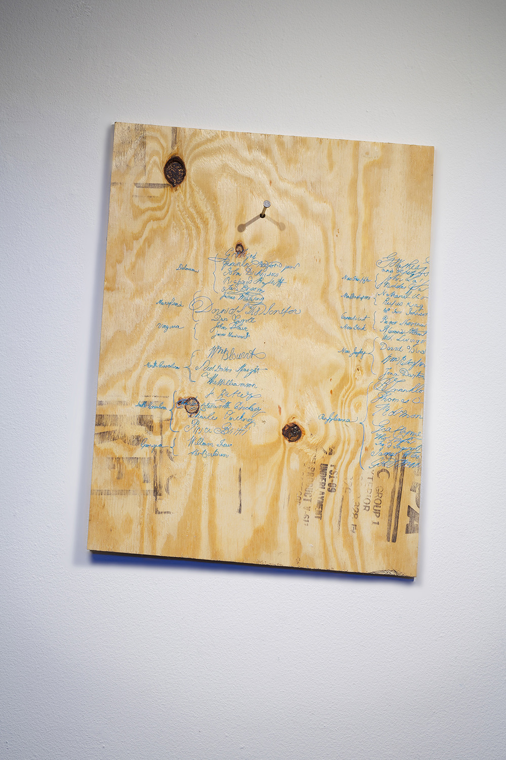 The signatures of the US Constitution are rendered in blue thread on a scrap piece of plywood. A large nail punctures the face of the document. The individual signatures become obscured by the small size of the wood, leaving many names unfinished or unrecognizable, much like history itself.