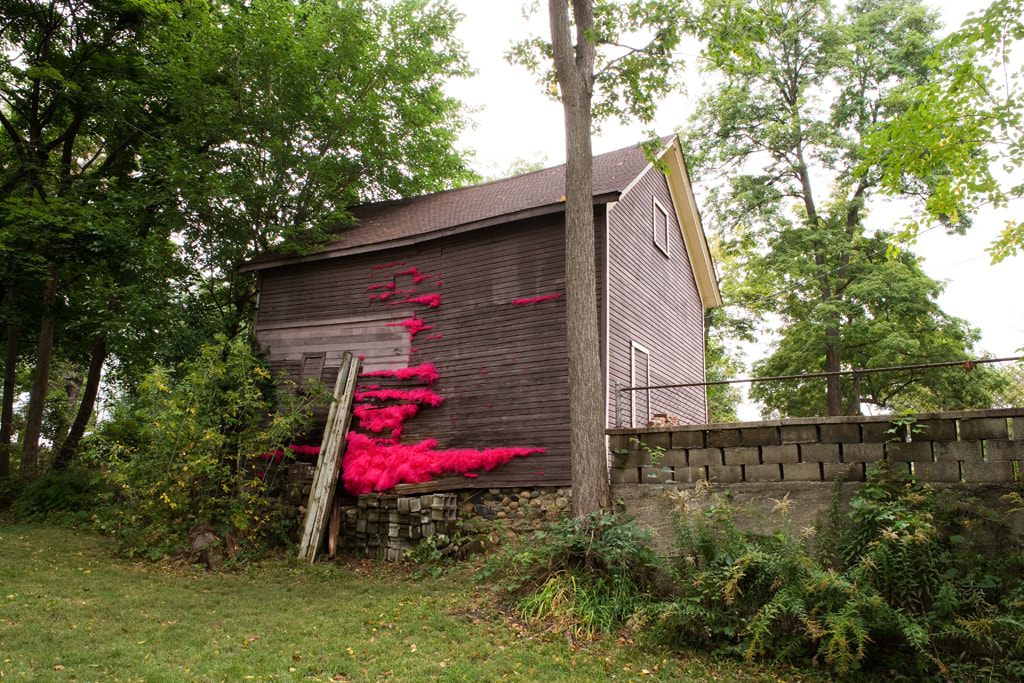 Documented installation of pink tulle inserted in the broken facade of an aging barn in