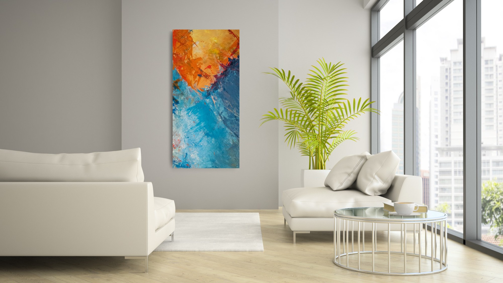 This painting took some time to evolve as I worked with acrylic paint, modeling paste, and scraping tools; adding and subtracting layers, walking away and coming back. Finally, a face exuding strength and boldness, yet grace, emerged, with pharoah “hat”, head raising up as if awakening and coming into focus to herself and to the viewer. The orange colors and hues, and cross-hatching, help with this effect. The Egyptian blue color supports the theme. When I look at it, it comes across as both feminine and masculine, powerful and contemplative.