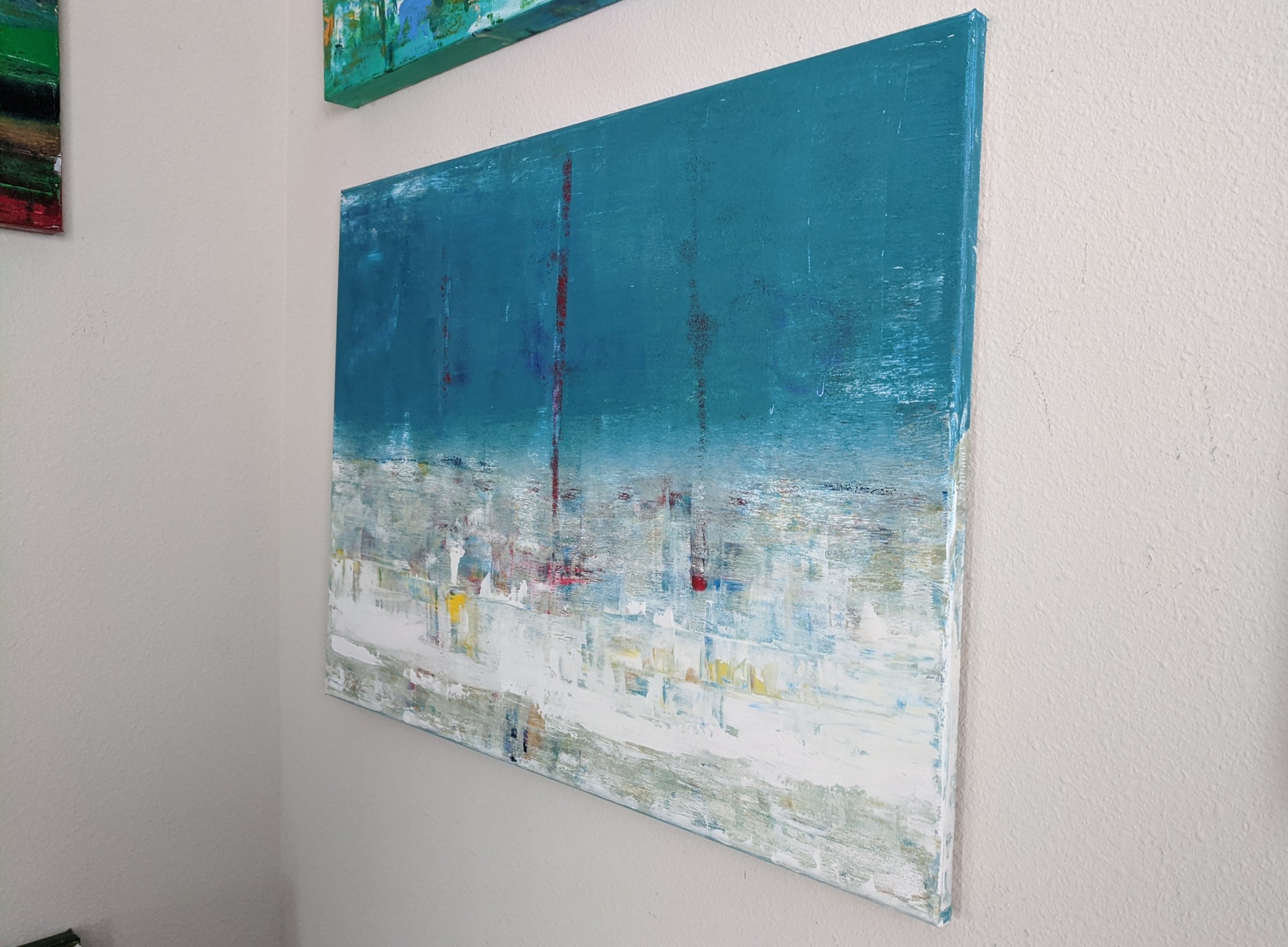 This painting is a recollection of the look and feel the beach on a hot, bright, shimmery day. For this acrylic painting, I used a brayer roller and my hands. I love the rich ocean-y colors and the white sand beach with multi-colored flecks like sunshine dancing. The roller is good for laying down and picking up bits of paint, thus working nicely here to create those color flecks.
