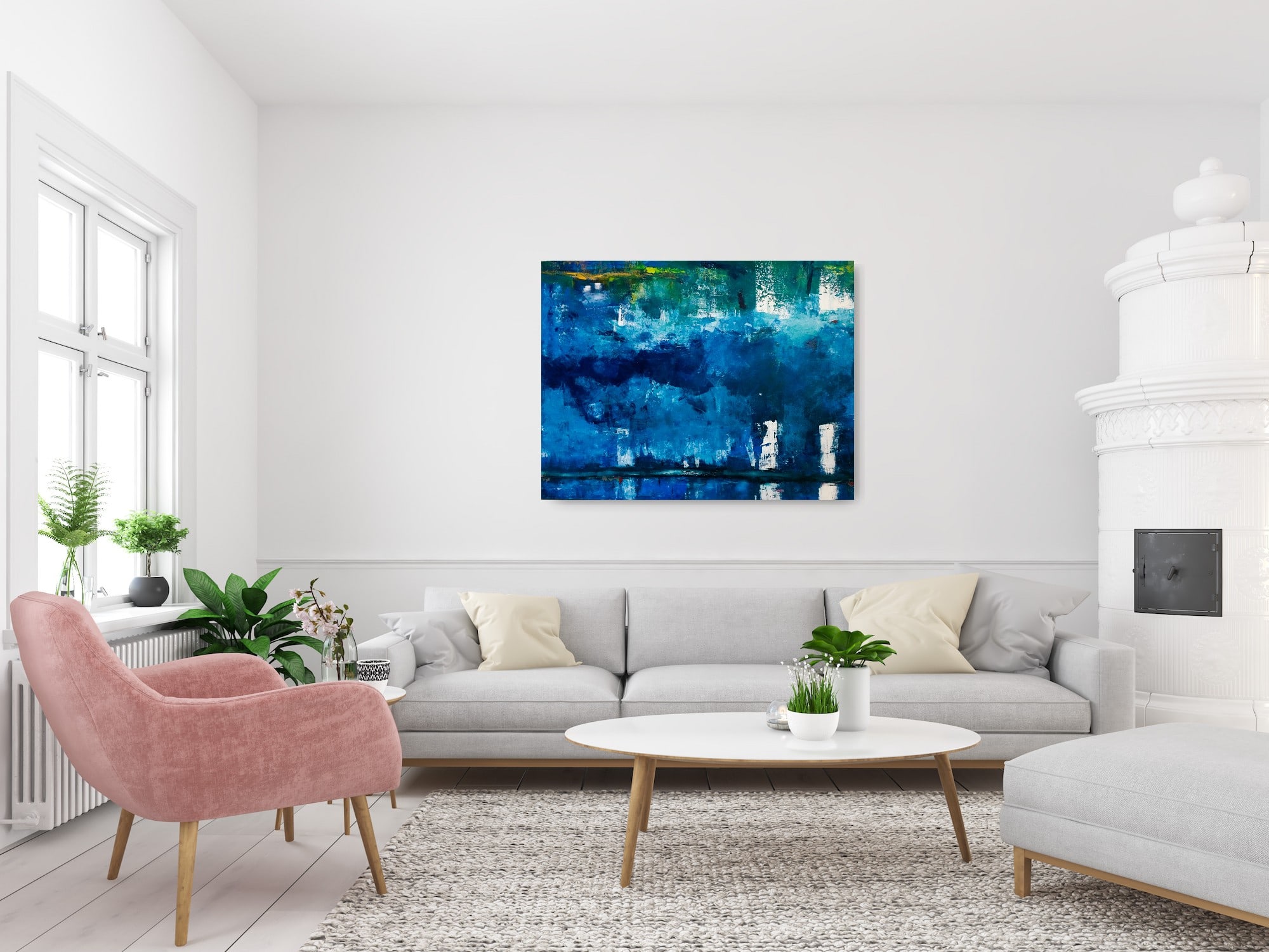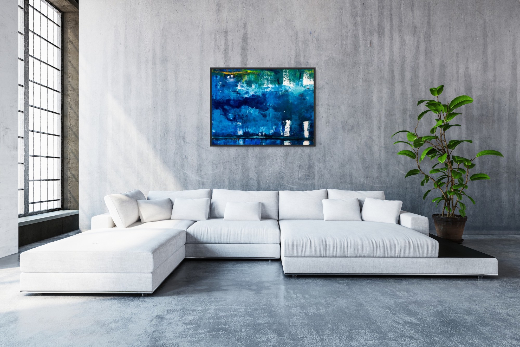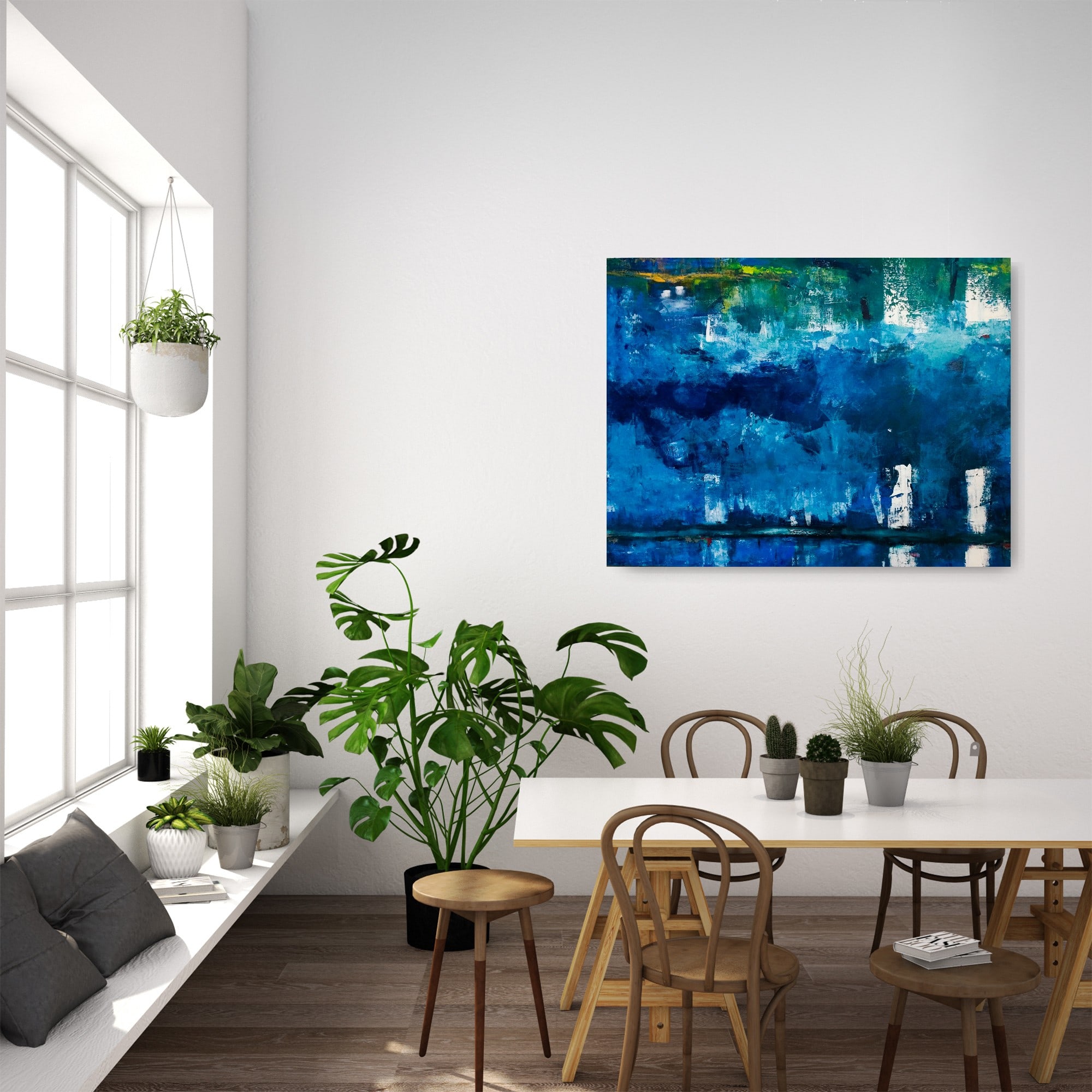 This painting is reflective, like a city's tall buildings casting their shapes onto the water during a moonlit night. The two smaller squares in the upper left corner represent two figures looking out from above or out over the city. The blue colors create a feeling of tranquility.