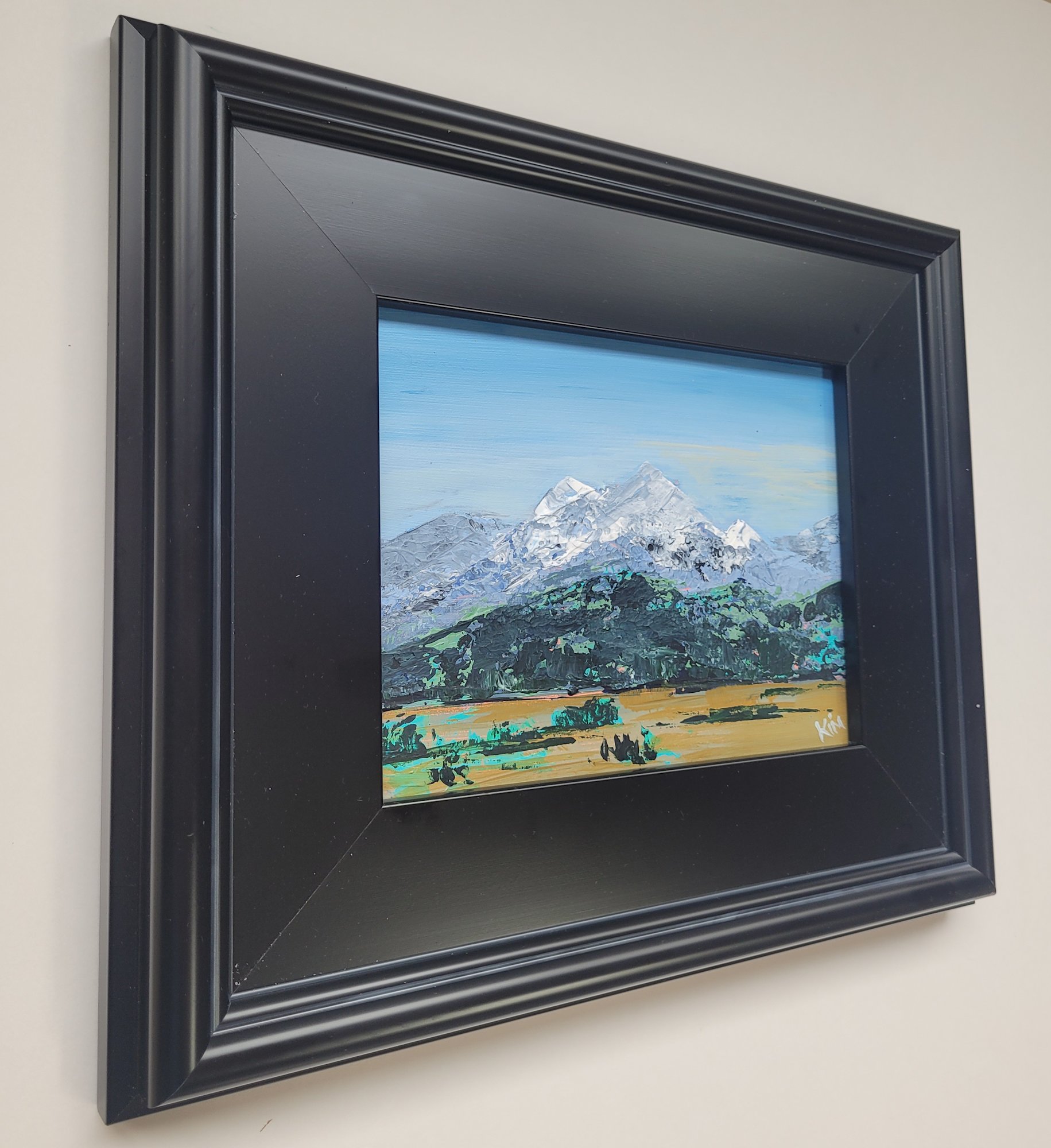 "Vibrancy" is a 6x8 inch acrylic painting that captures the rugged beauty of a high alpine desert landscape. The piece features a vivid mountain range with green forest below creating a sense of energy and life. The foreground is a rich tapestry of earthy hues, suggesting an arid terrain marked by rocks and sparse sagebush vegetation. The combination of texture and color contributes to a vivid and expressive portrayal of the scene, inviting viewers to feel the expanse and solitude of this natural environment.