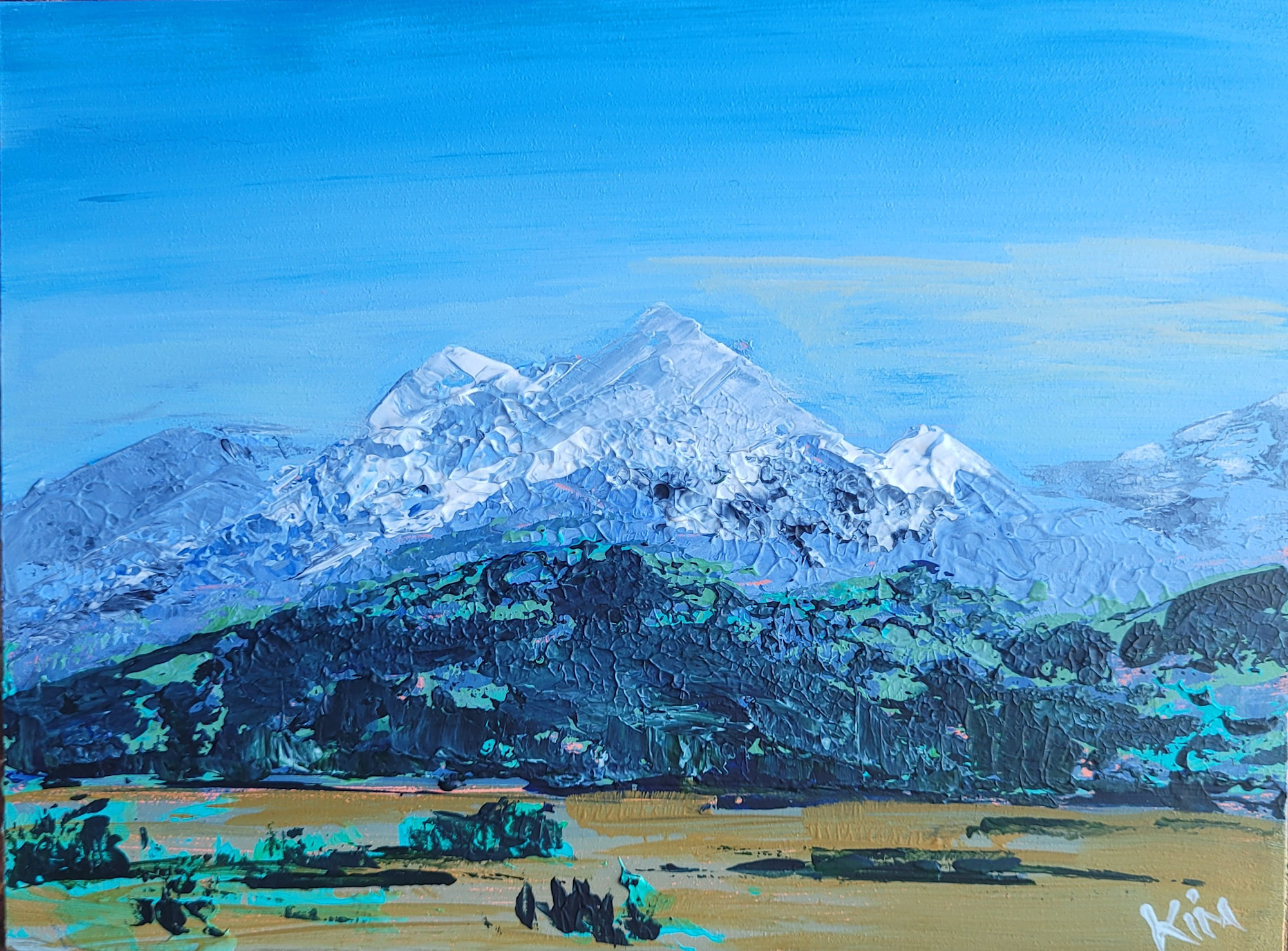The shimmering blues and greens of a bright spring afternoon inspired me to create this piece. The mountain landscape is so variable depending on the time of day. The colors are often so vibrant that they seem to be painted on the landscape itself. While the colors in this piece may seem surreal, my intention is to invite the viewer into an exploration of what is possible when we allow room for the imagination.