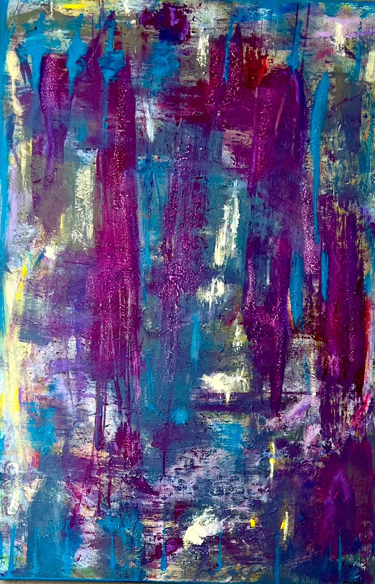 AMETHYST CAVERN - can you imagine going into a cavern and seeing the beautiful amethyst crystals cascading down from the ceiling! 24x36 Acrylic mixed media on canvas.