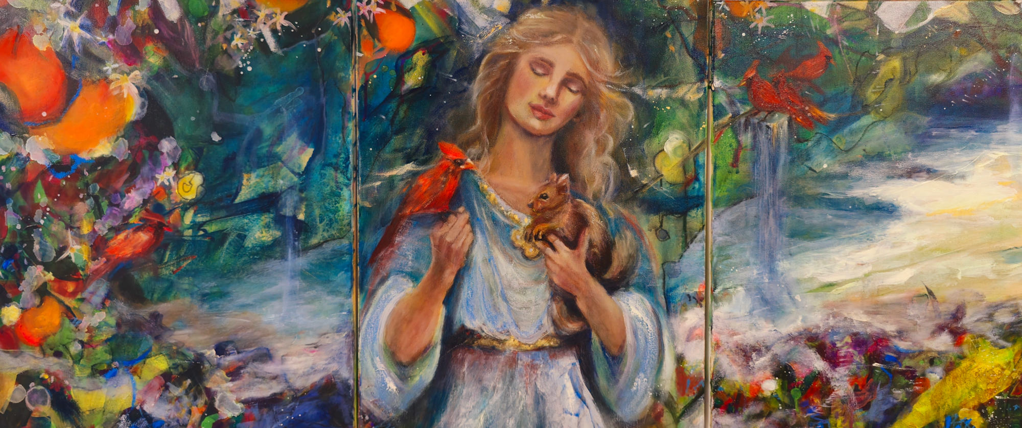 Introducing "Nature's Embrace," a journey where nature offers a peaceful escape. In the heart of this 3 piece composition, a hopeful woman cradles a red bird and a small squirrel, embodying our deep connection with the natural world. This Triptych celebrates the beauty of the coastlines that belong to us all, a reminder of the inclusivity and shared blessings that nature extends to every soul. Creating "Nature's Embrace" was a journey of reflection and gratitude, capturing human and nature's coexistence. May this artwork inspire you to cherish every serene moment and find solace in the gentle embrace of nature