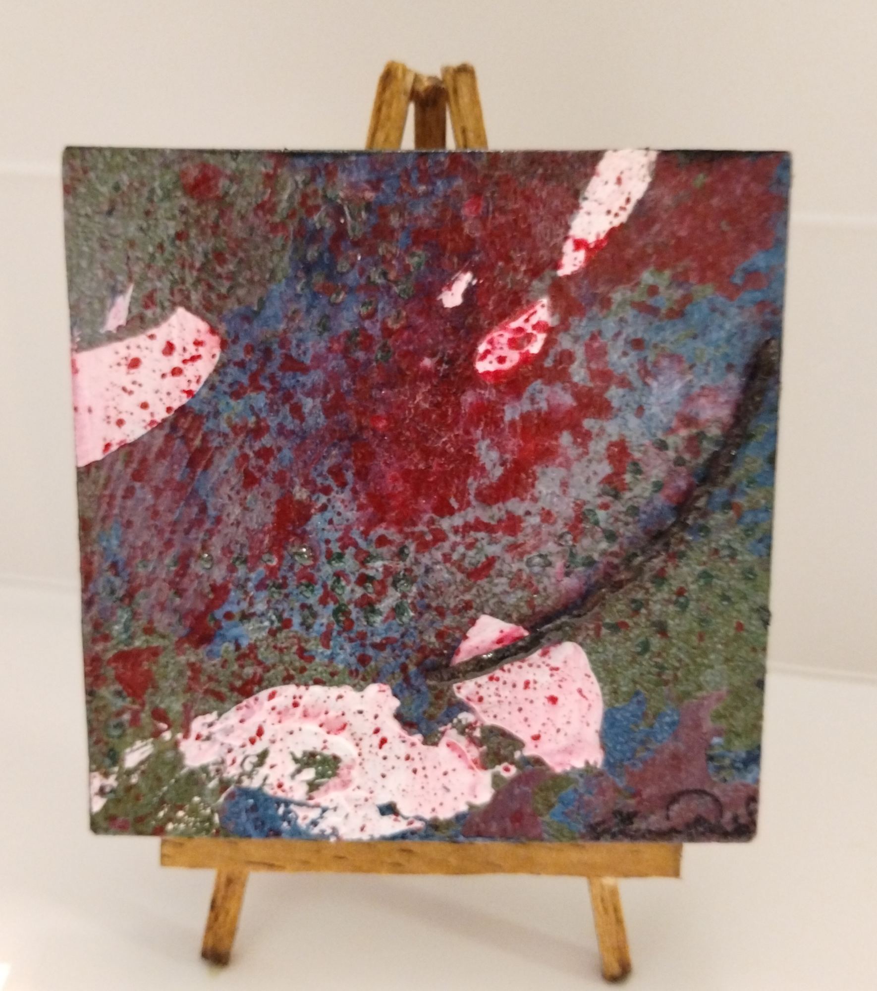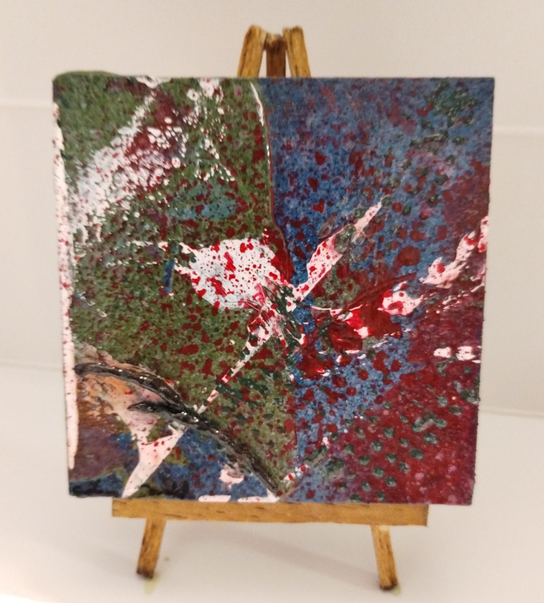 These paintings are inspired by the dreams of a perfect Christmas like in the movies and how it can quickly go wonk-a-doo real quick. Nerves frazzled, children sugared up, Family being family can make chaos out of your Rockwell Christmas dreams. I hope these paintings bring a giggle or smile to your face as the memories of past family gatherings come to mind. The metal incorporated into the painting comes from a nearby mountain that used to be a granite quarry. The mountain gives a little more man made materials back each time we have a big Georgia rain. Kimmy ;D