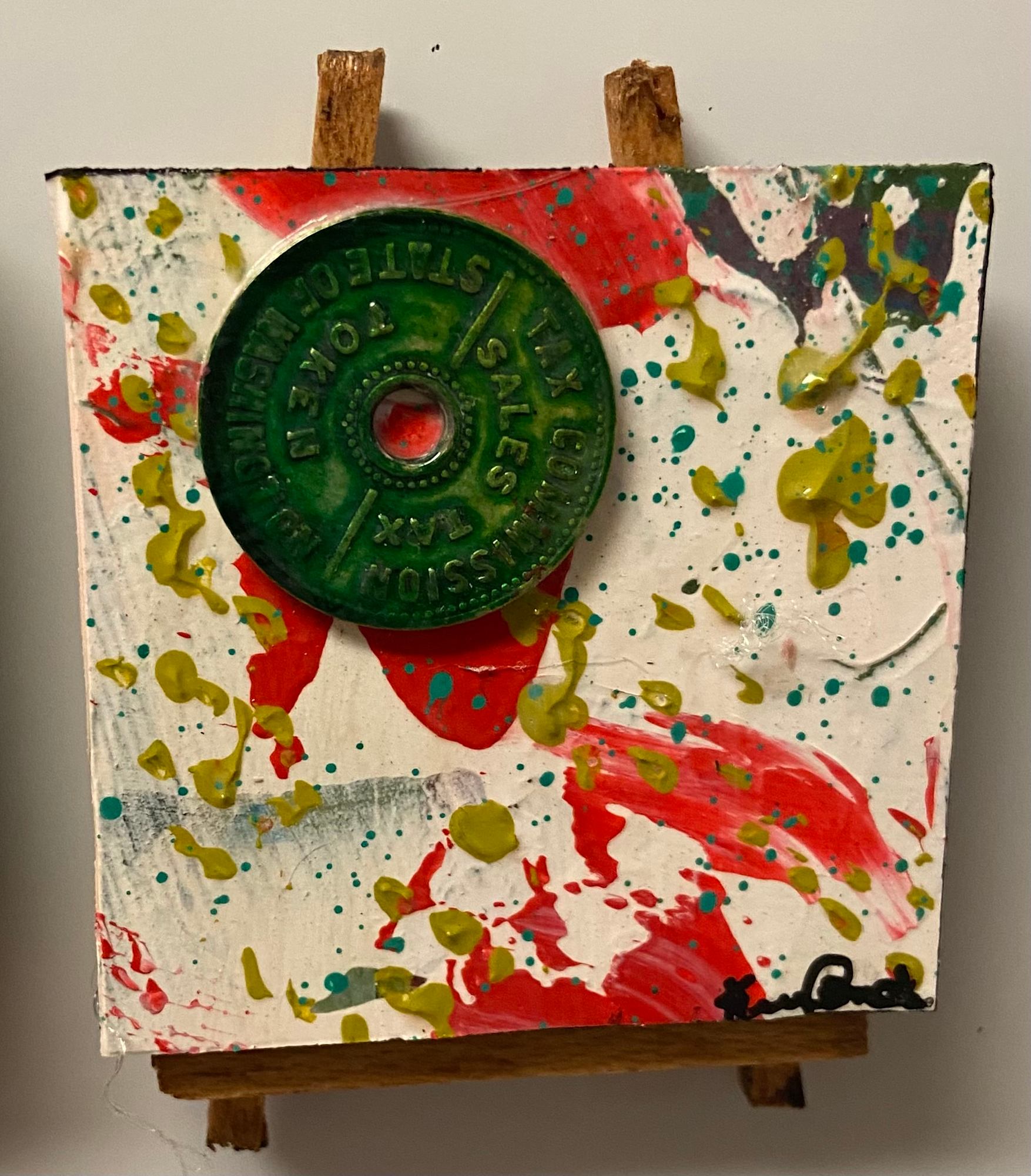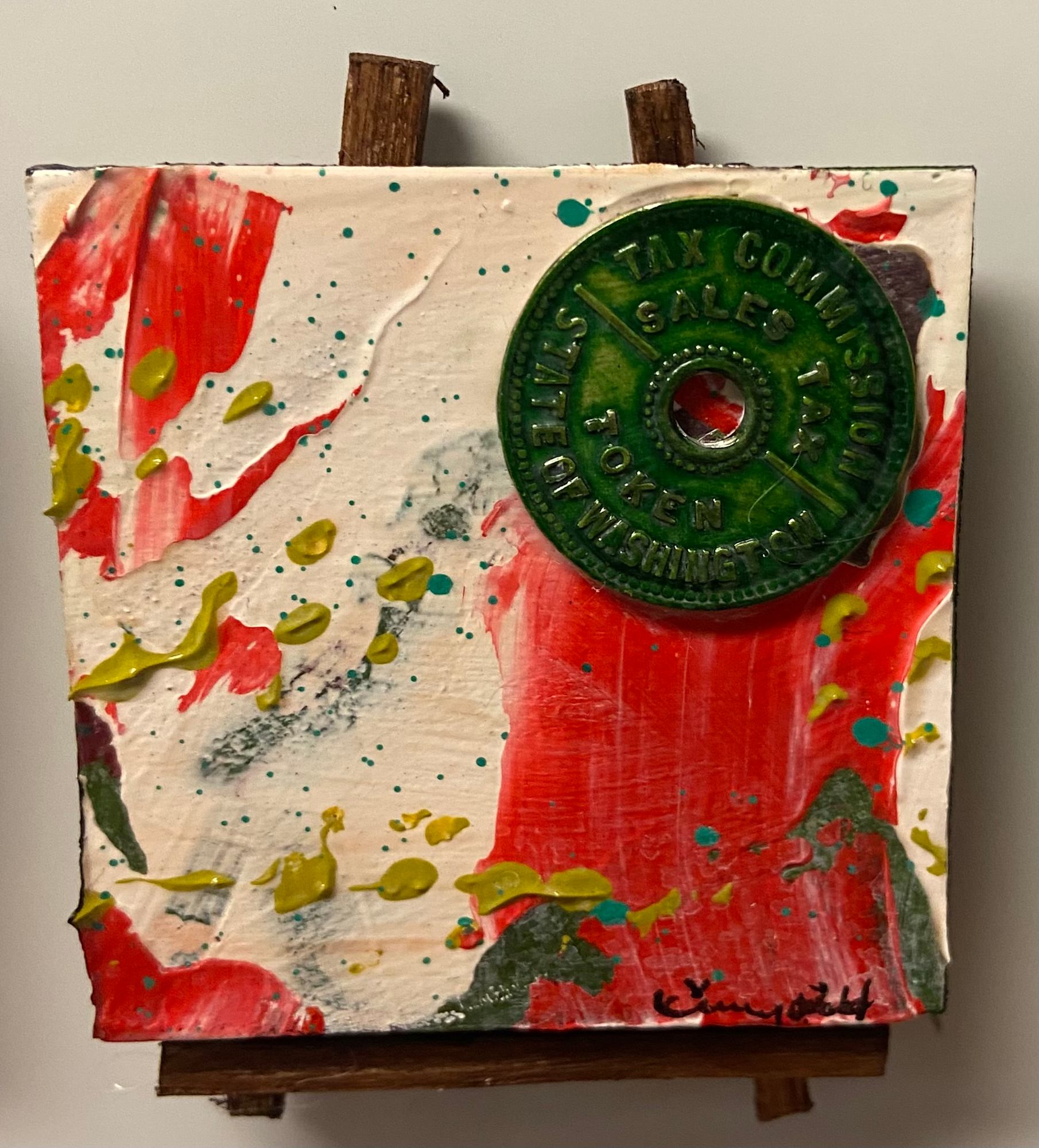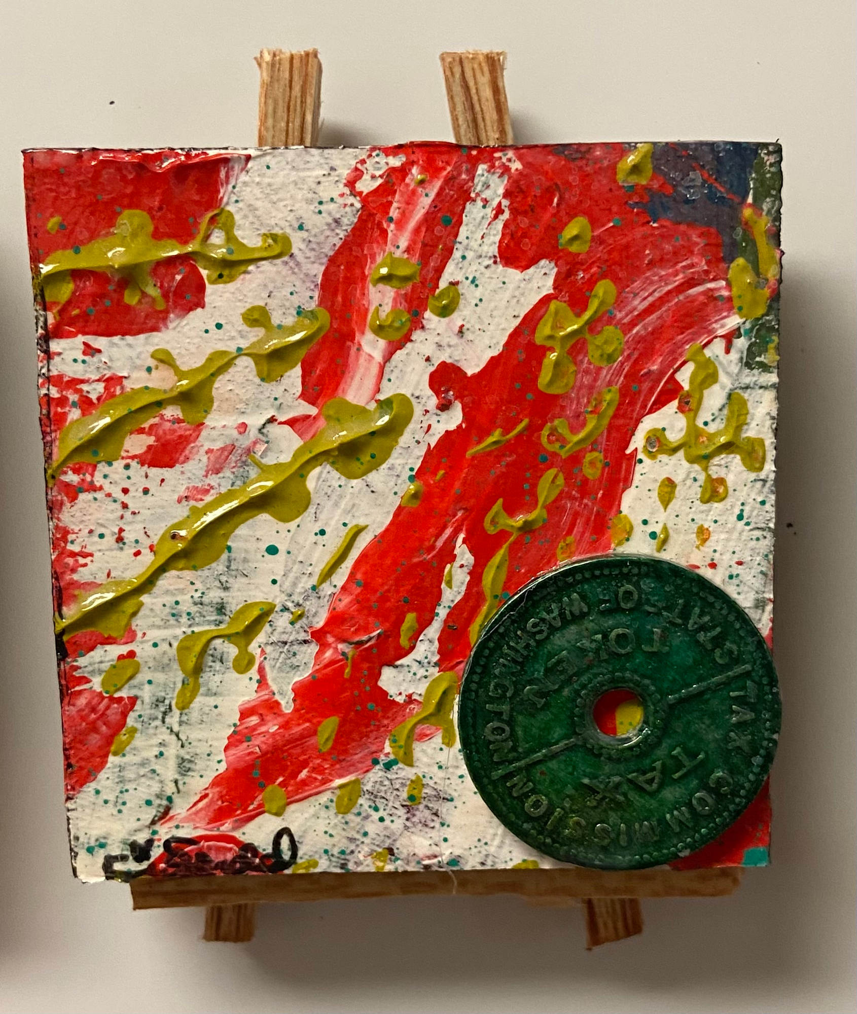 Layers of acrylic paint. Attached is an aluminum antique tax token from Washington state. Possibly from WWII. Painted in alcohol inks. Added Easel & Magnet