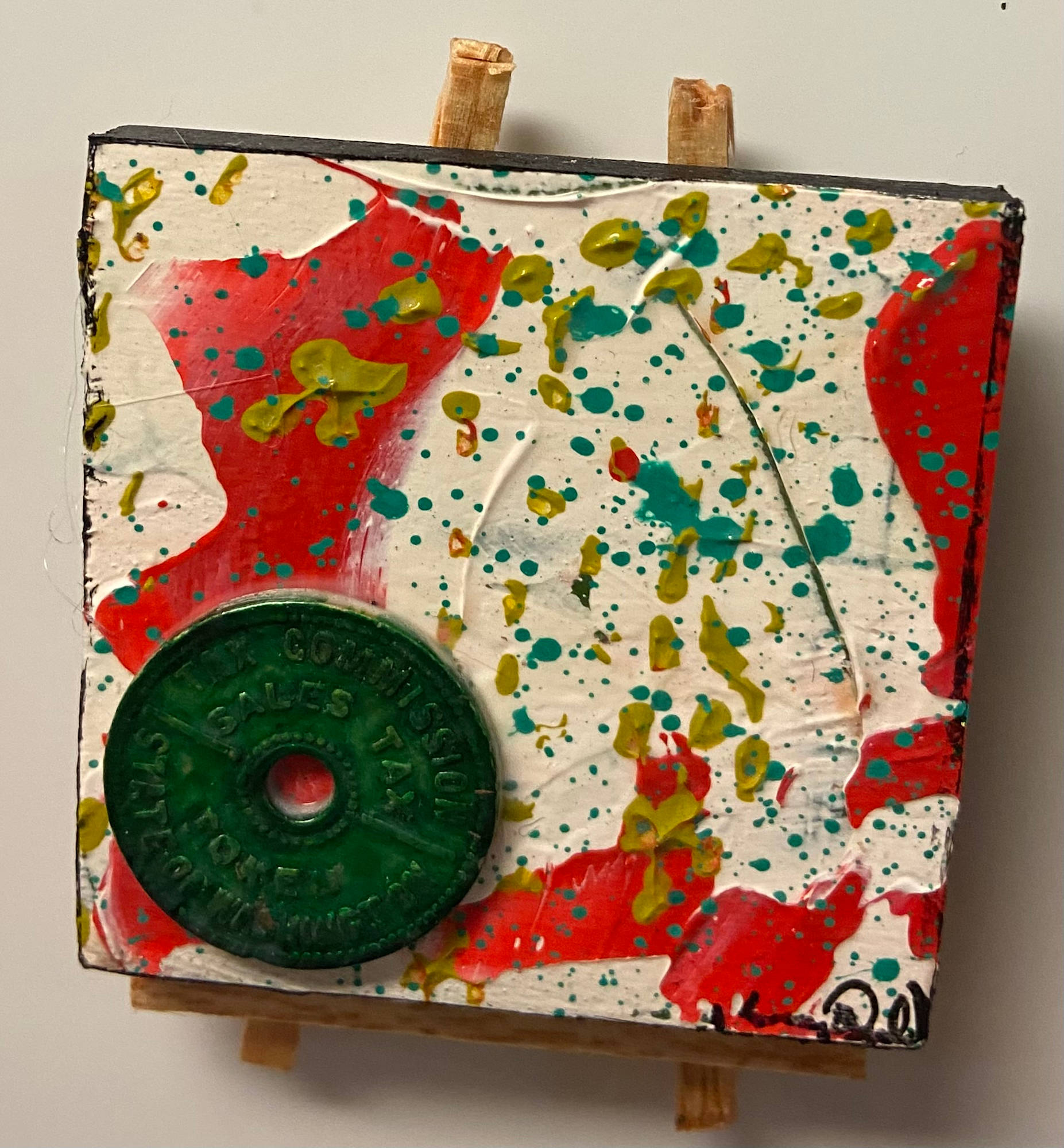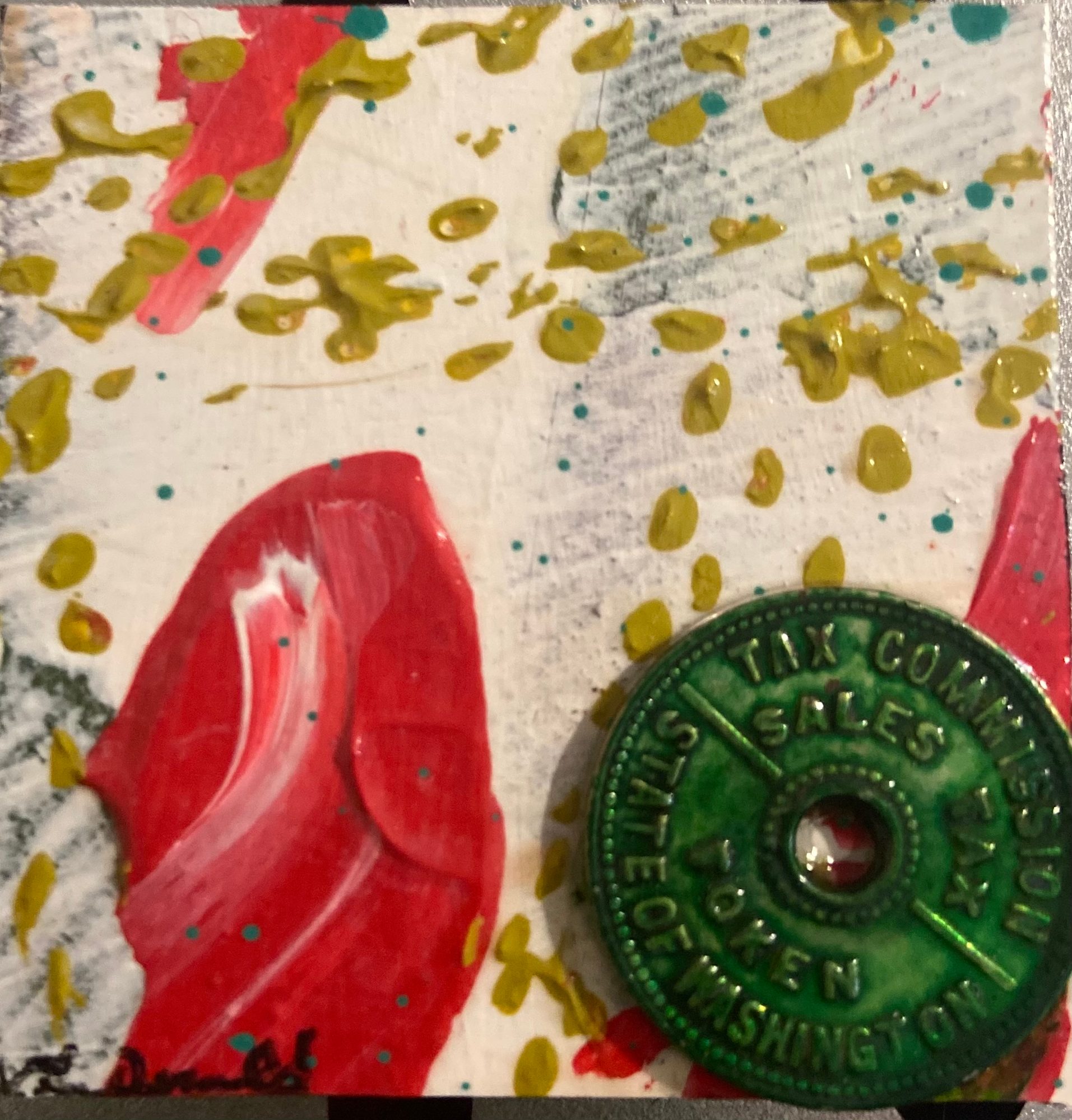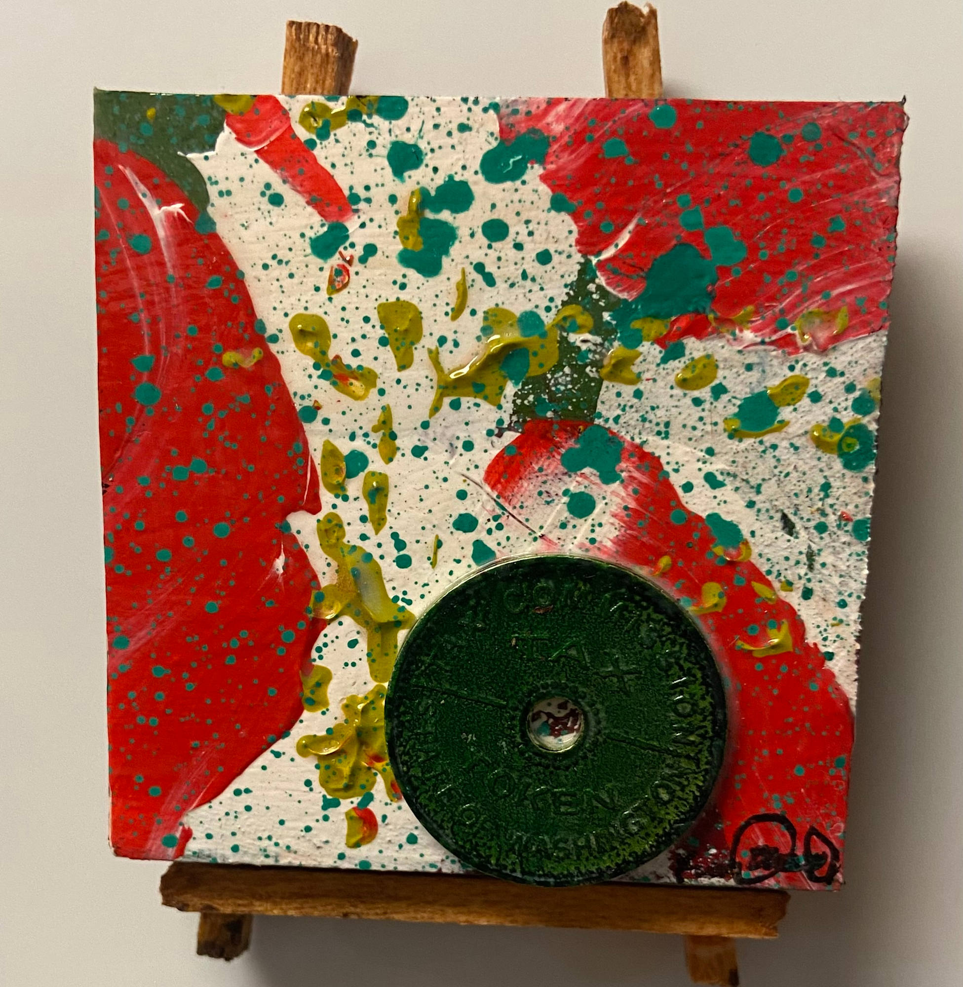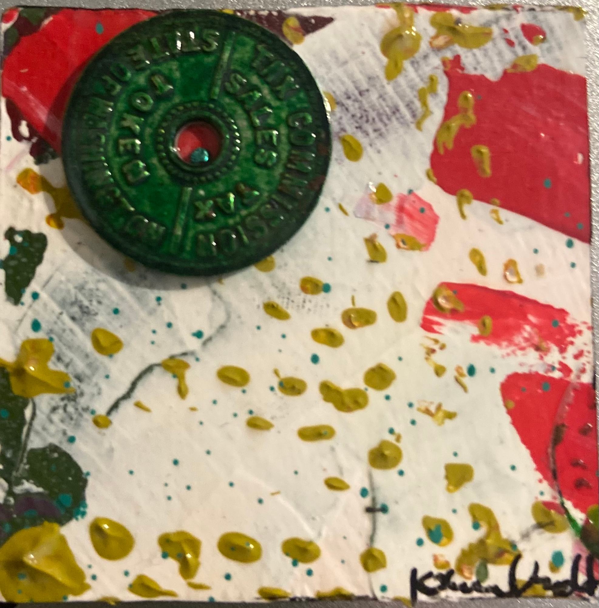 Layers of acrylic paint. Attached is an aluminum antique tax token from Washington state. Possibly from WWII. Painted in alcohol inks. Added Easel & Magnet