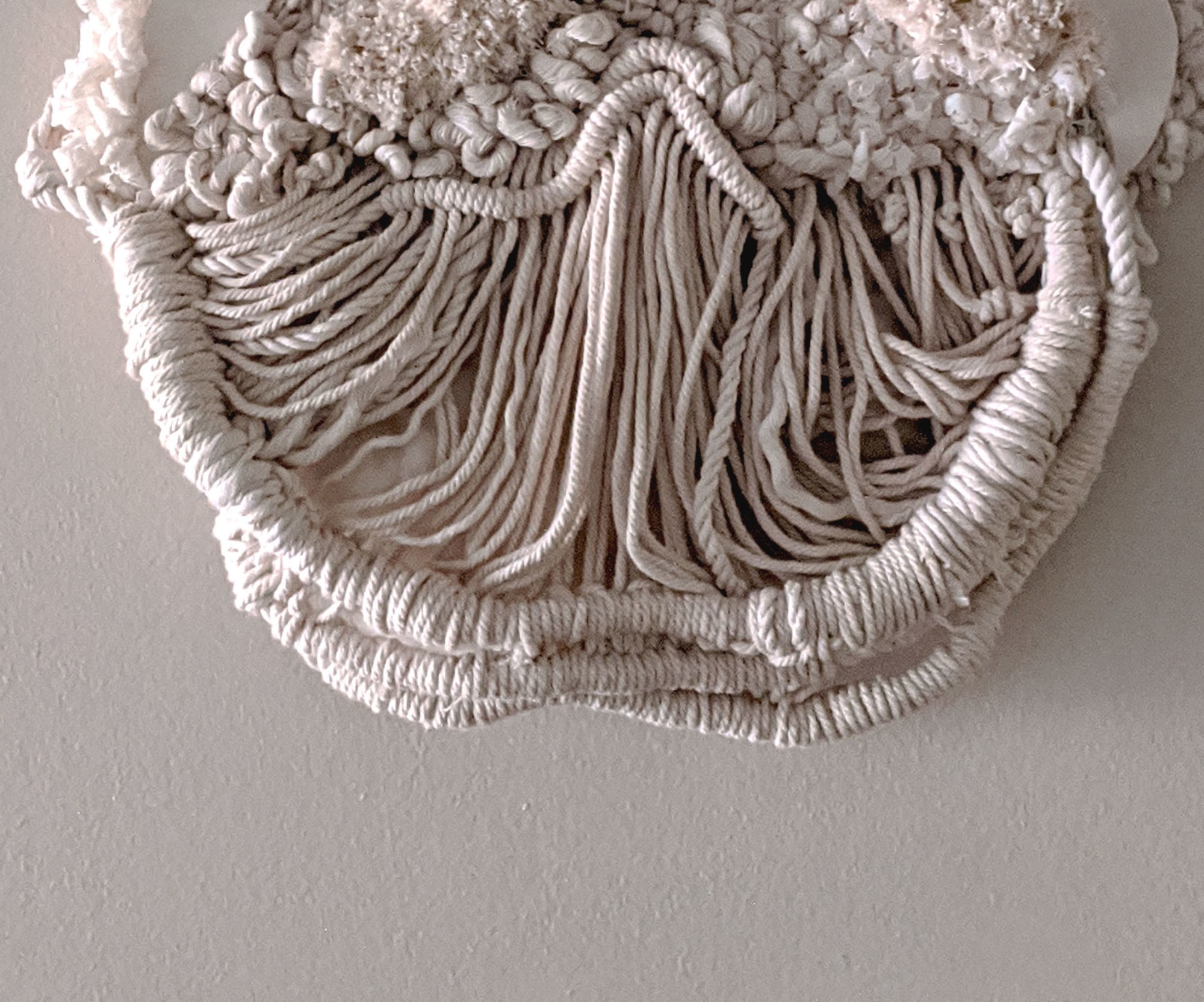 After Party (postpartum in Real life) captures a unique moment in my journey. A self portrait of my changed skin—porcelain shapes held together by fiber mimicking the texture and patterns of my stretch marks. I use ‘ordinary’ clay, cotton yarn, weaving needles, and latch hooks to pay homage to the generations of mothers who have gone before me and used these materials to create beautiful, expressive, and essential items for their children. The everydayness of these materials highlights the value in the taken for granted, common parts of our life’s stories.