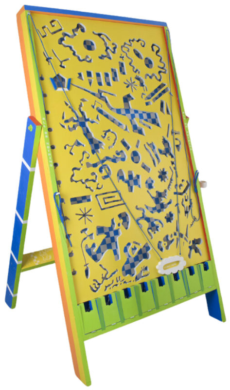 Pine wood, paint, chains, rope, and metal ball