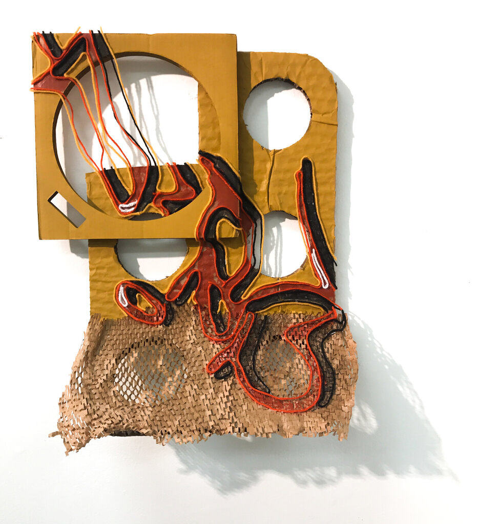 Acrylic, cardboard, charcoal, paper, wood, and yarn