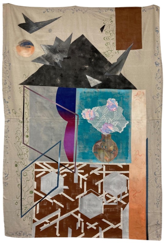 Natural dye, fabric dye, acrylic, spray paint, and fabric collage on raw canvas