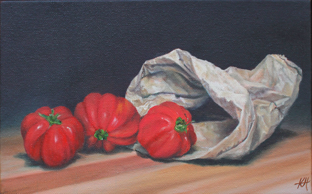 Heirloom Tomatoes by Kirsten Hocking  Image: "Heirloom Tomatoes", original painting by Kirsten Hocking, oil on canvas, 17.5cm x 28cm (framed)