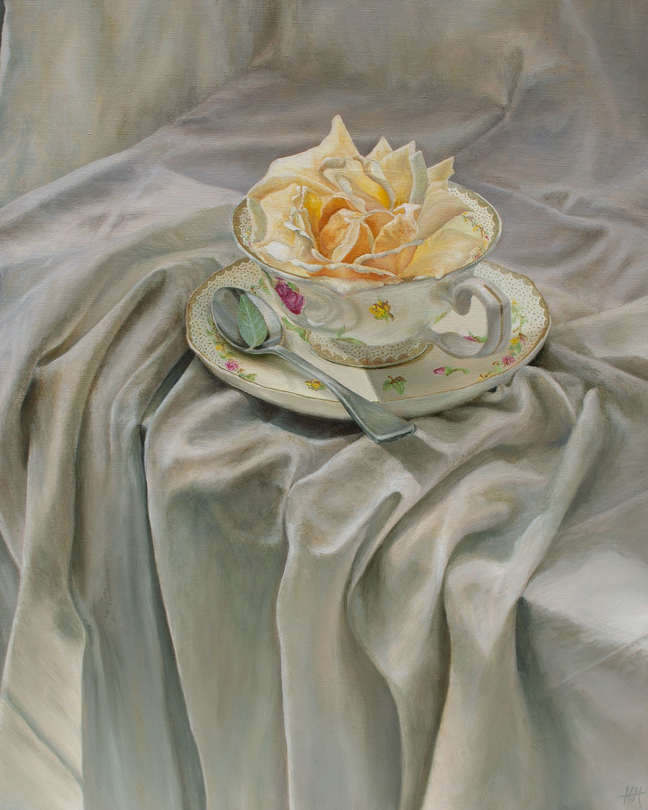 Teacup with Yellow Rose by Kirsten Hocking  Image: "Teacup with Yellow Rose", original painting by Kirsten Hocking, oil on linen, 50cm x 40cm, 2022