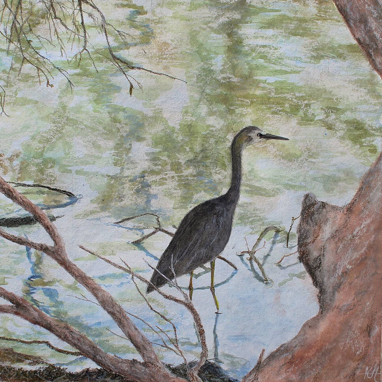 White Faced Heron by the Lakeside III by Kirsten Hocking  Image: "White Faced Heron by the Lakeside III", original painting by Kirsten Hocking, mixed media on cotton paper, 25cm x 25cm (unframed), 2024