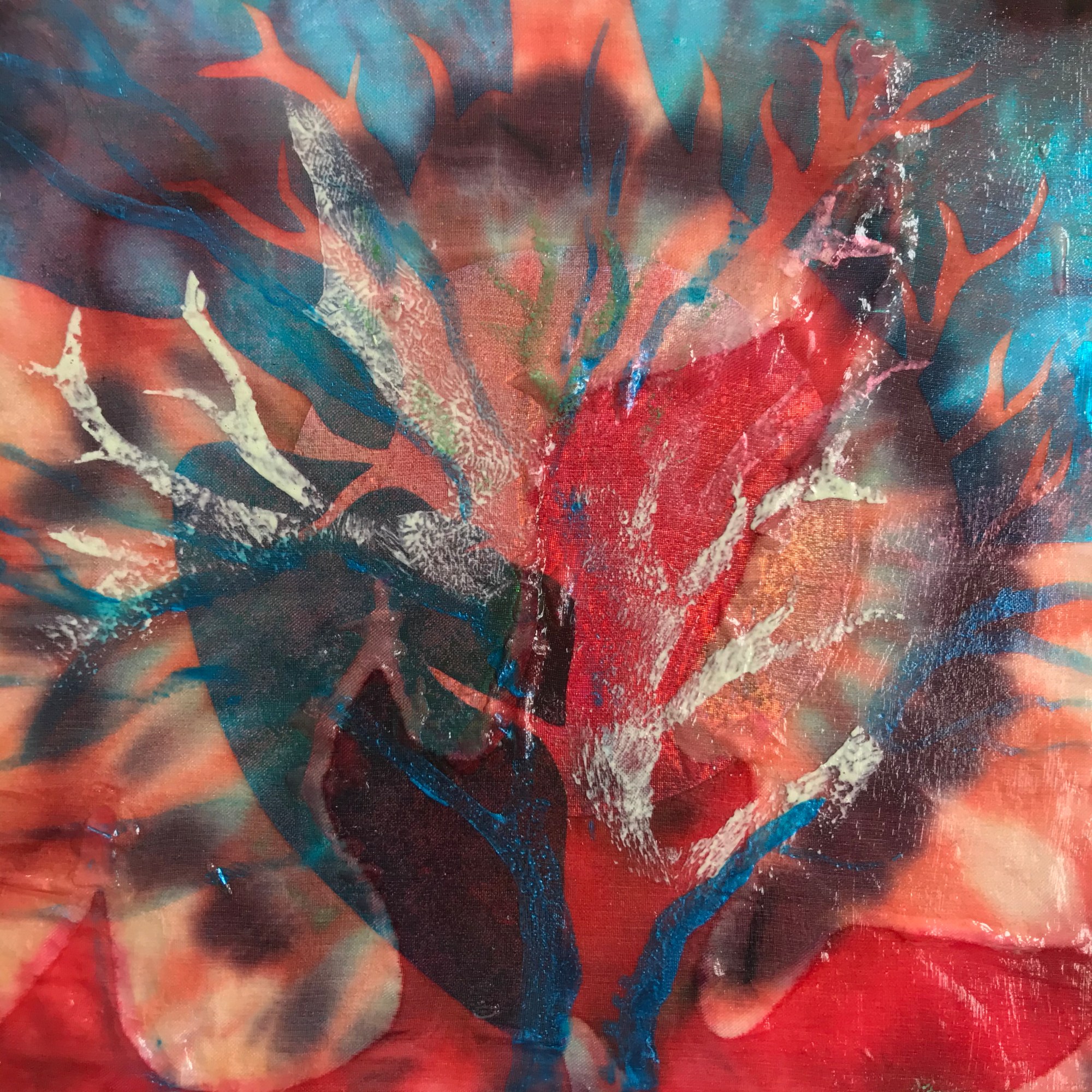 Birch base, holographic collage, protein dyed silk, painted and stenciled.