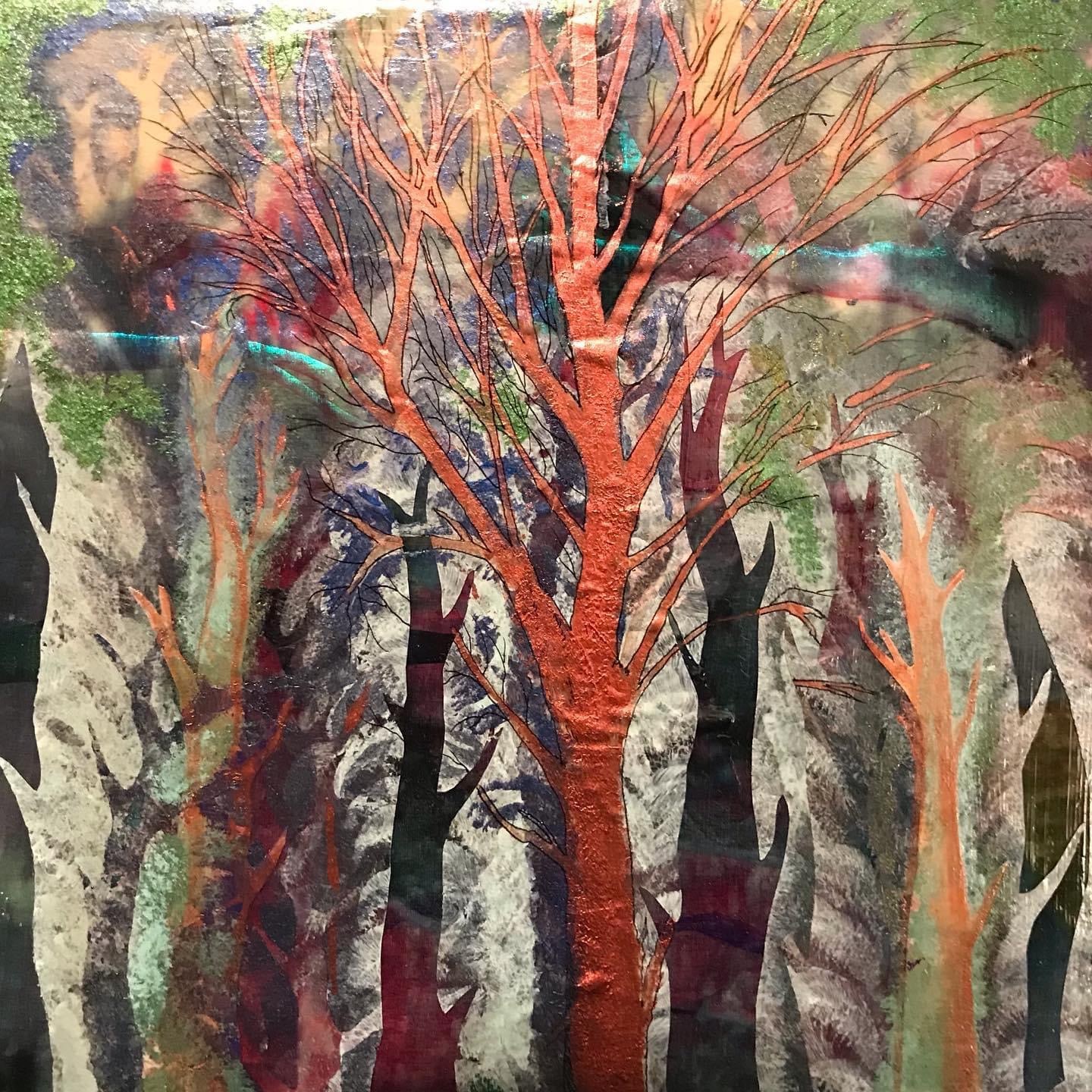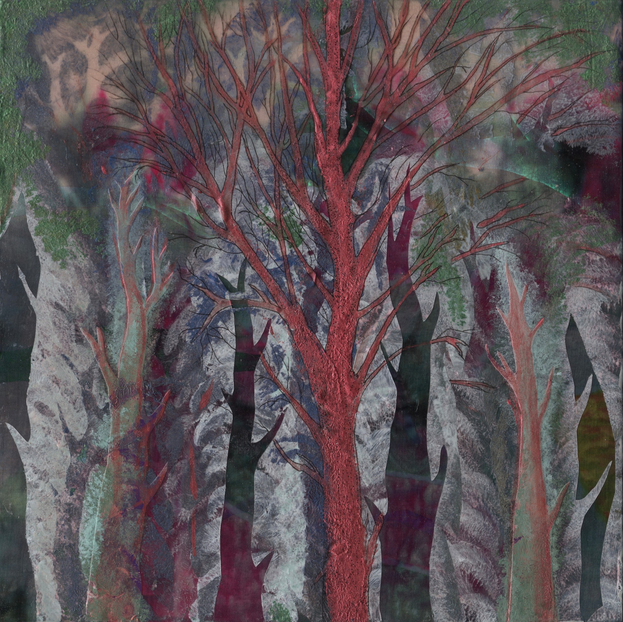 Woods painted and stencilled upon collaged trees, drawn and printed, colorist, each layer worked in acrylic medium on wood with a silk base.