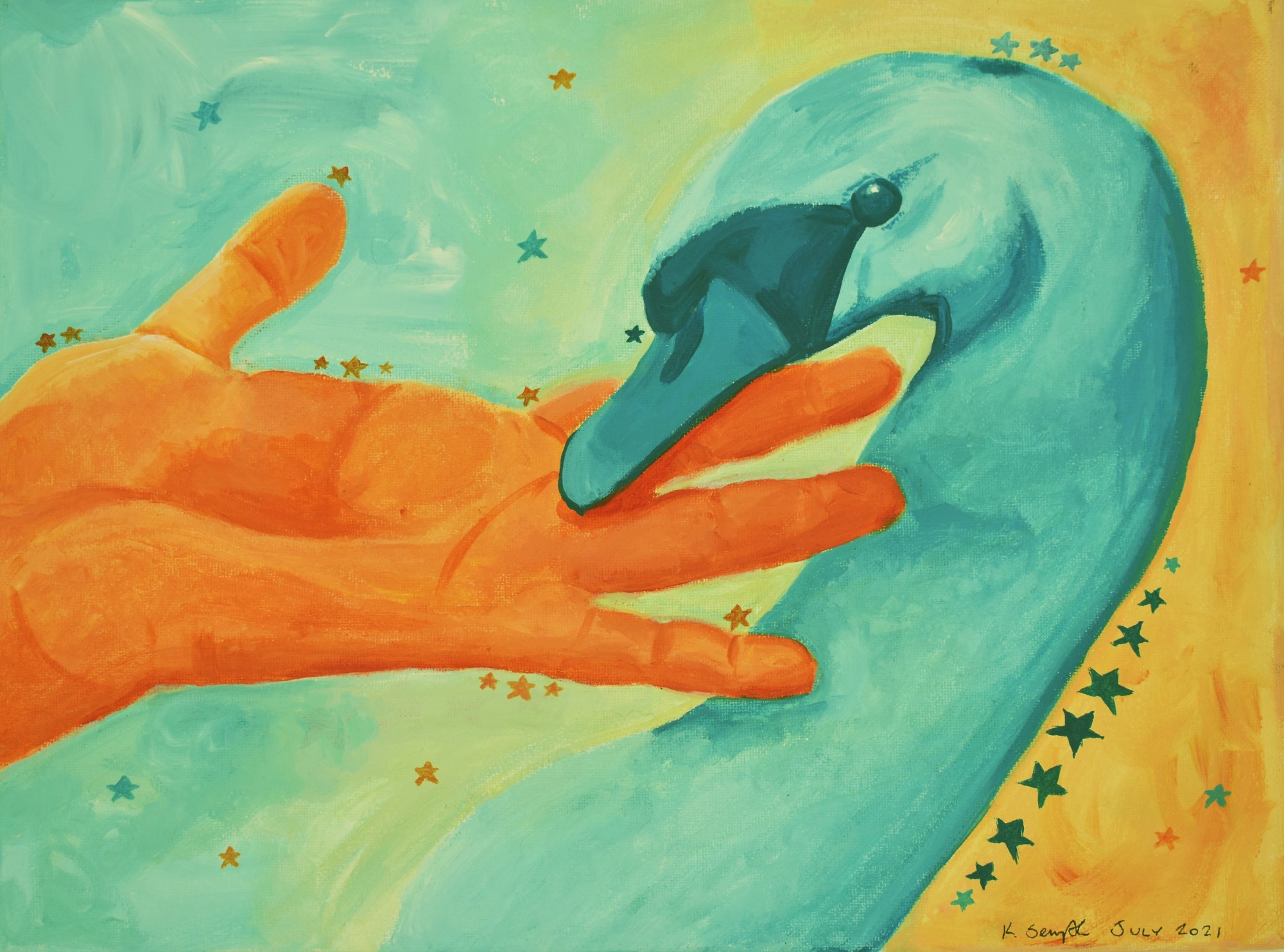 This artwork is inspired by learning to trust again after being hurt. The swan is tentative but the hand is gentle and patient. This can also show how we learn to trust when starting a new relationship. It is inspired by the expressionist style to capture the emotion of this.
