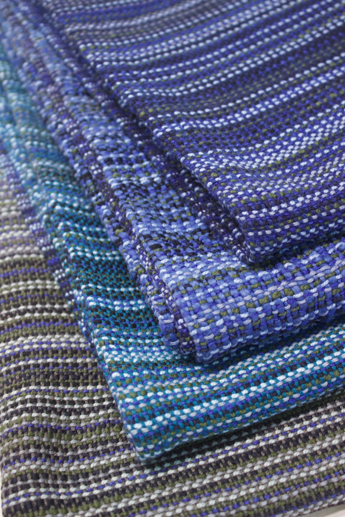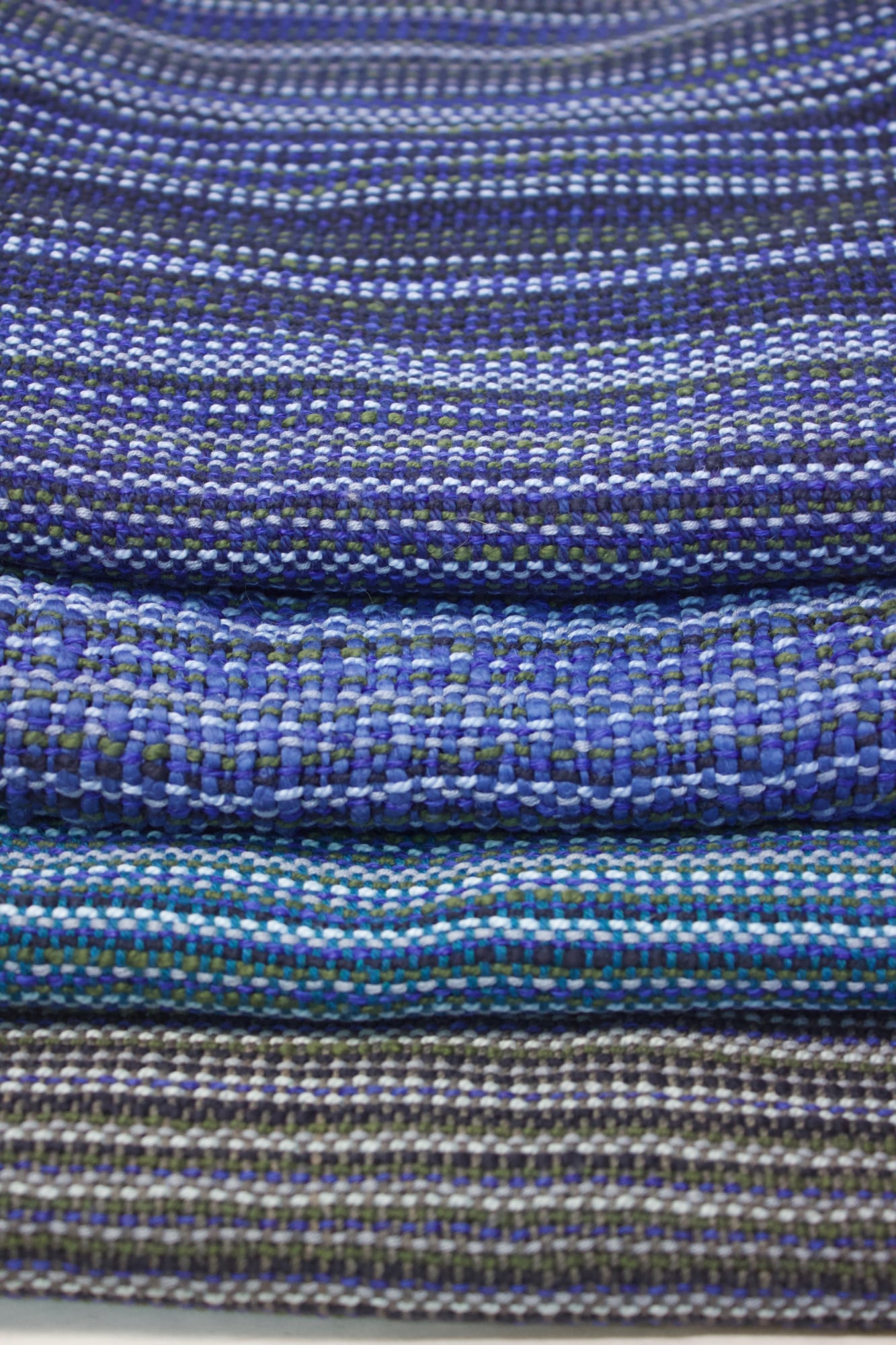 Baby blanket made from cotton in blue, grey and black warp and blue weft.