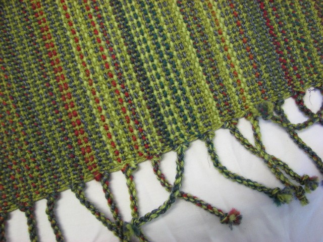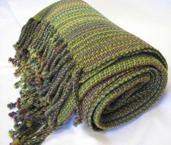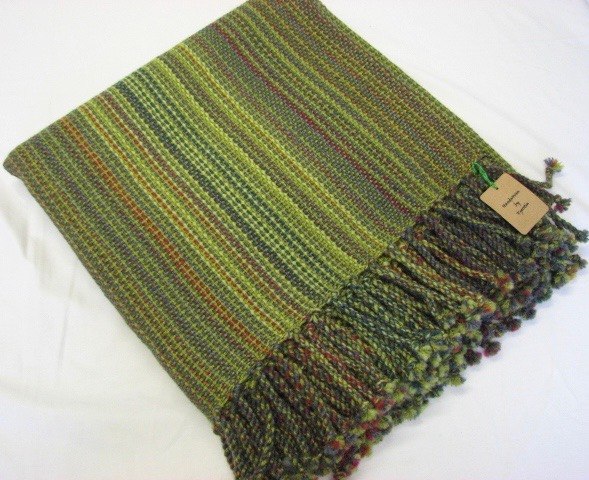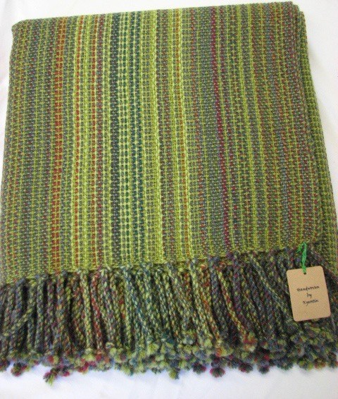 Handwoven blanket in australian wool in multi coloured warp and green weft. Double weave in plain pattern.