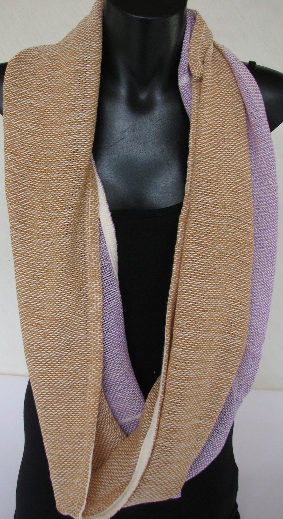 Cowl made from white cotton warp with purple and beige silk weft.