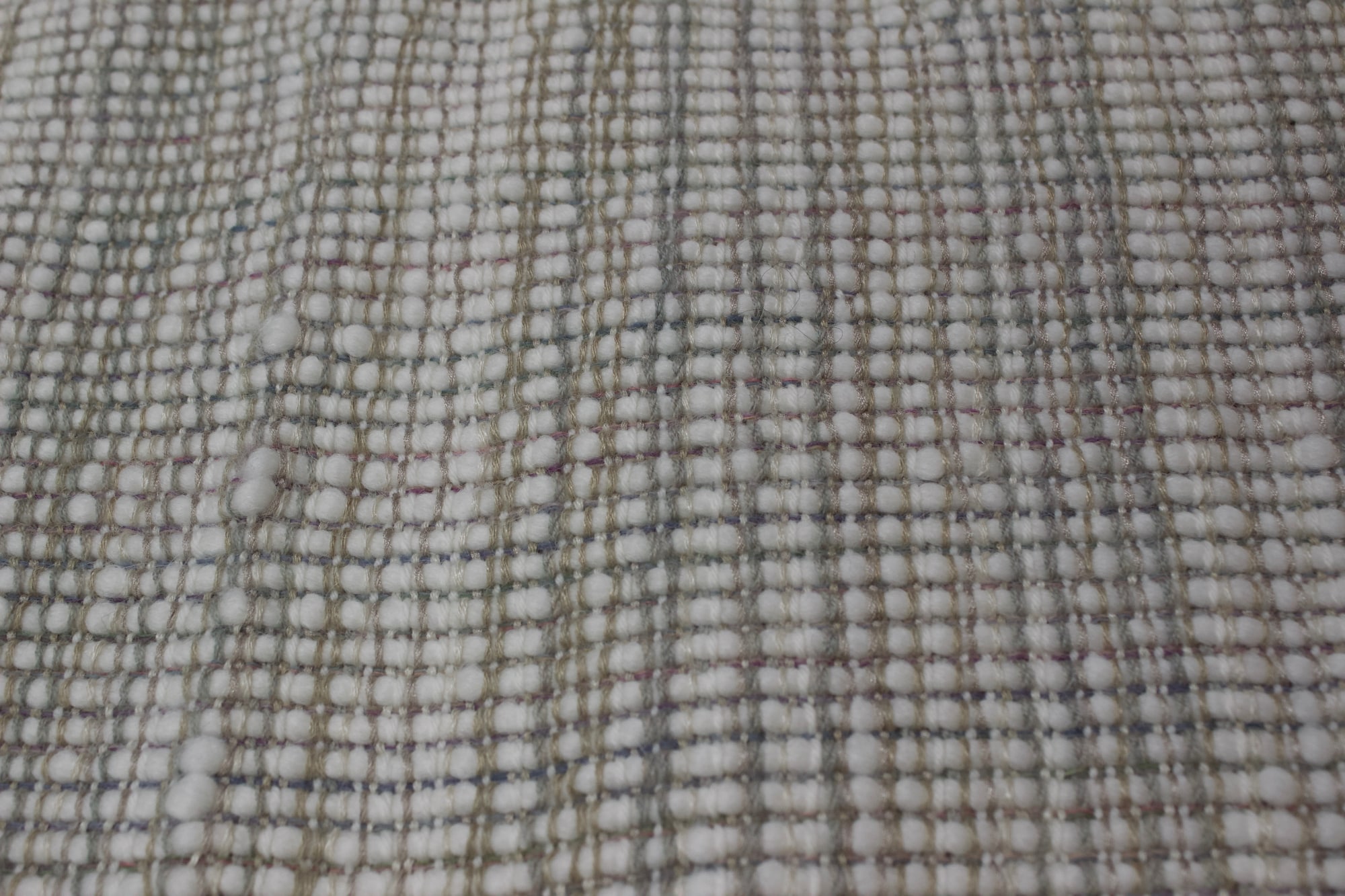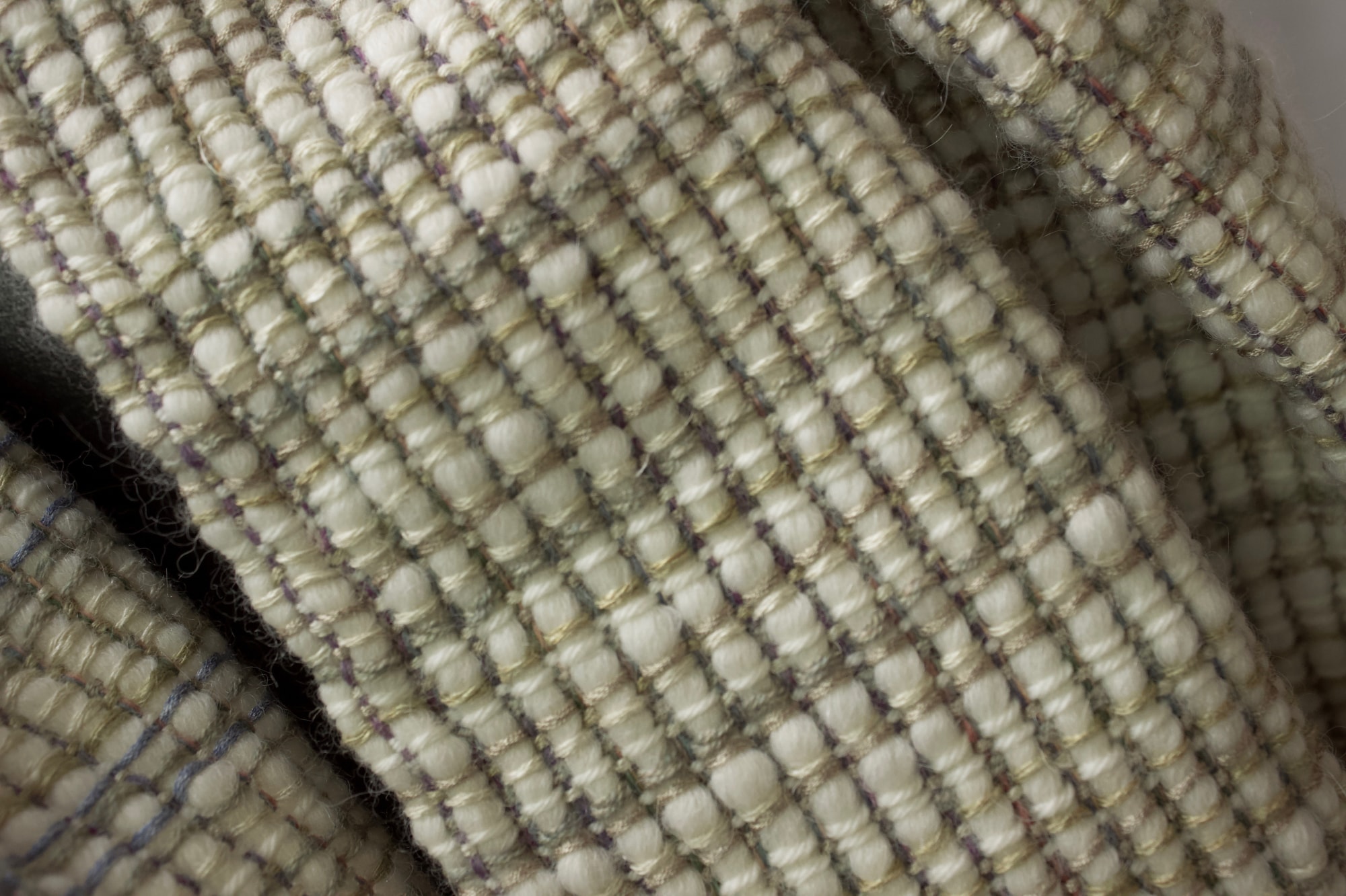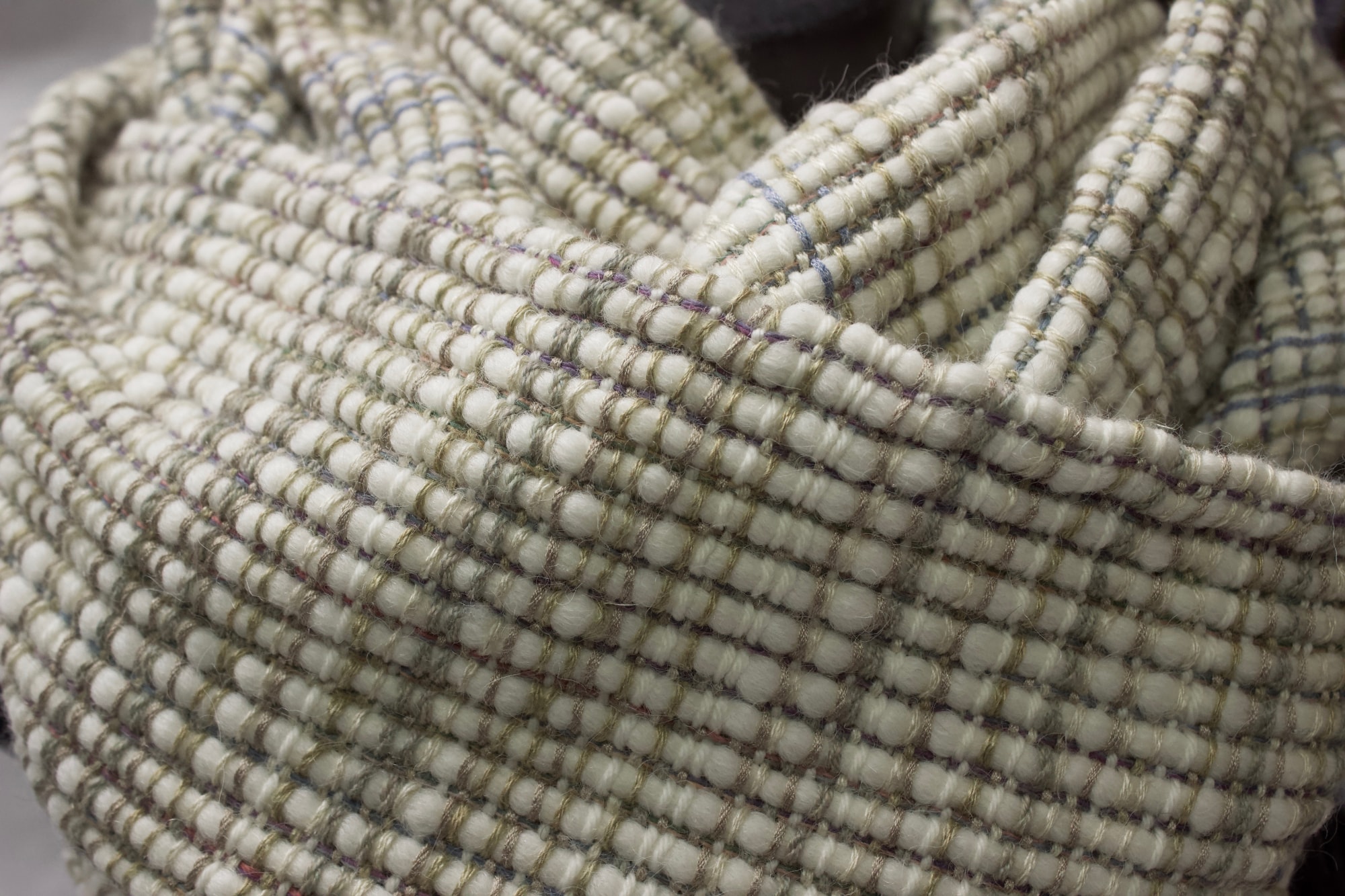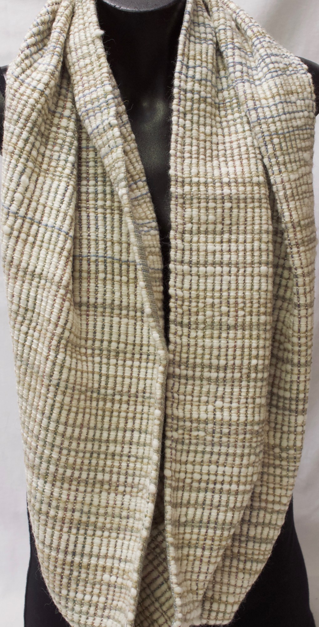 Cowl made from white, beige, grey and blue wool, silk and linen warp, with a white wool and alpaca weft.