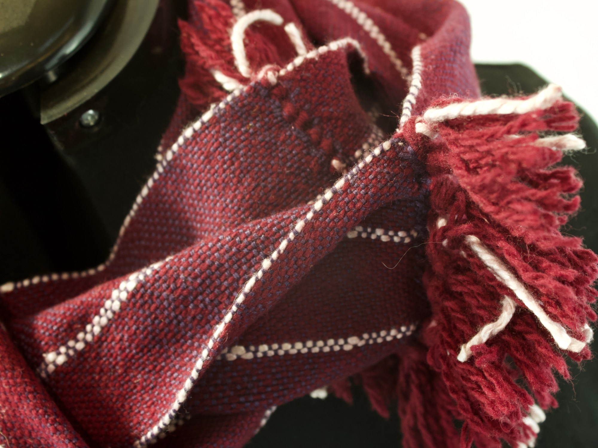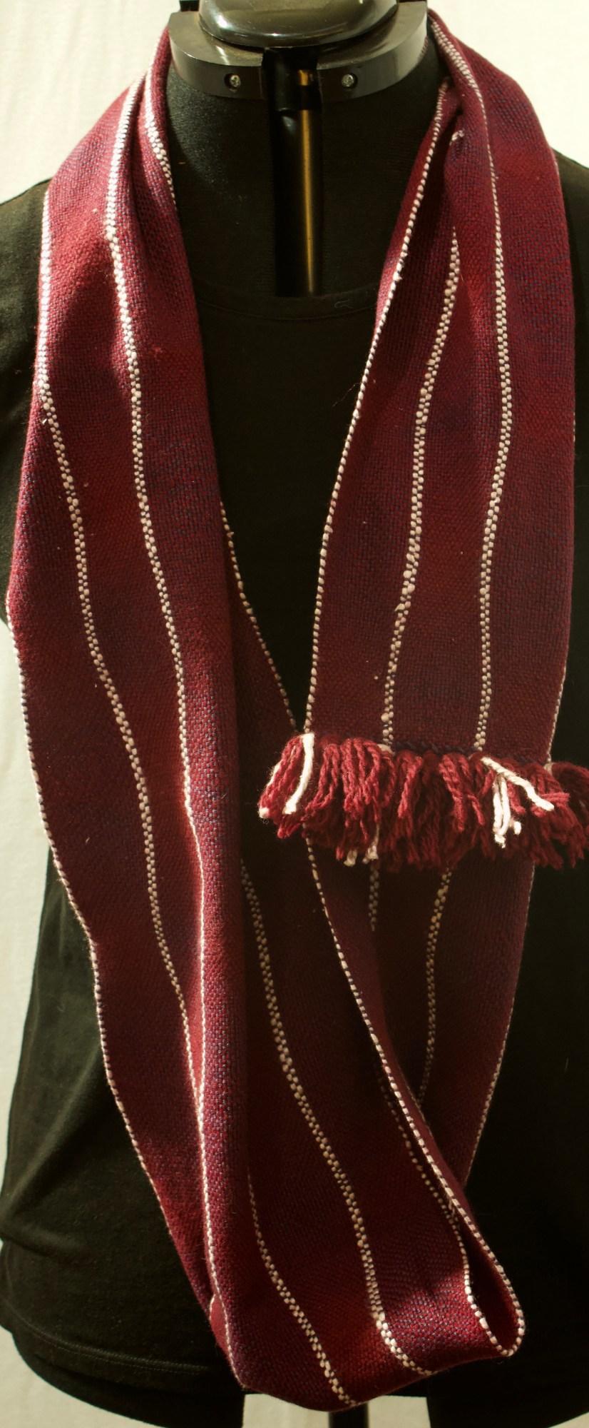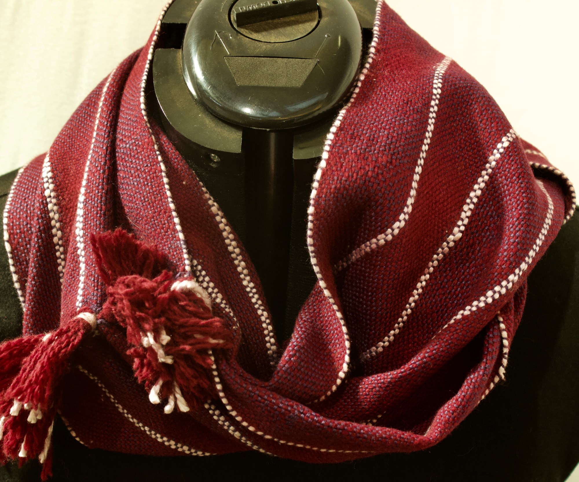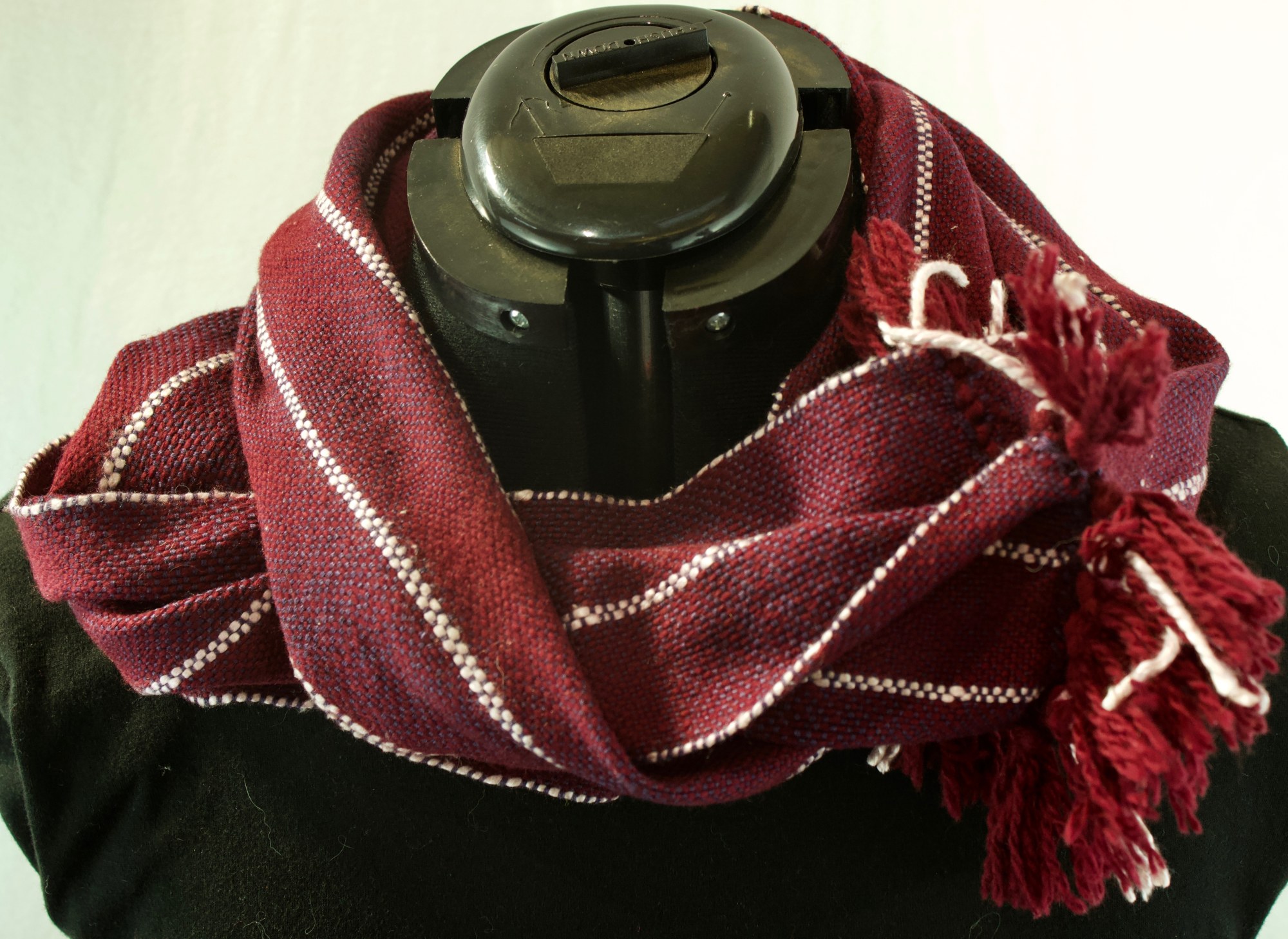 Cowl made from purple cashmere/merino and pink silk. Plain weave , using a fan-reed.