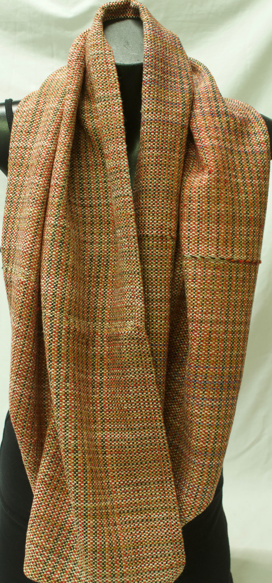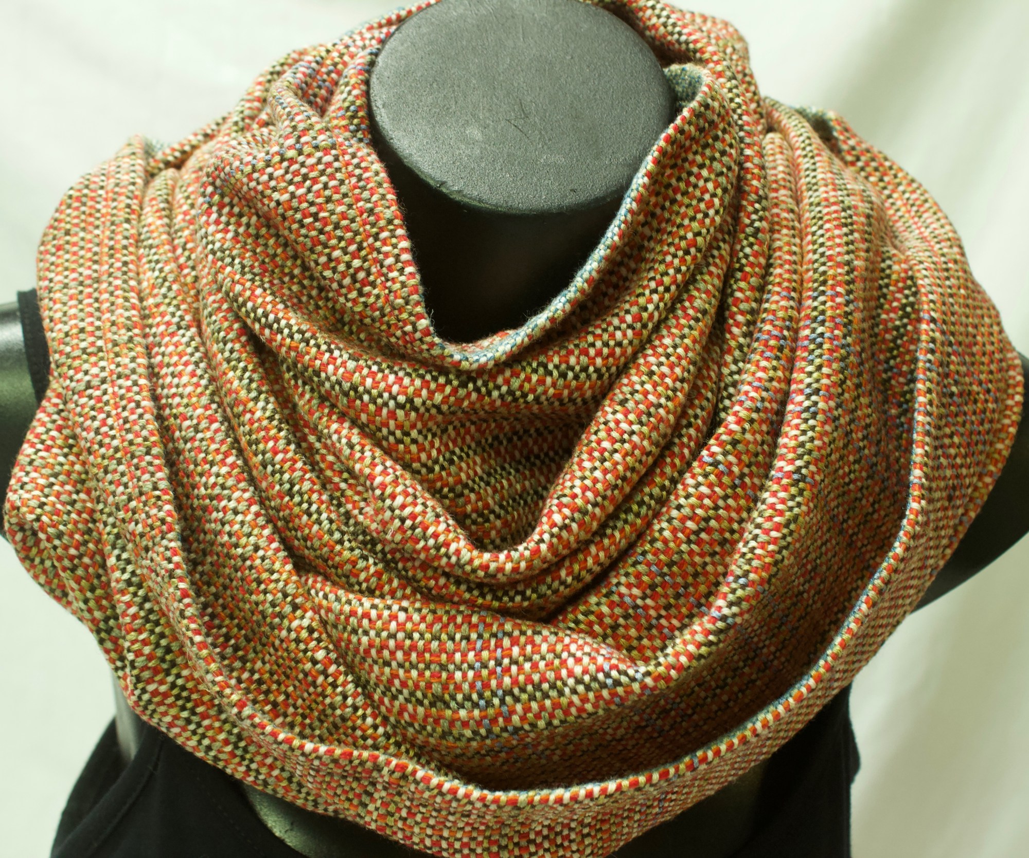 Cowl made from white, beige, grey and blue wool, silk and linen warp, with a multicoloured wool weft.