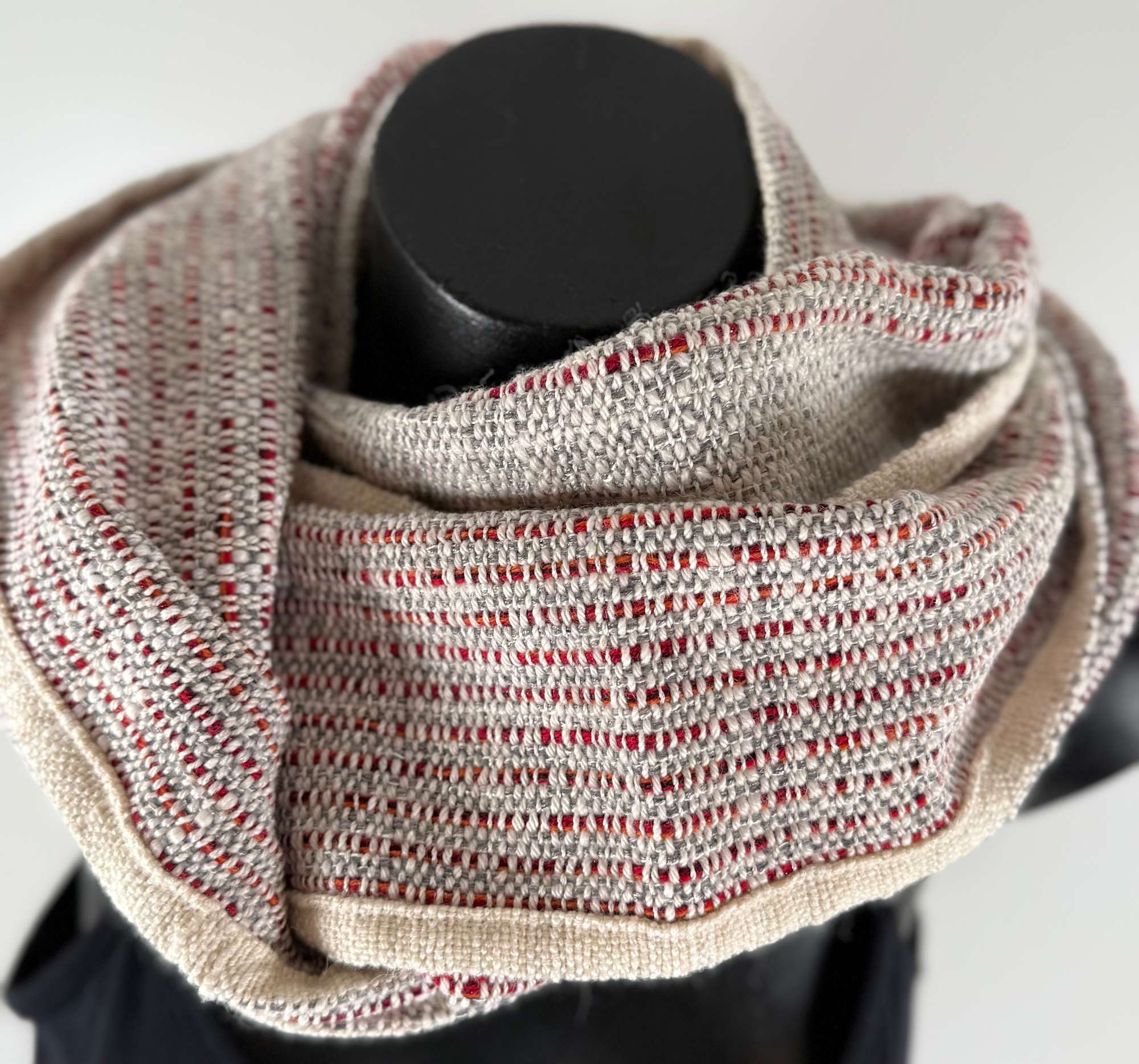 White warp and red and grey weft.