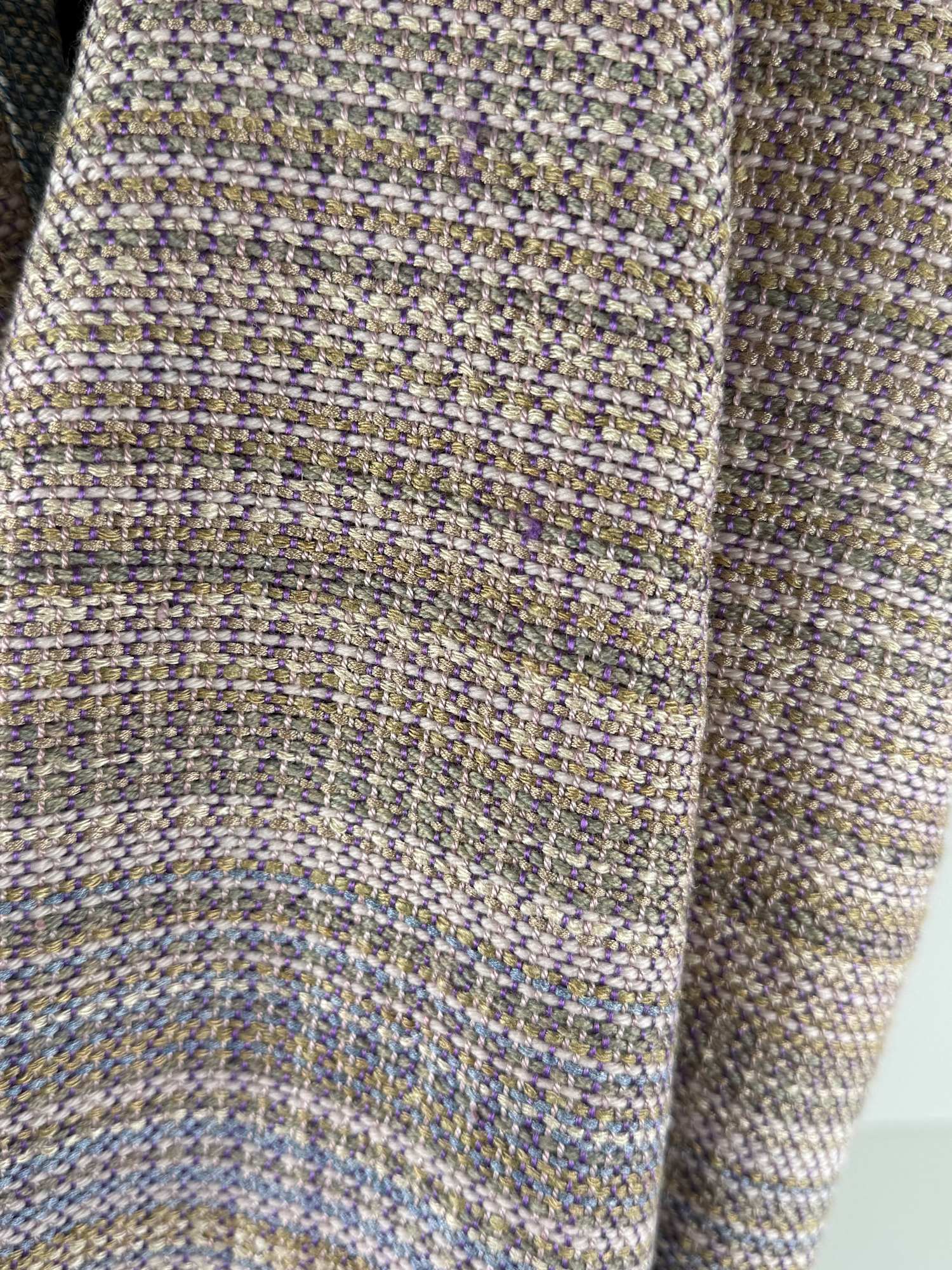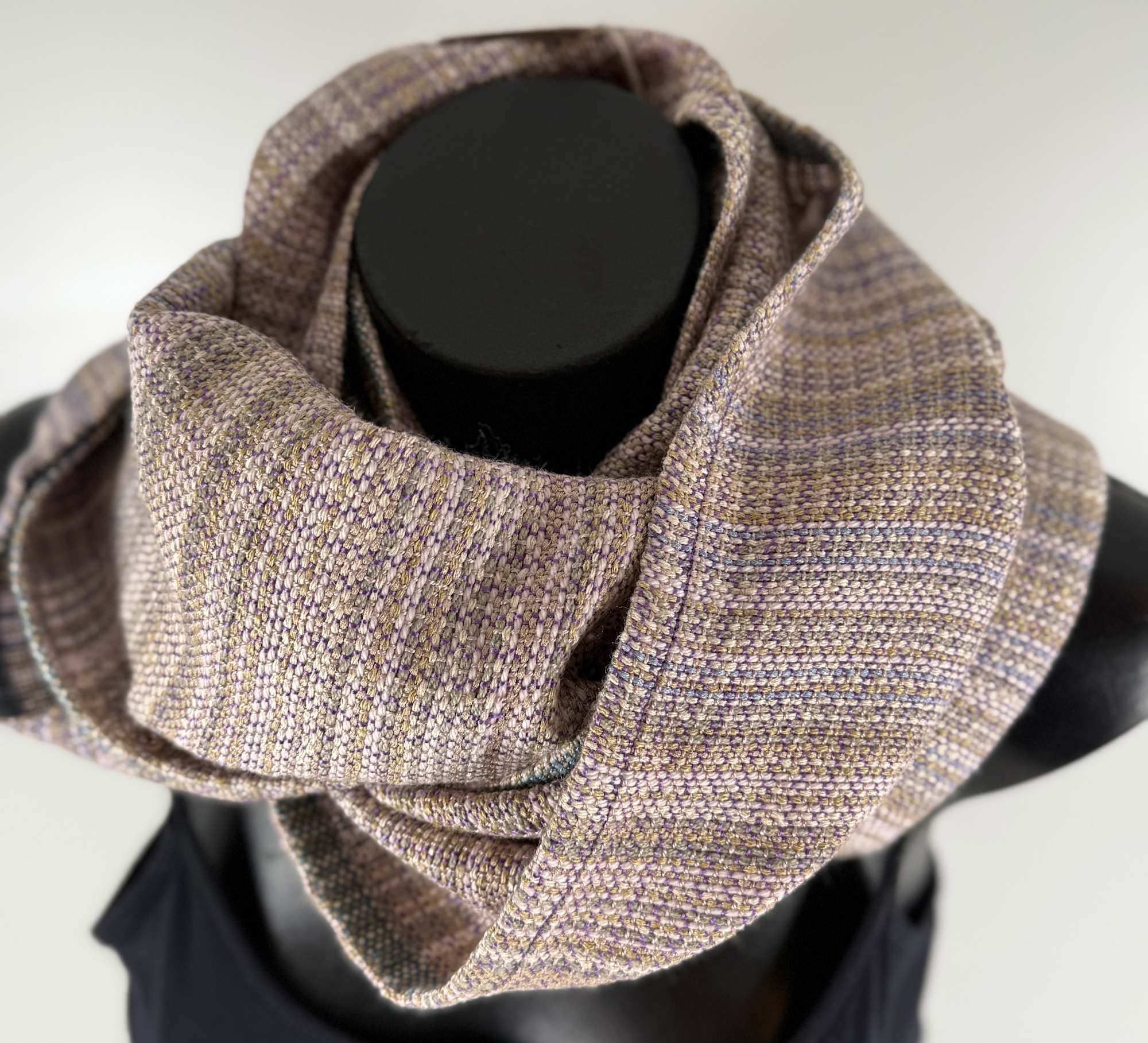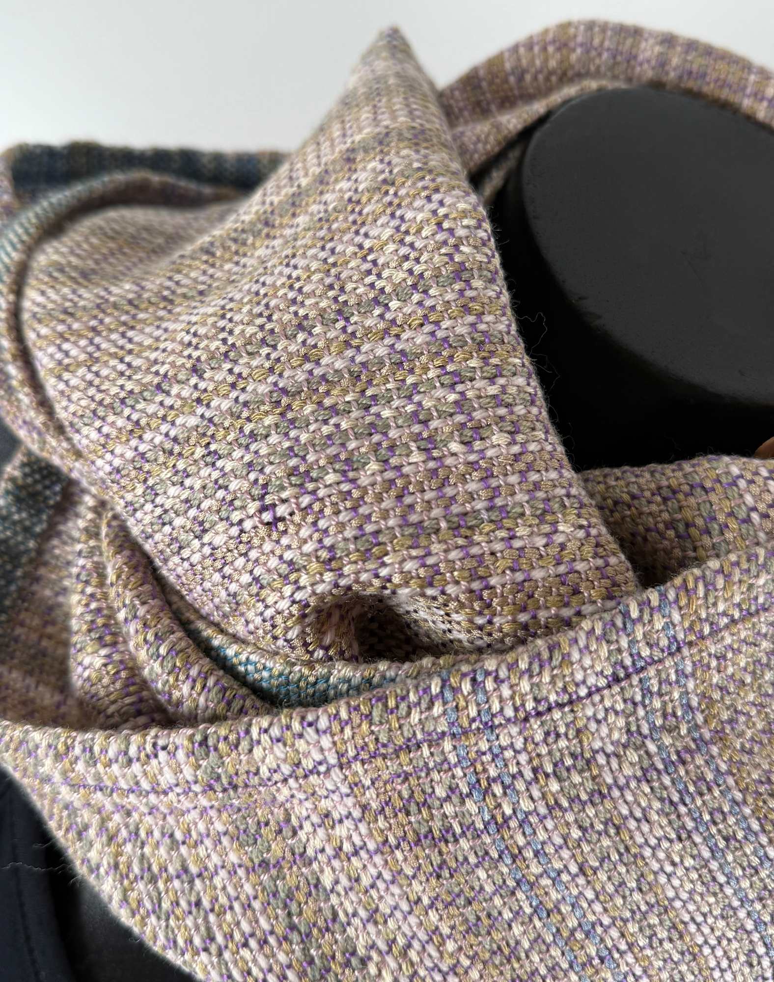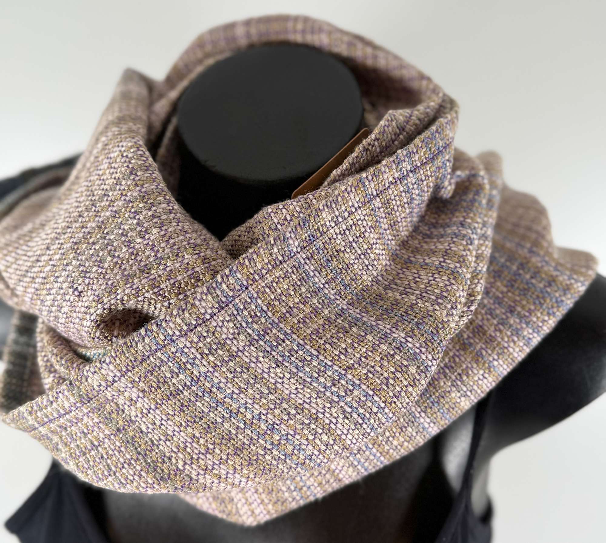 Cowl made from white, beige, grey and blue wool, silk and linen warp, with a multicoloured wool and silk weft.