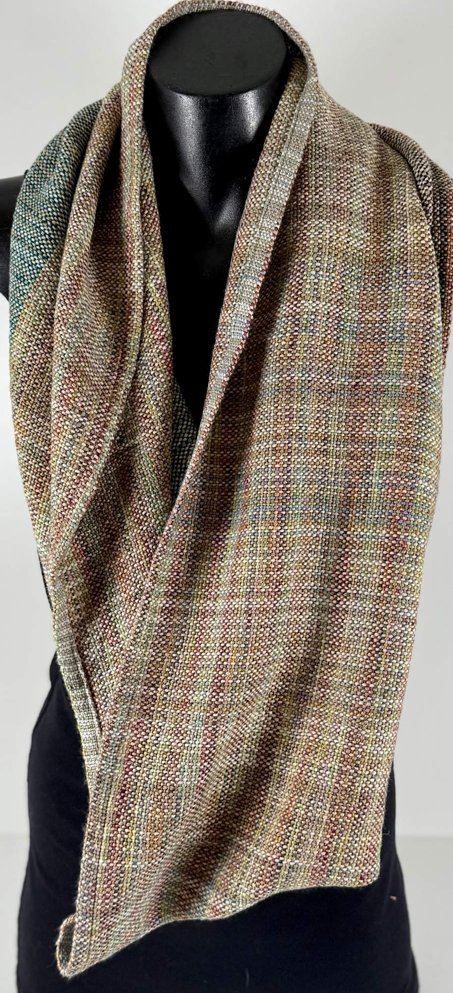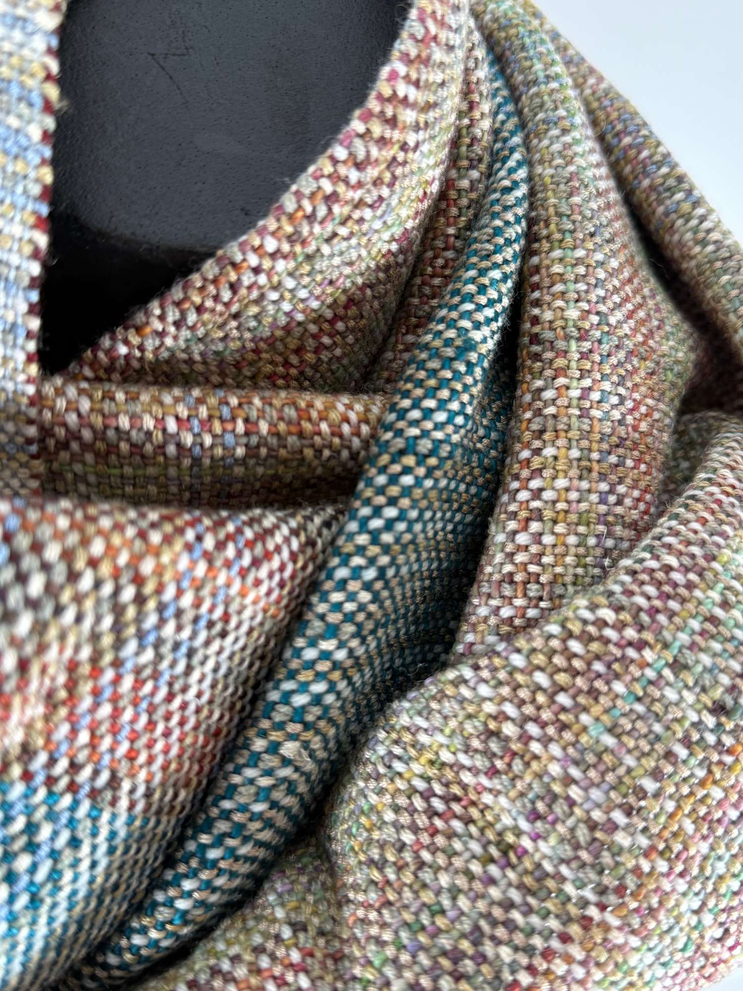Cowl made from white, beige, grey and blue wool, silk and linen warp, with a multicoloured wool weft.