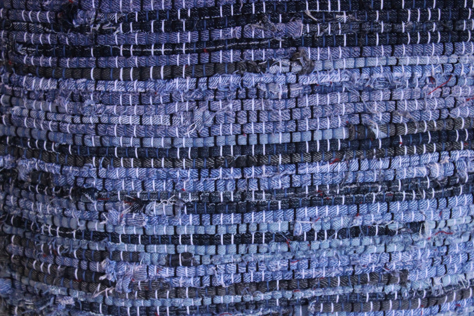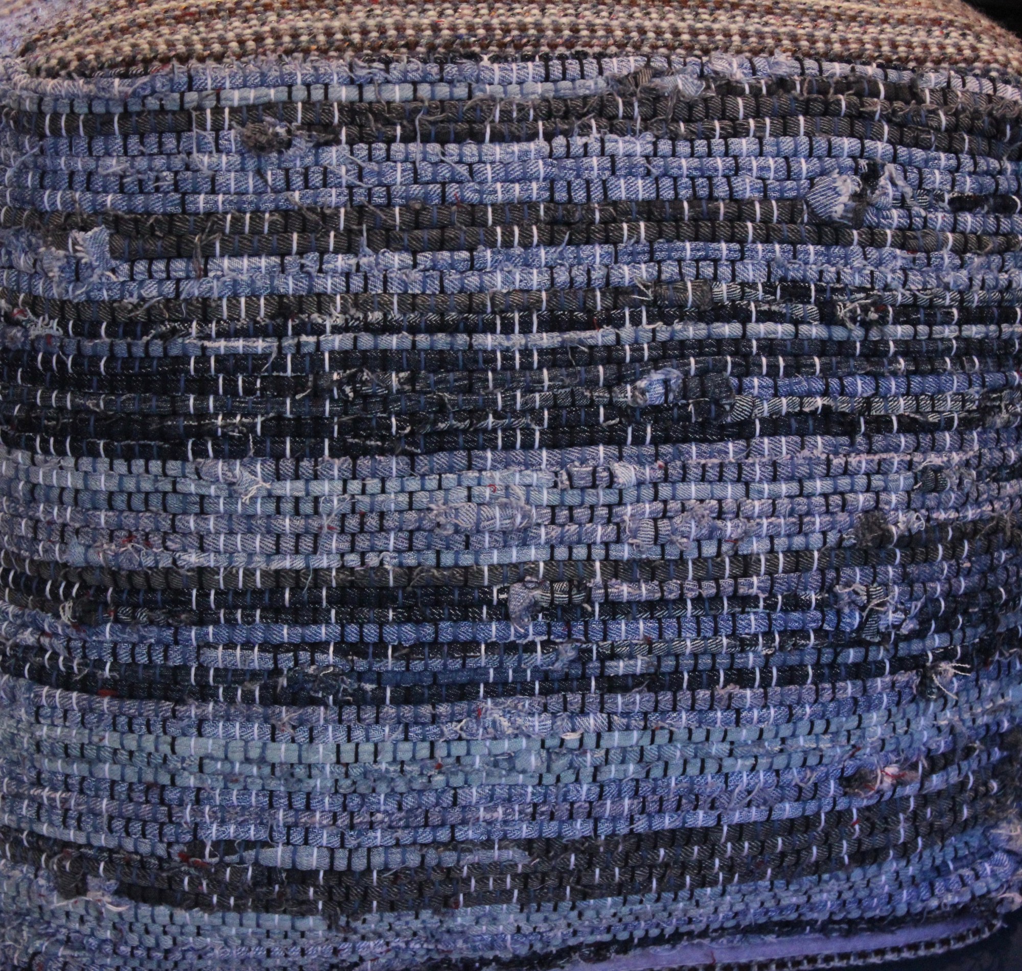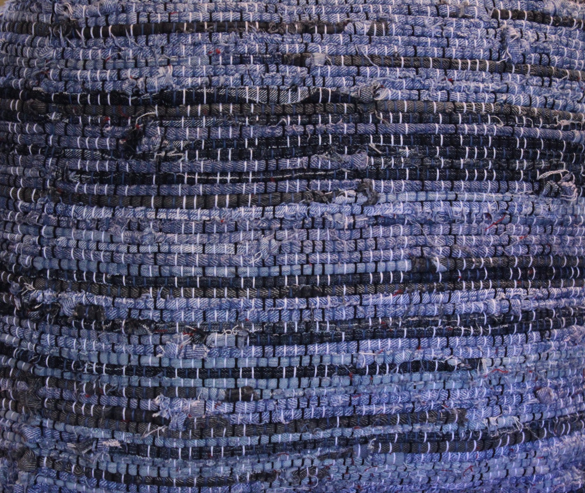 Ottoman made from cotton, rags, rug wool and recycled, shredded fabric filling. Blue denim. Double weave. 18kg