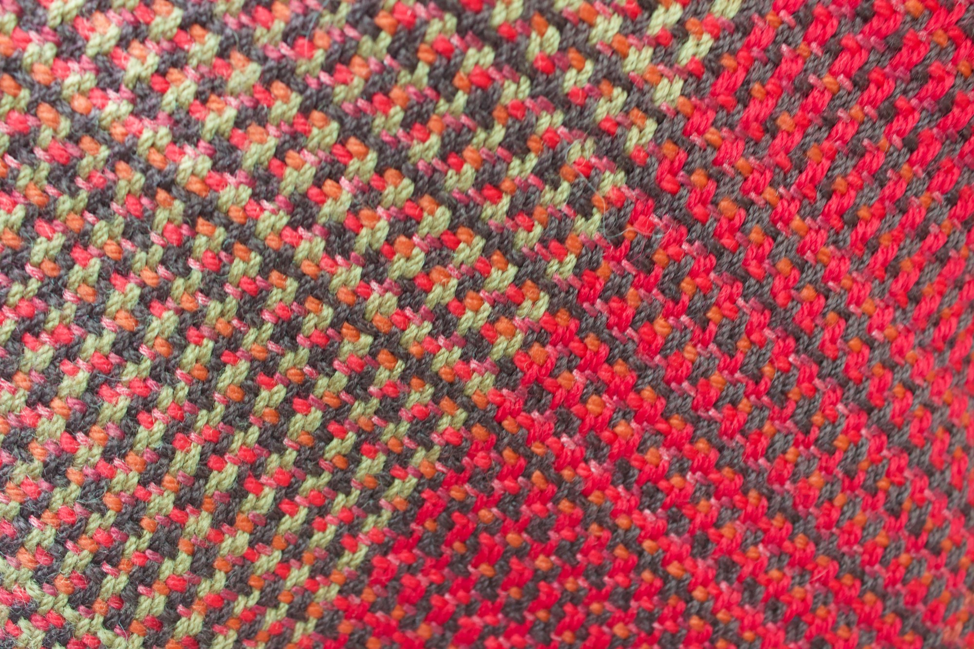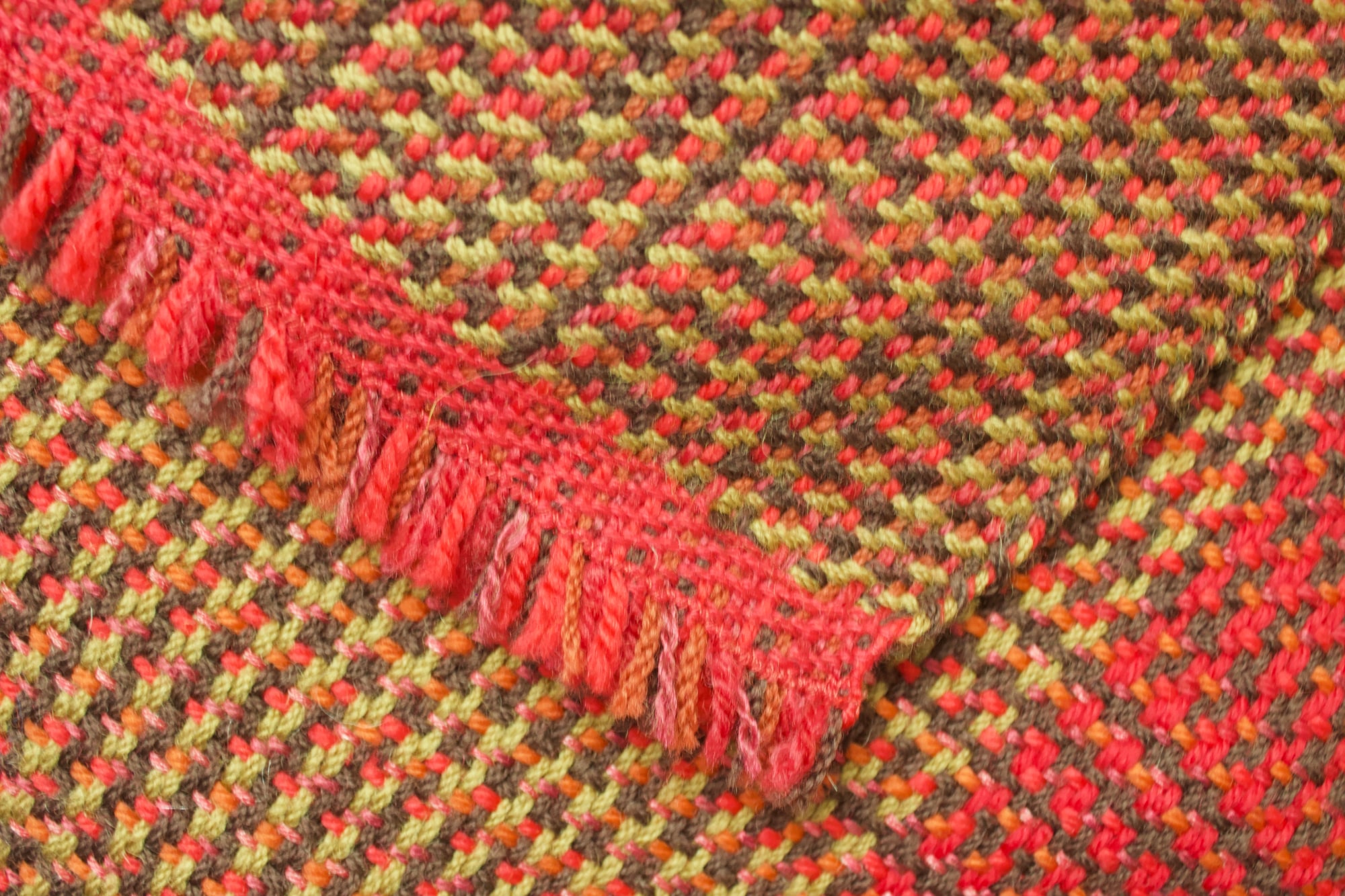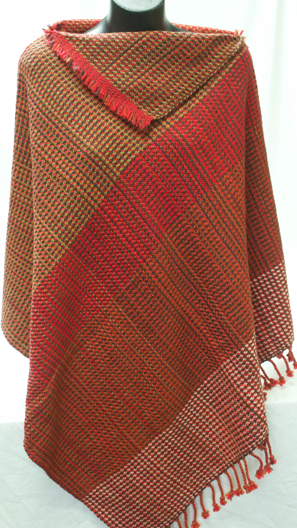 Poncho made from red, brown and orange wool and bamboo.