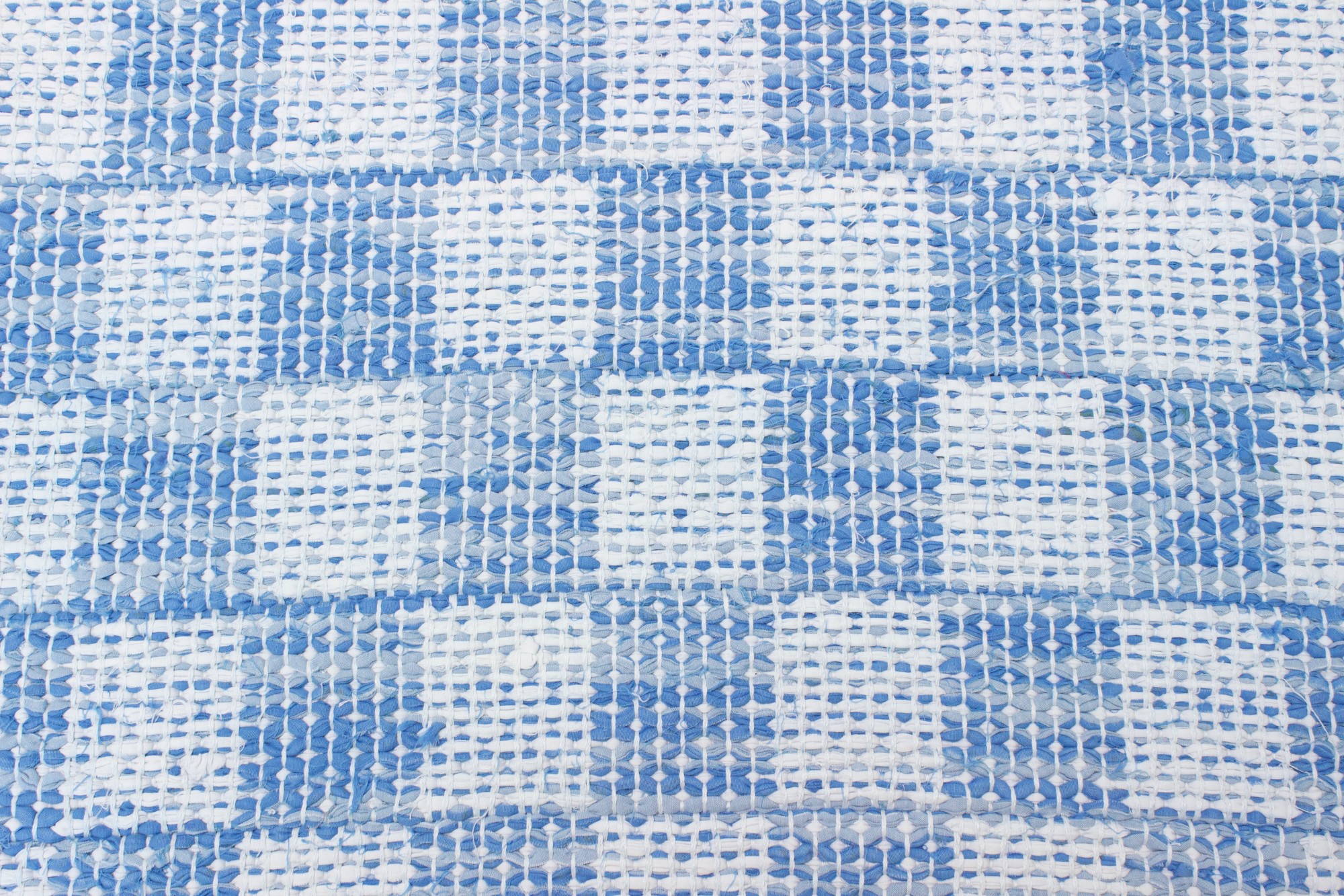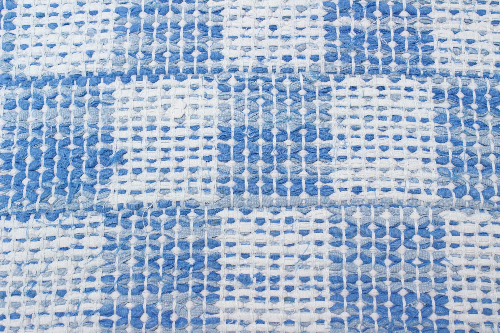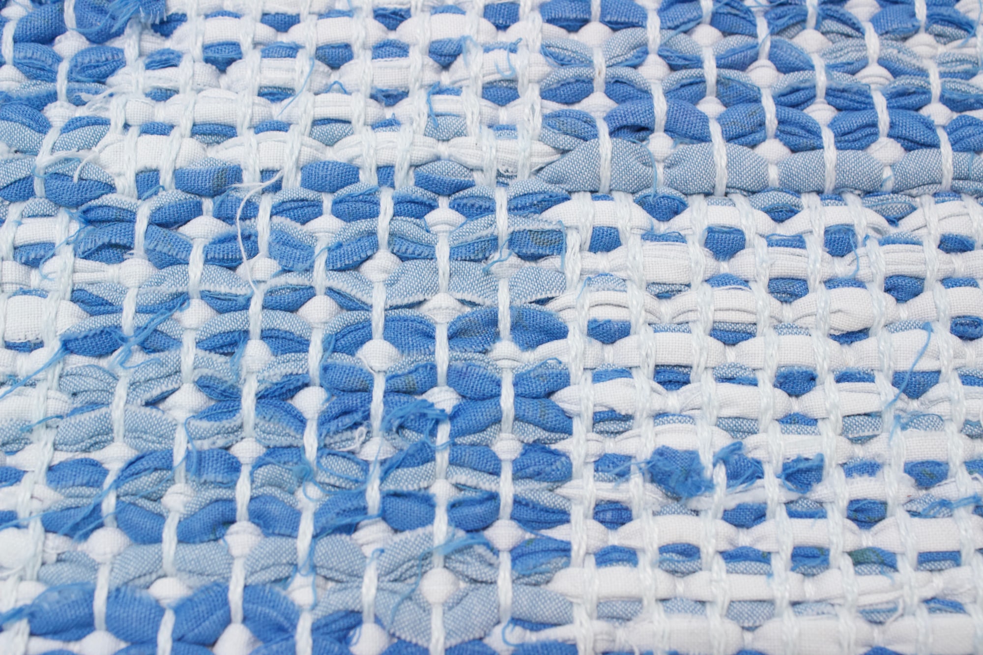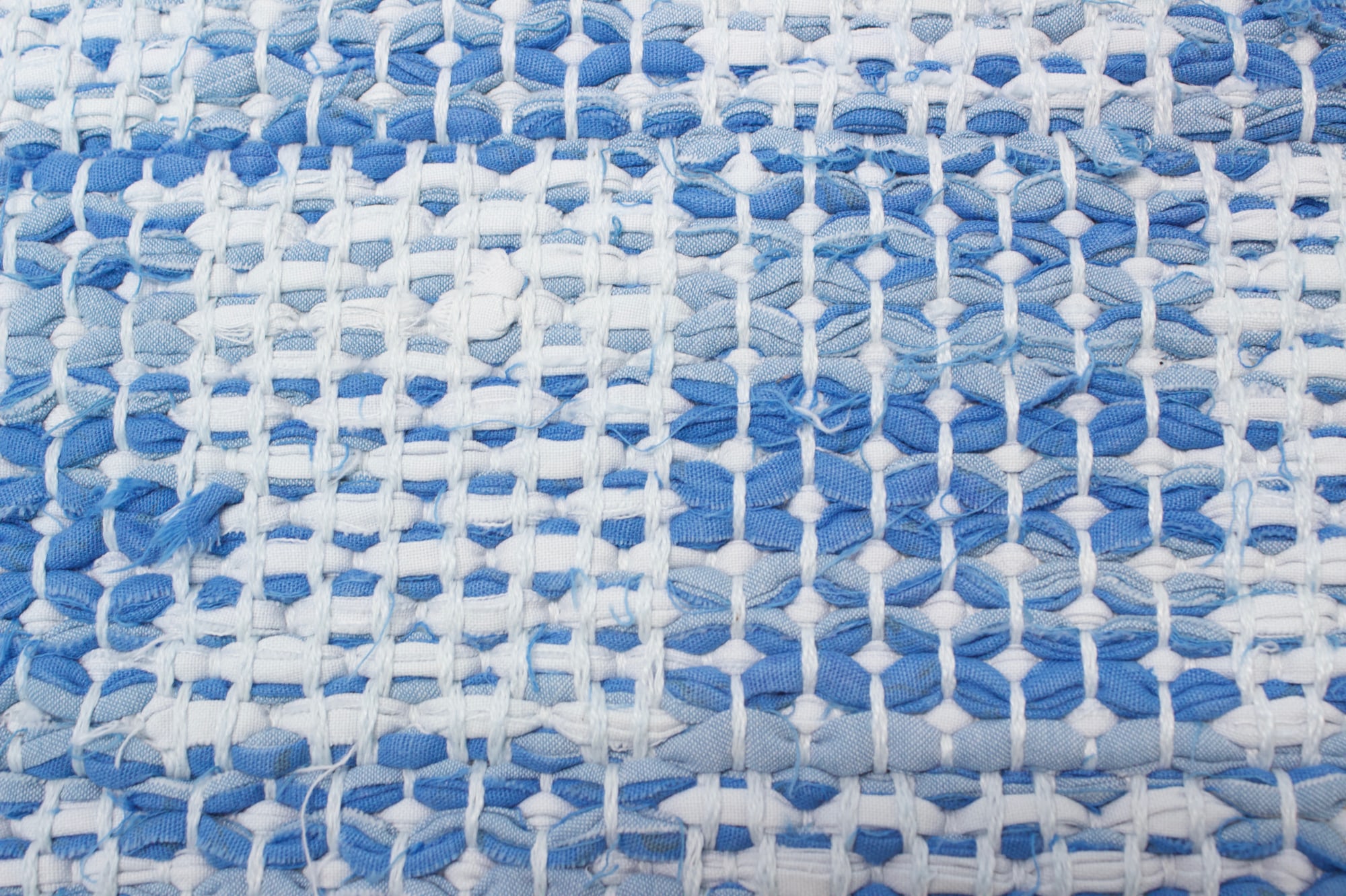 Rag rug made from white cotton warp and blue and white rags. Halvdrall pattern.