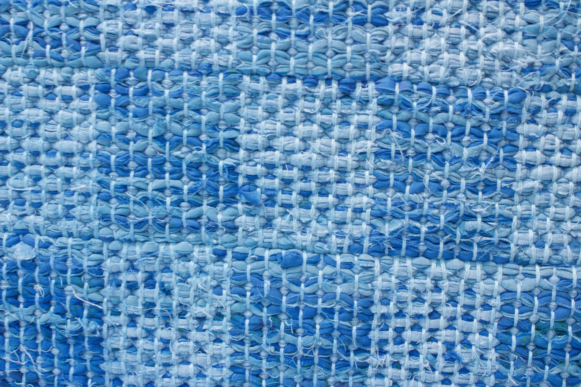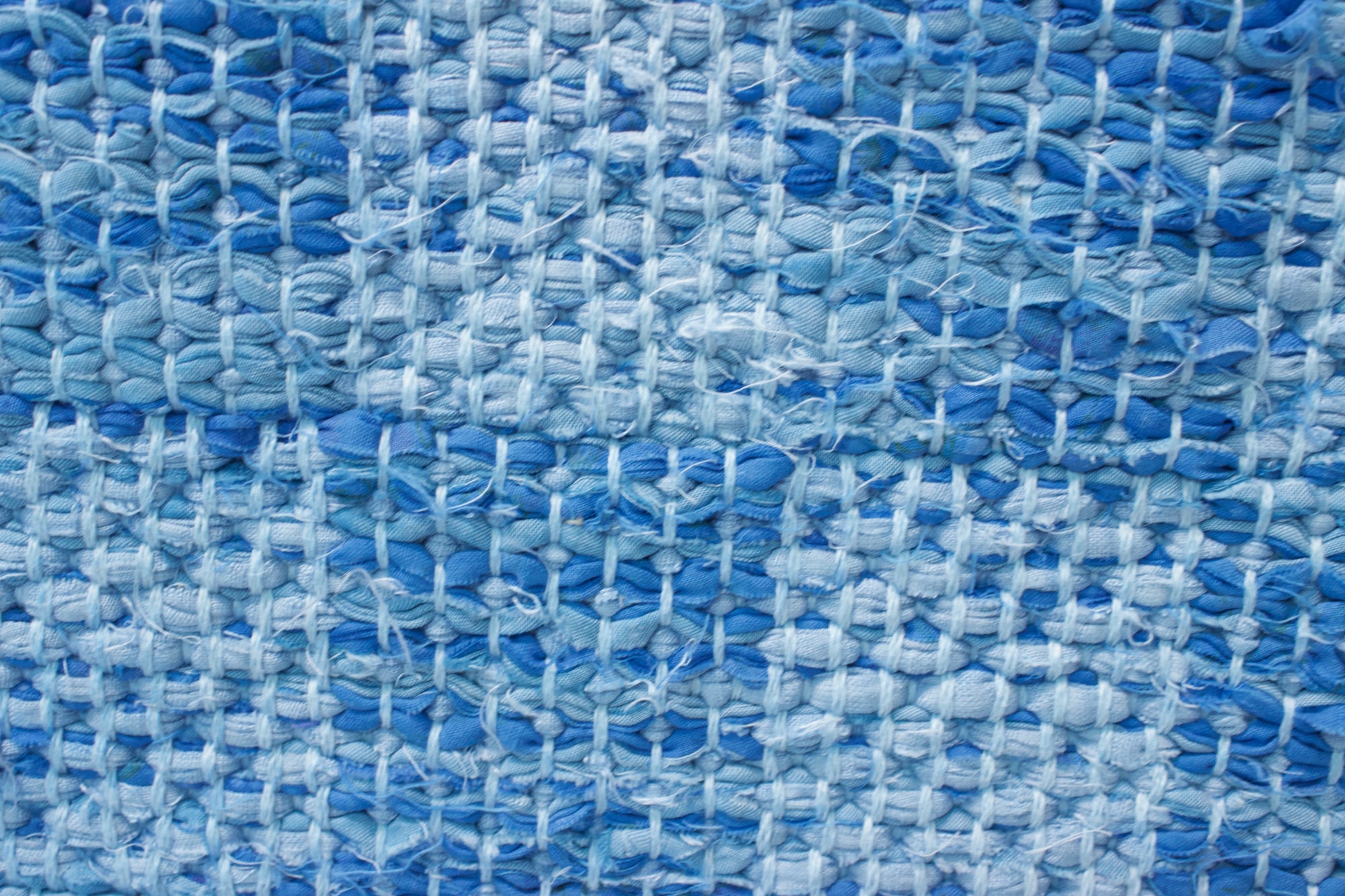 Rag rug made from white cotton warp and blue rags.