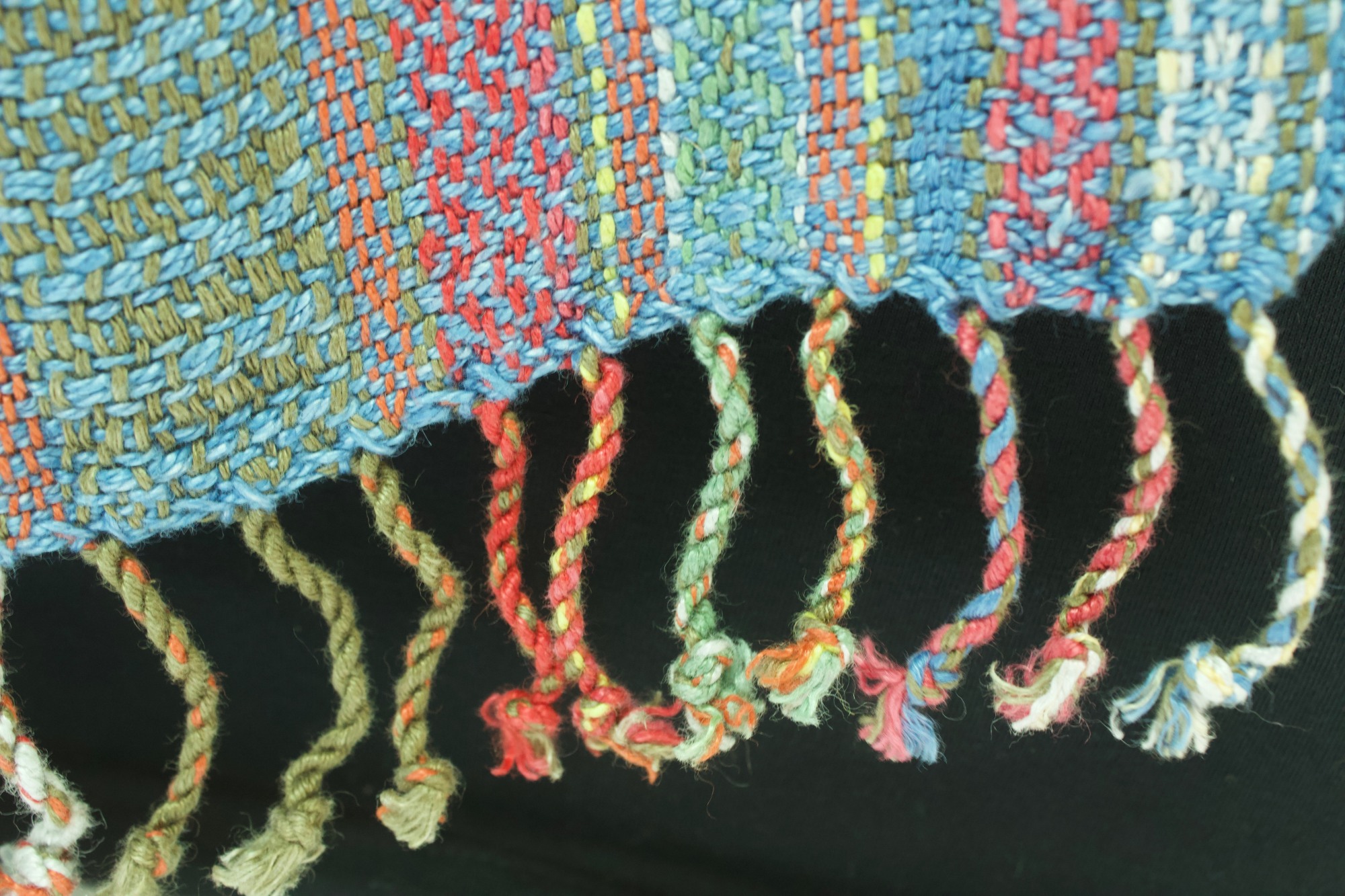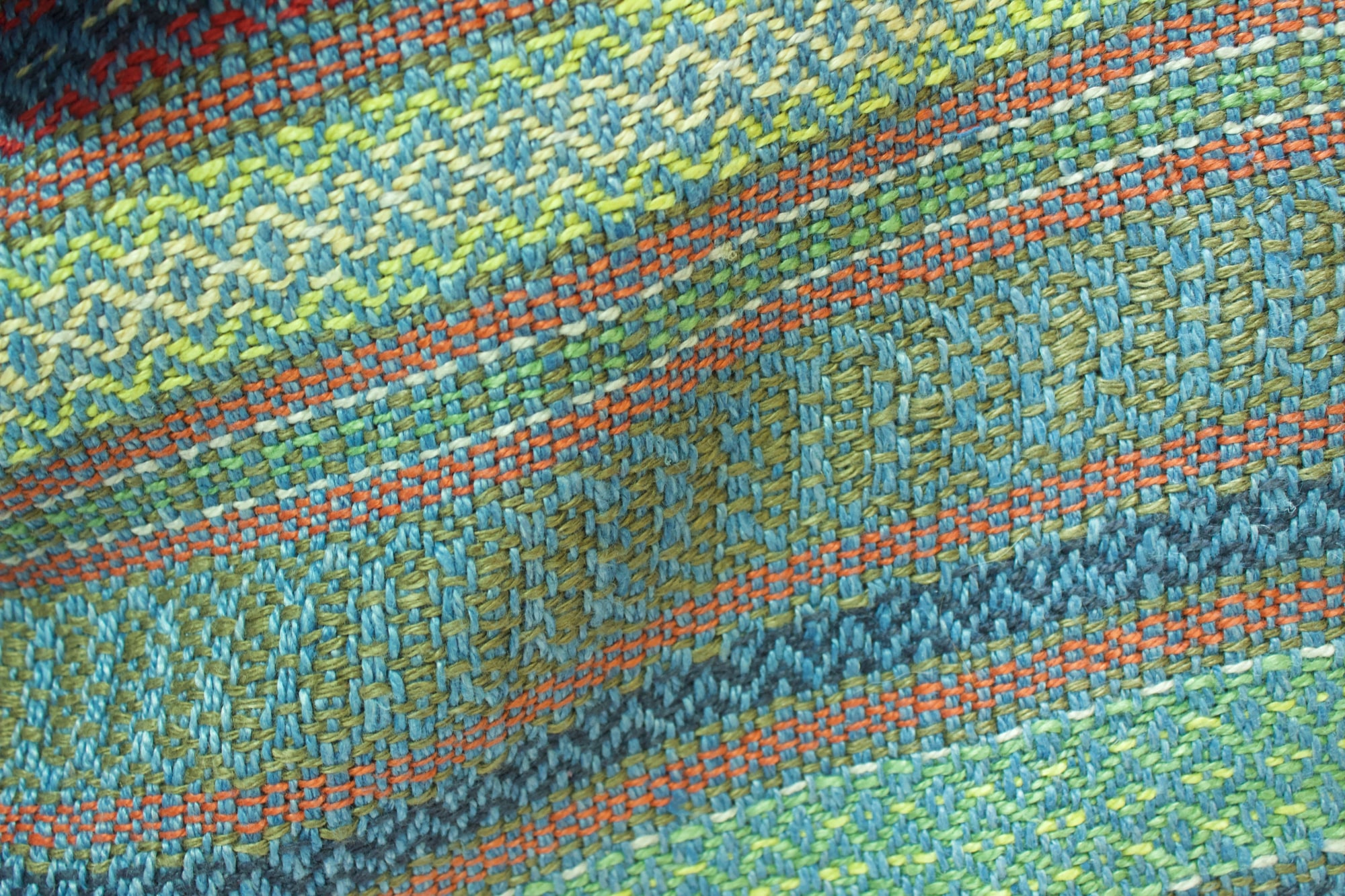 Ruana made from linen in red, grey, green, blue, yellow and brown warp with a blue weft. Twill patterns.
