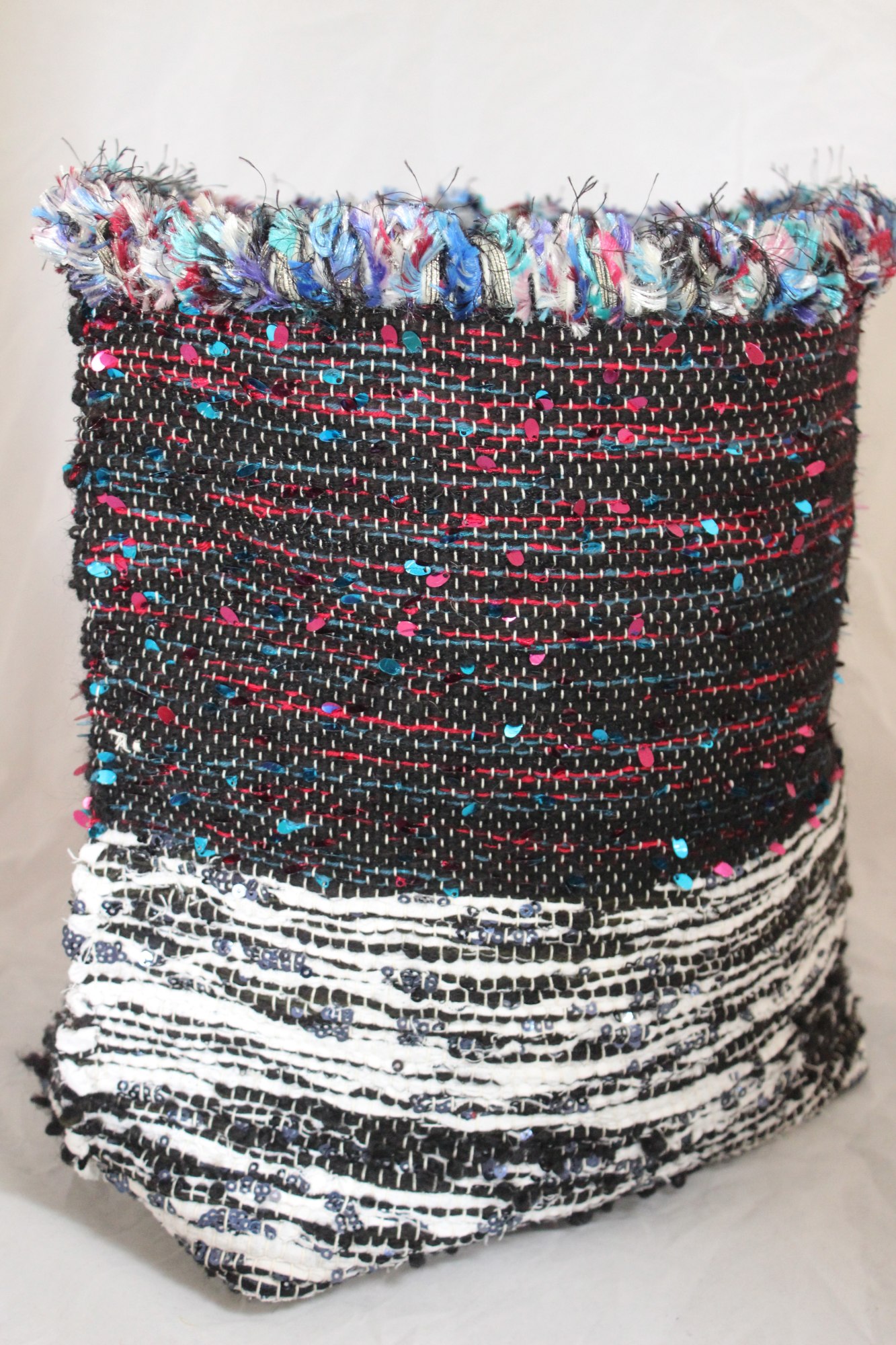 Sack made from black and white rags and black, red and blue rug yarns with sequins.