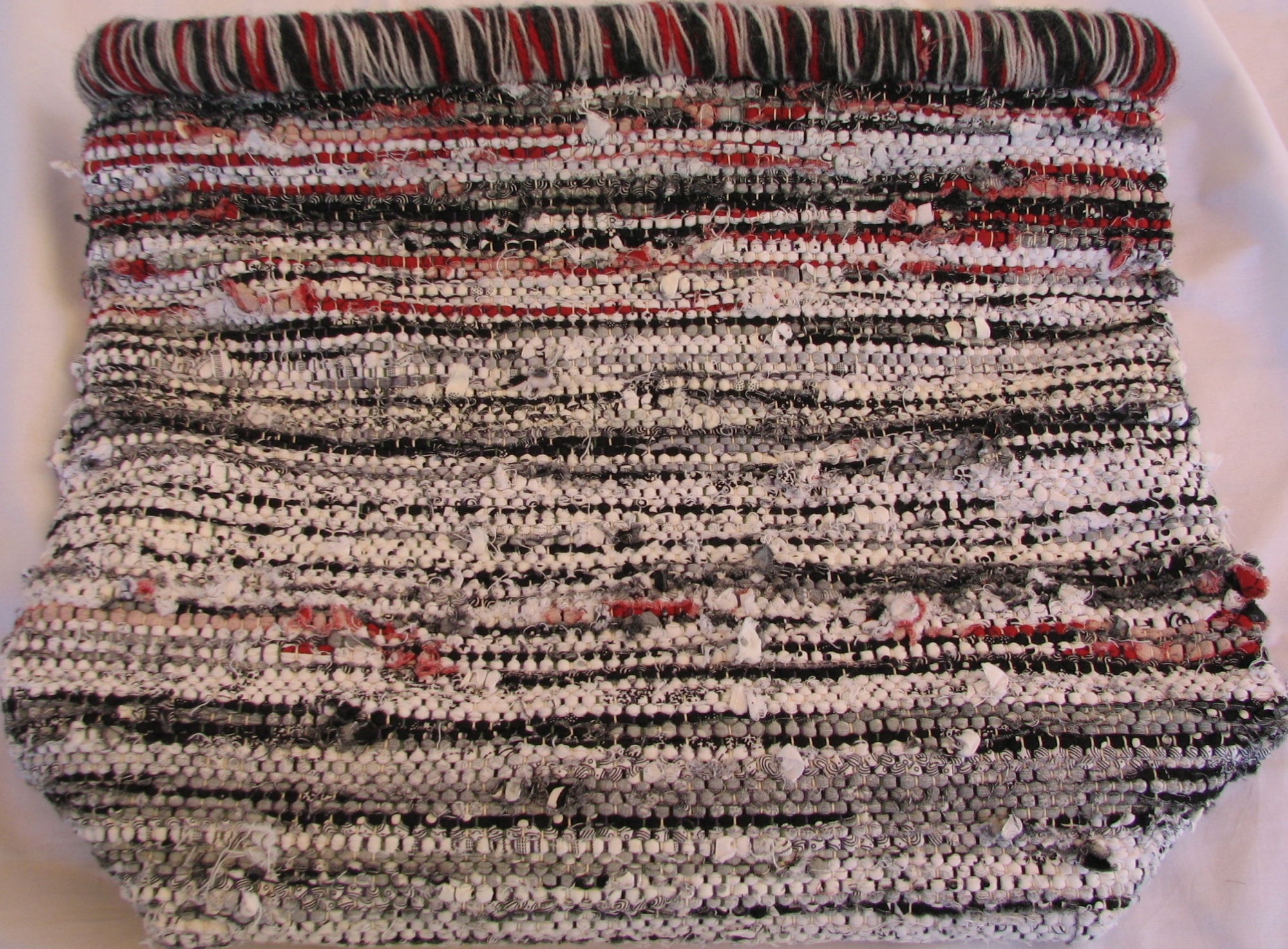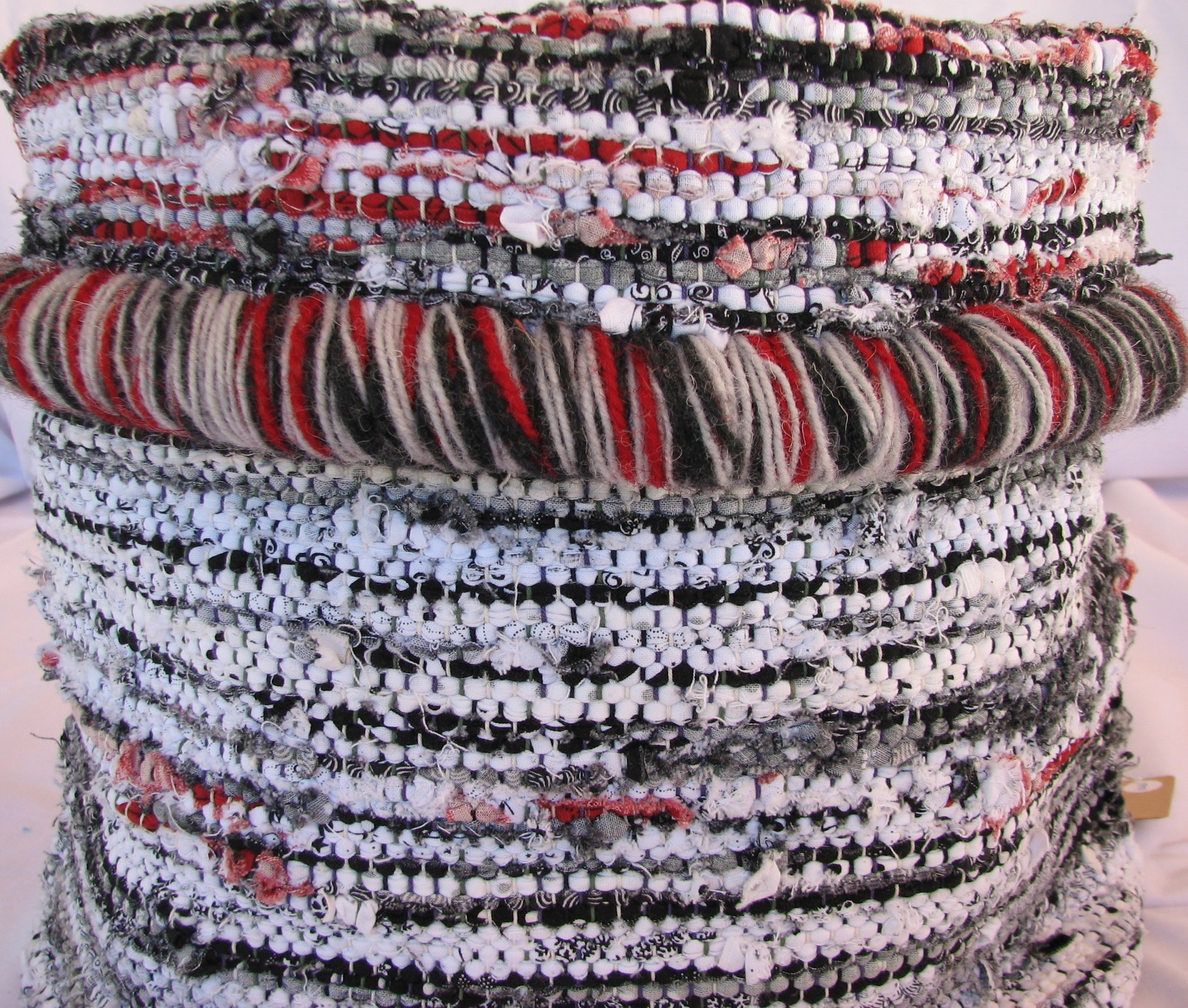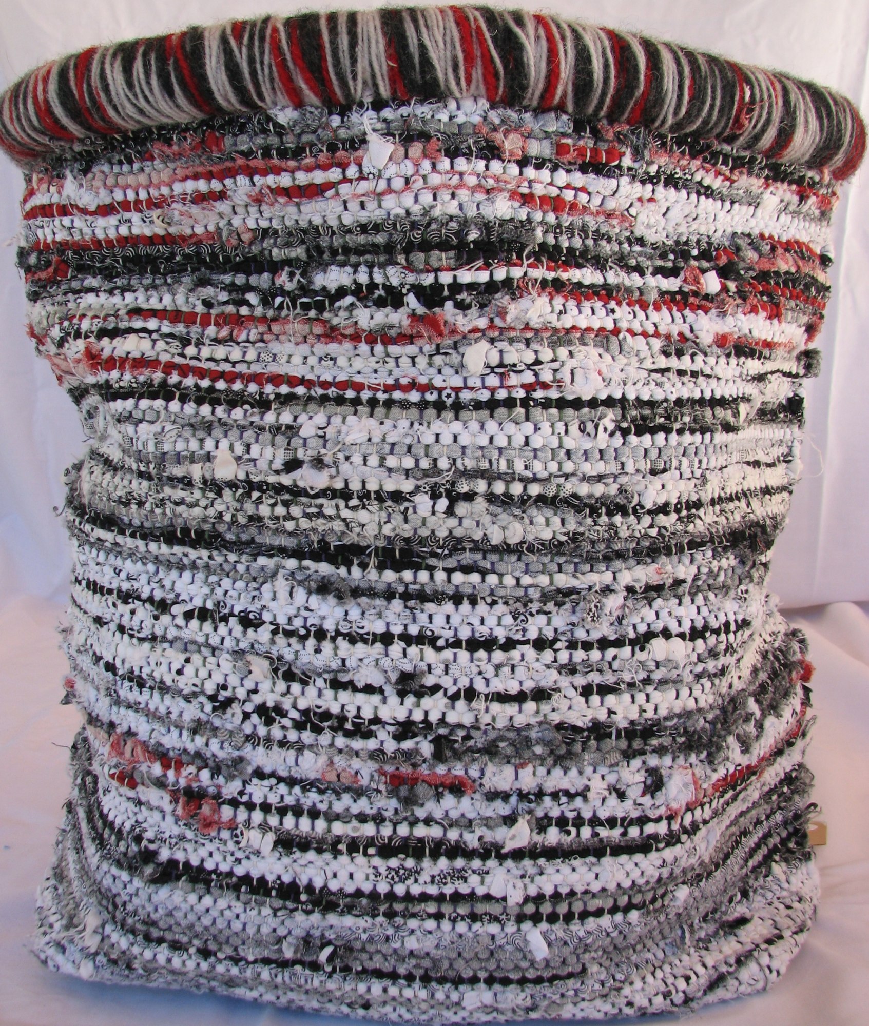 Sack made from red, white and black rags.