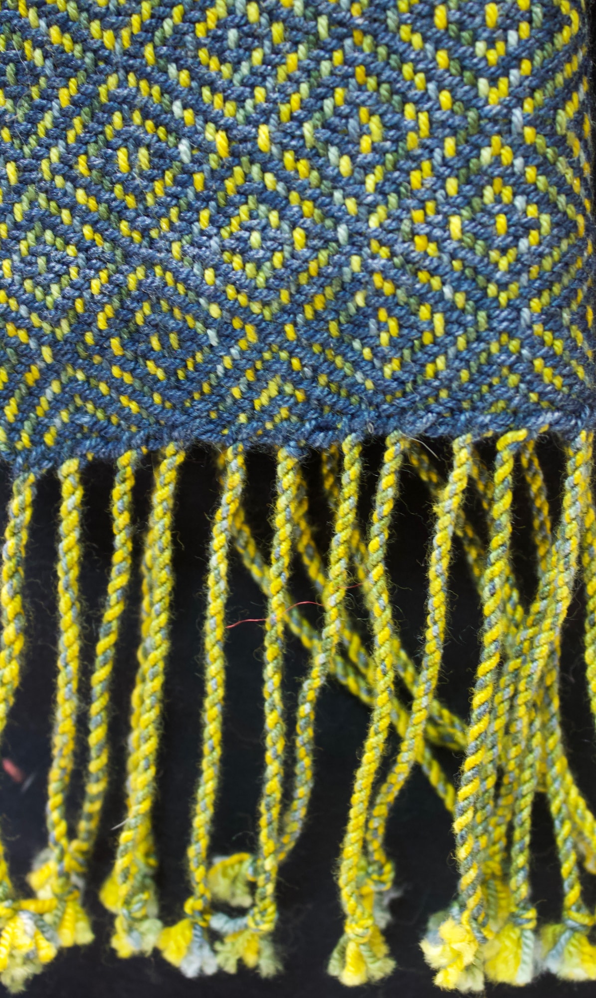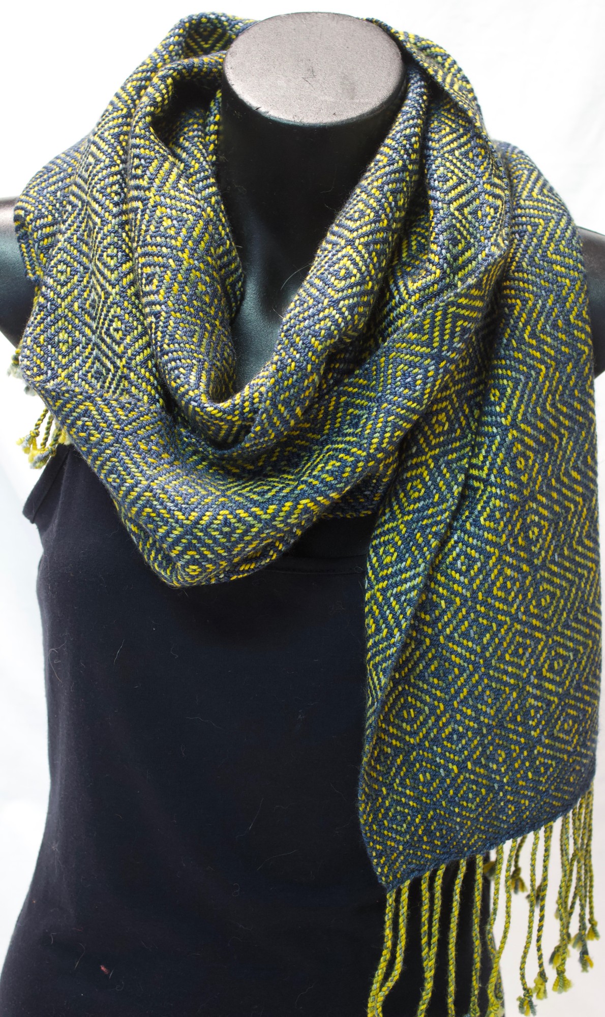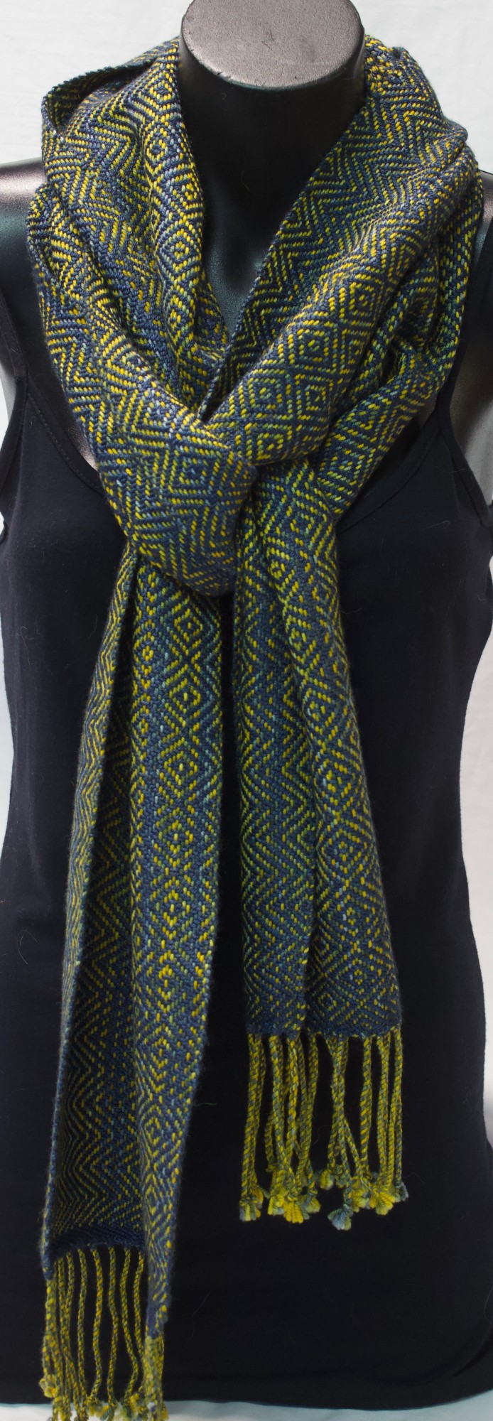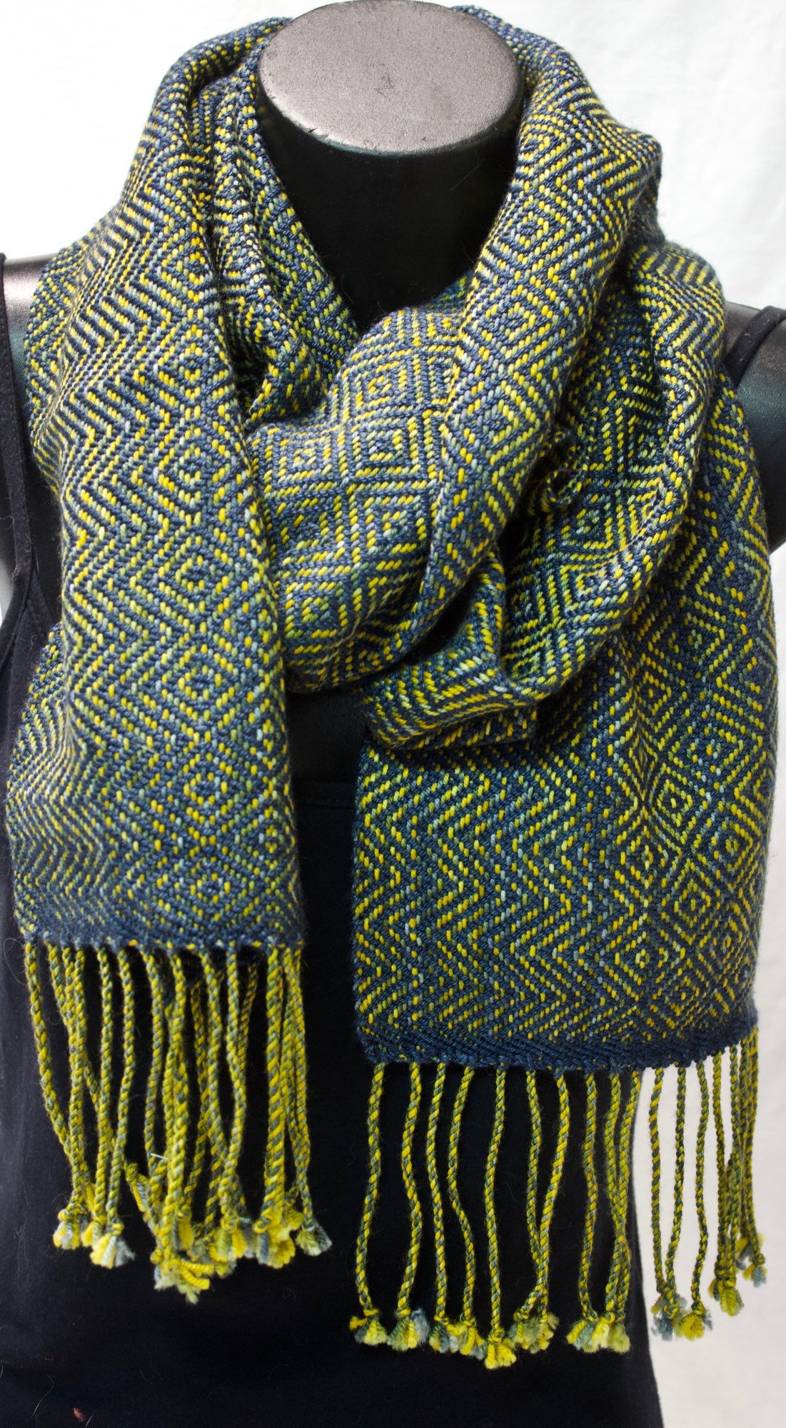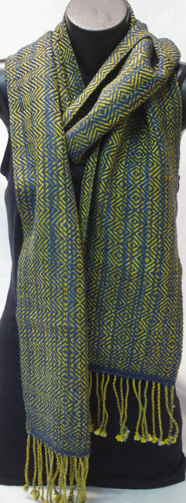 Scarf made from hand dyed wool, silk, cashmere and yak in blue, yellow and green.