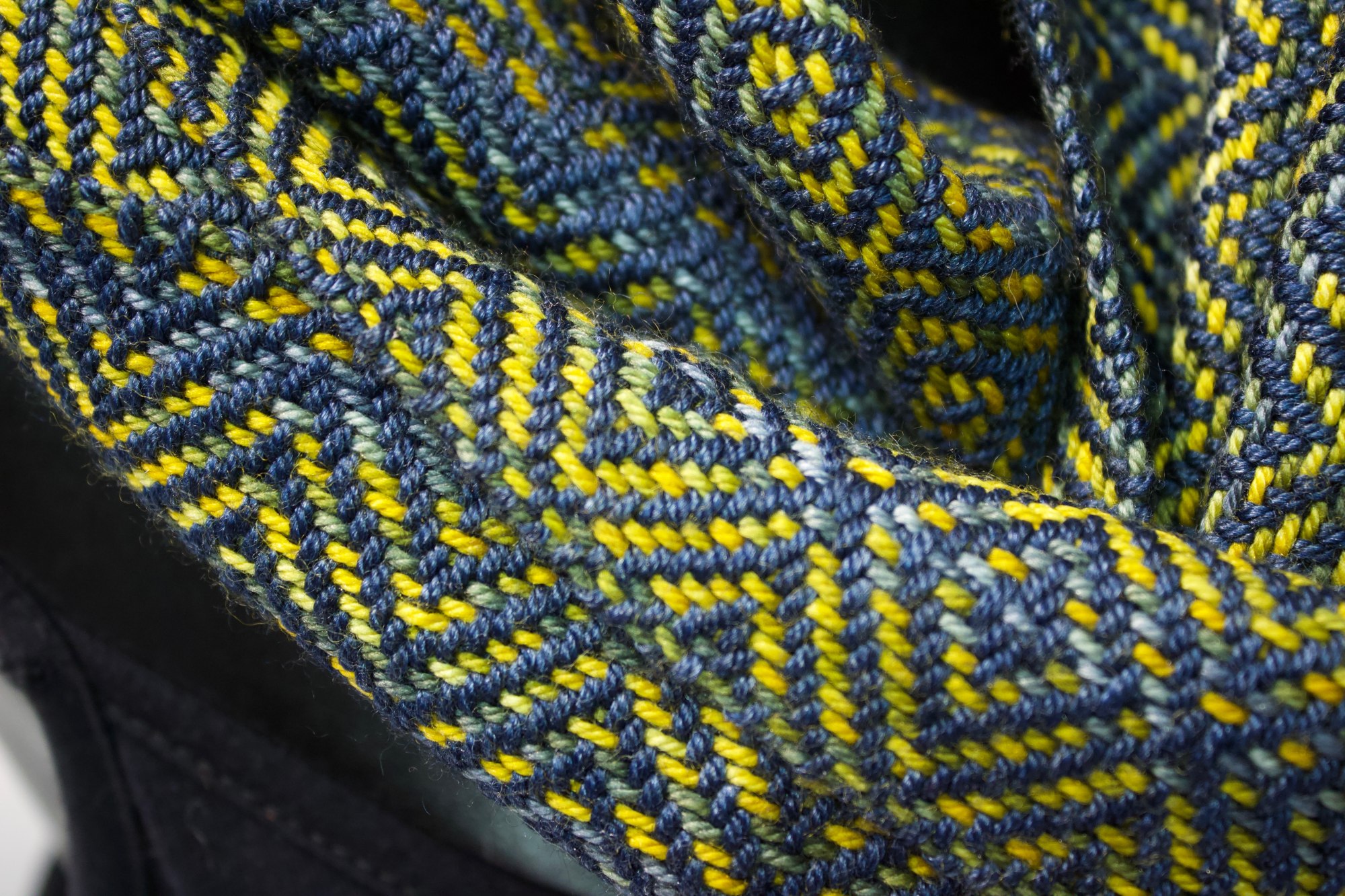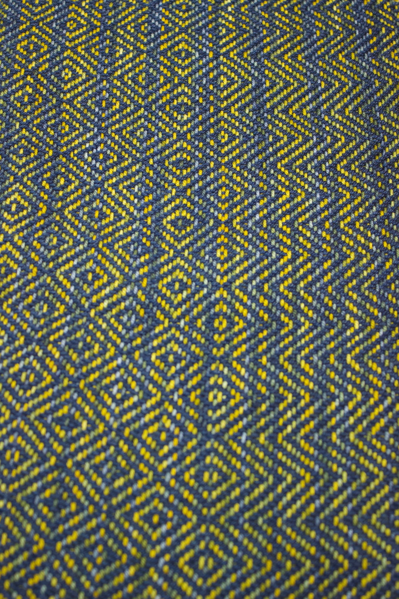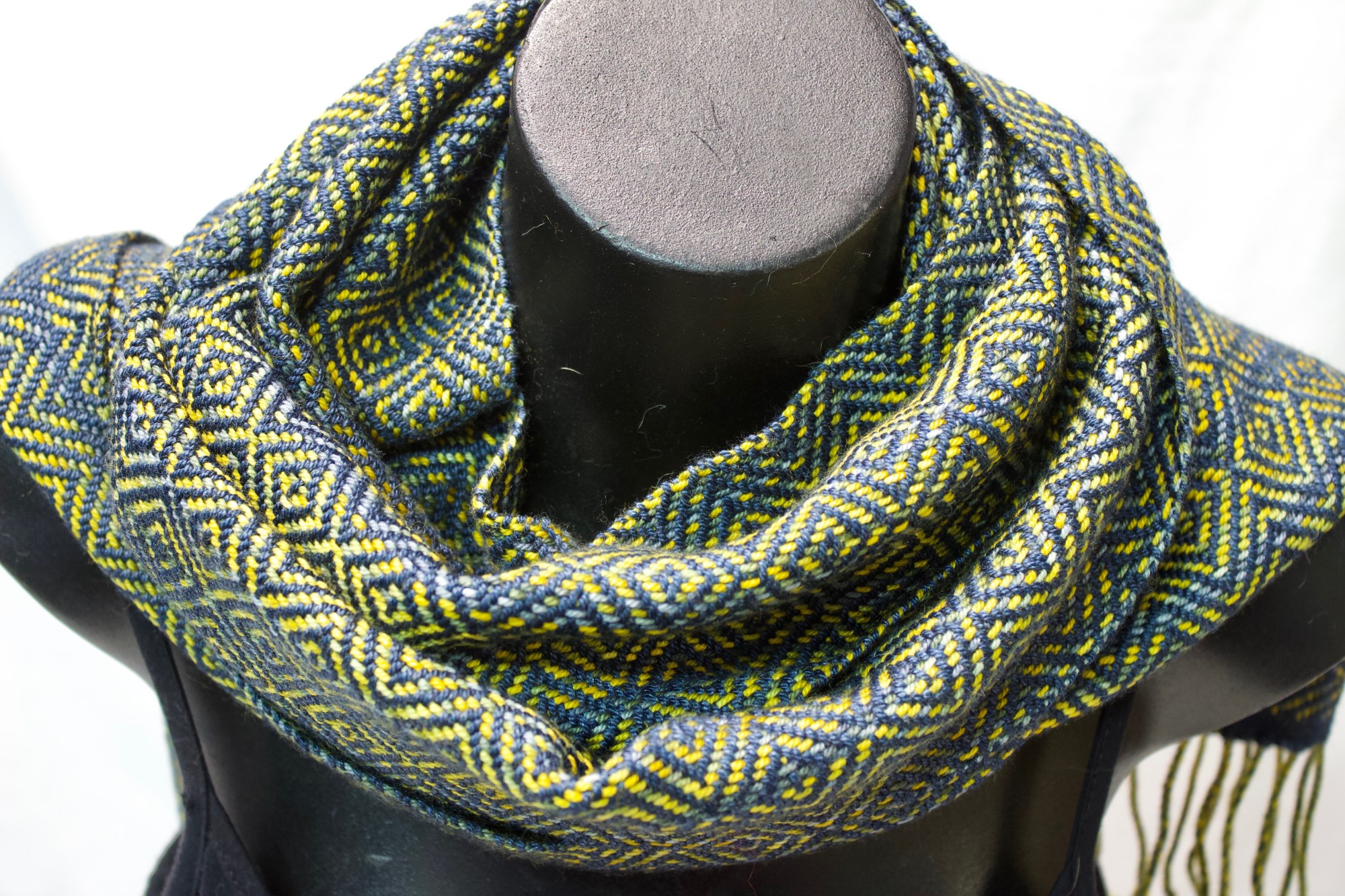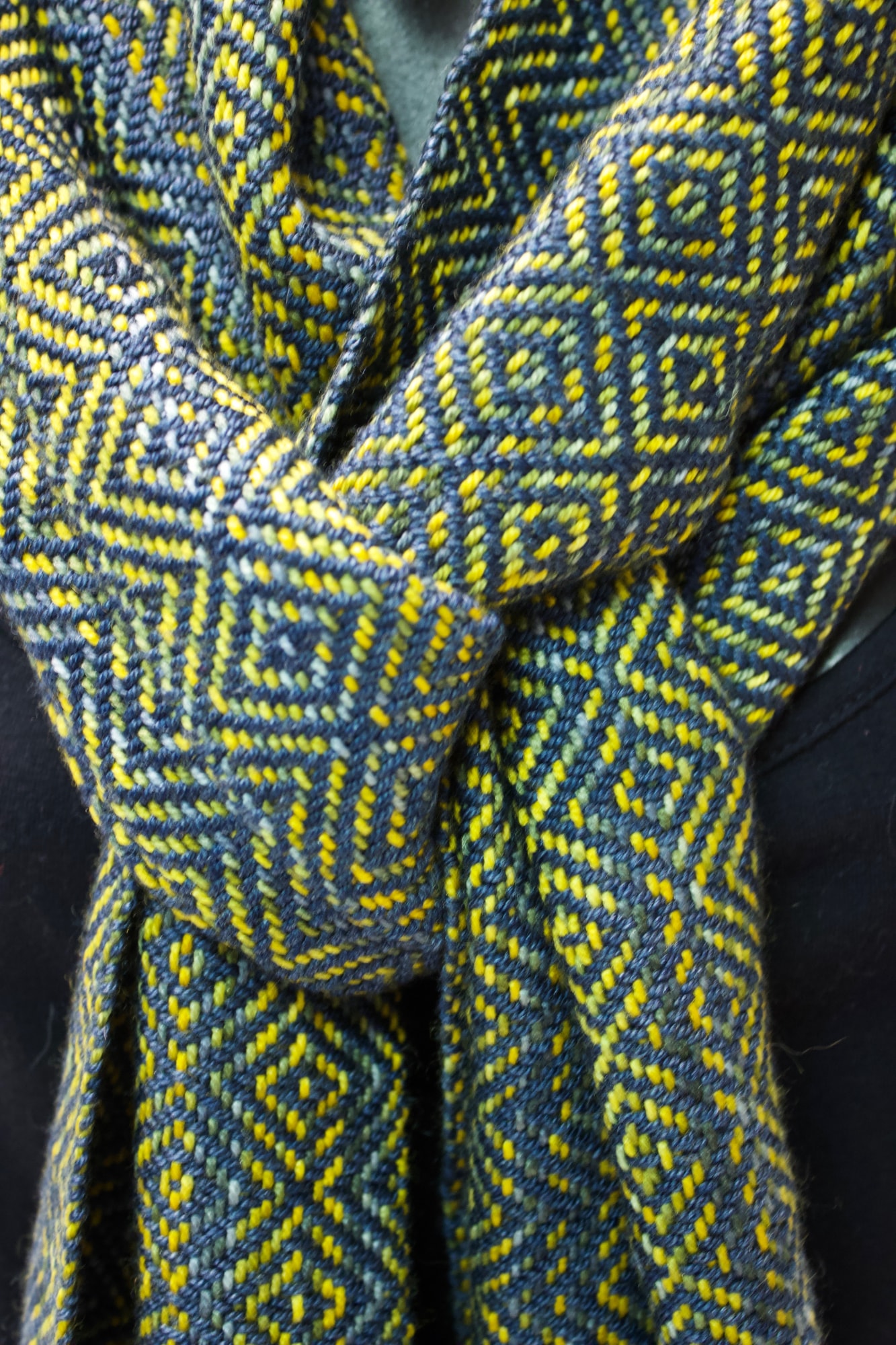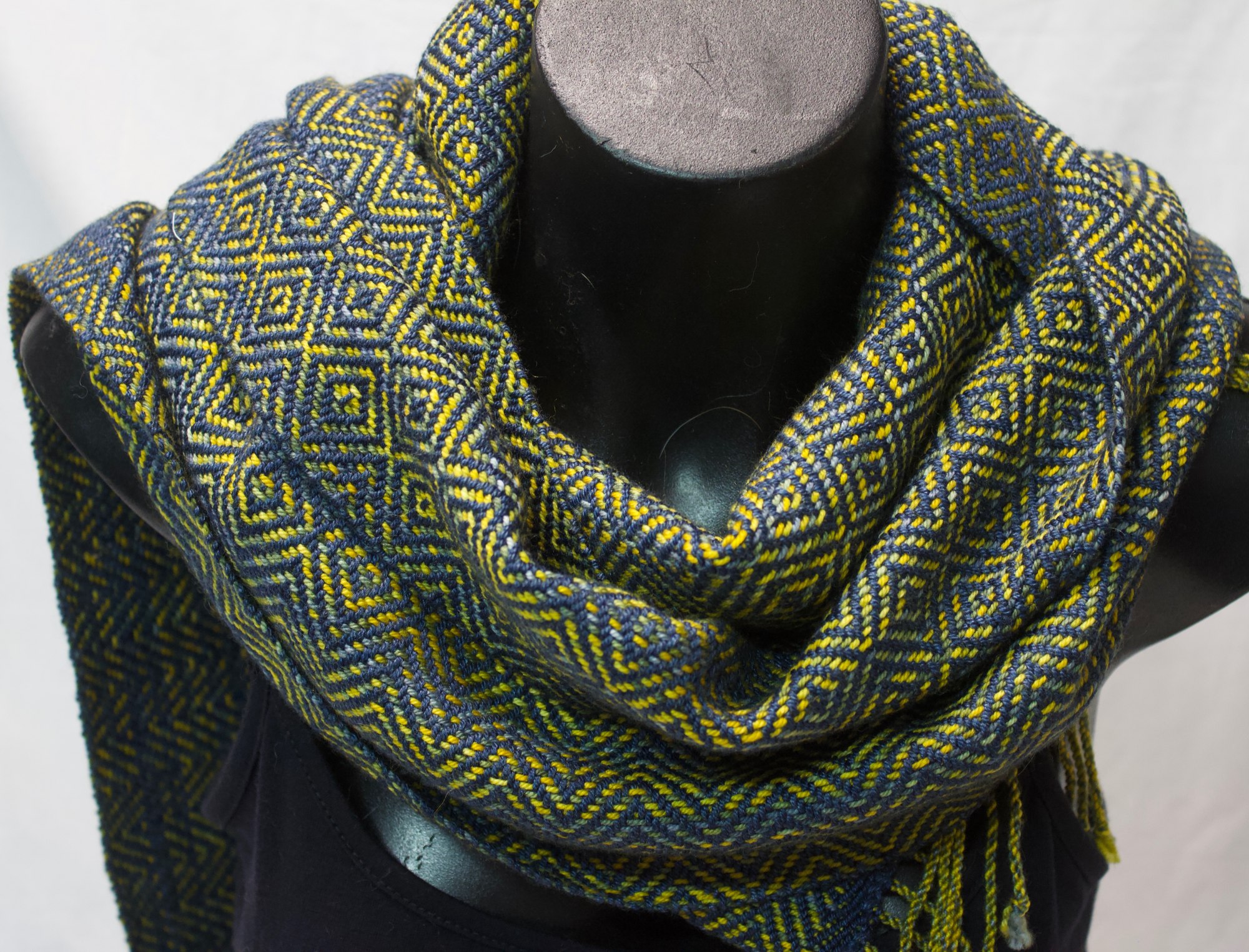 Scarf made from hand dyed wool, silk, cashmere and yak in blue, yellow and green.