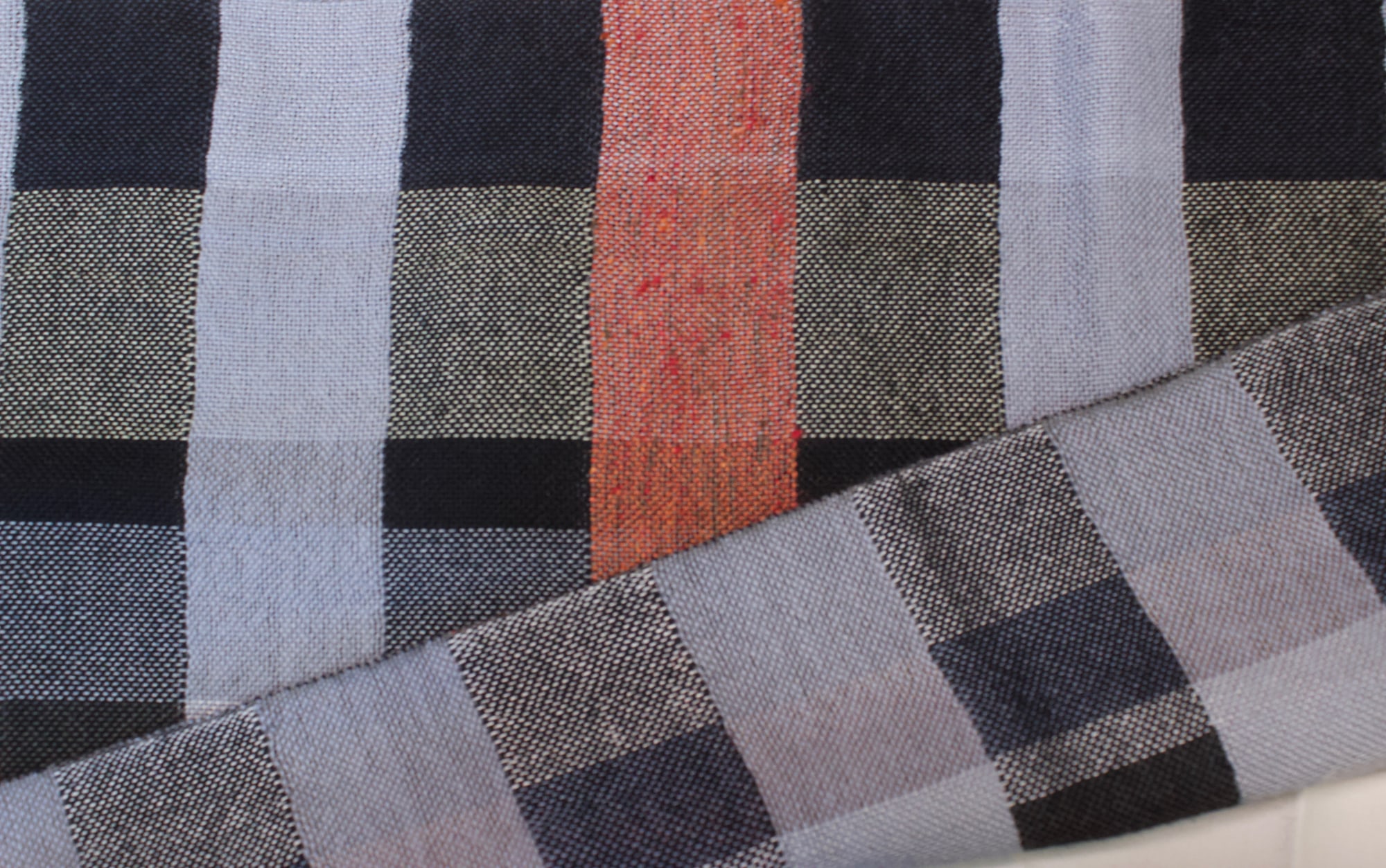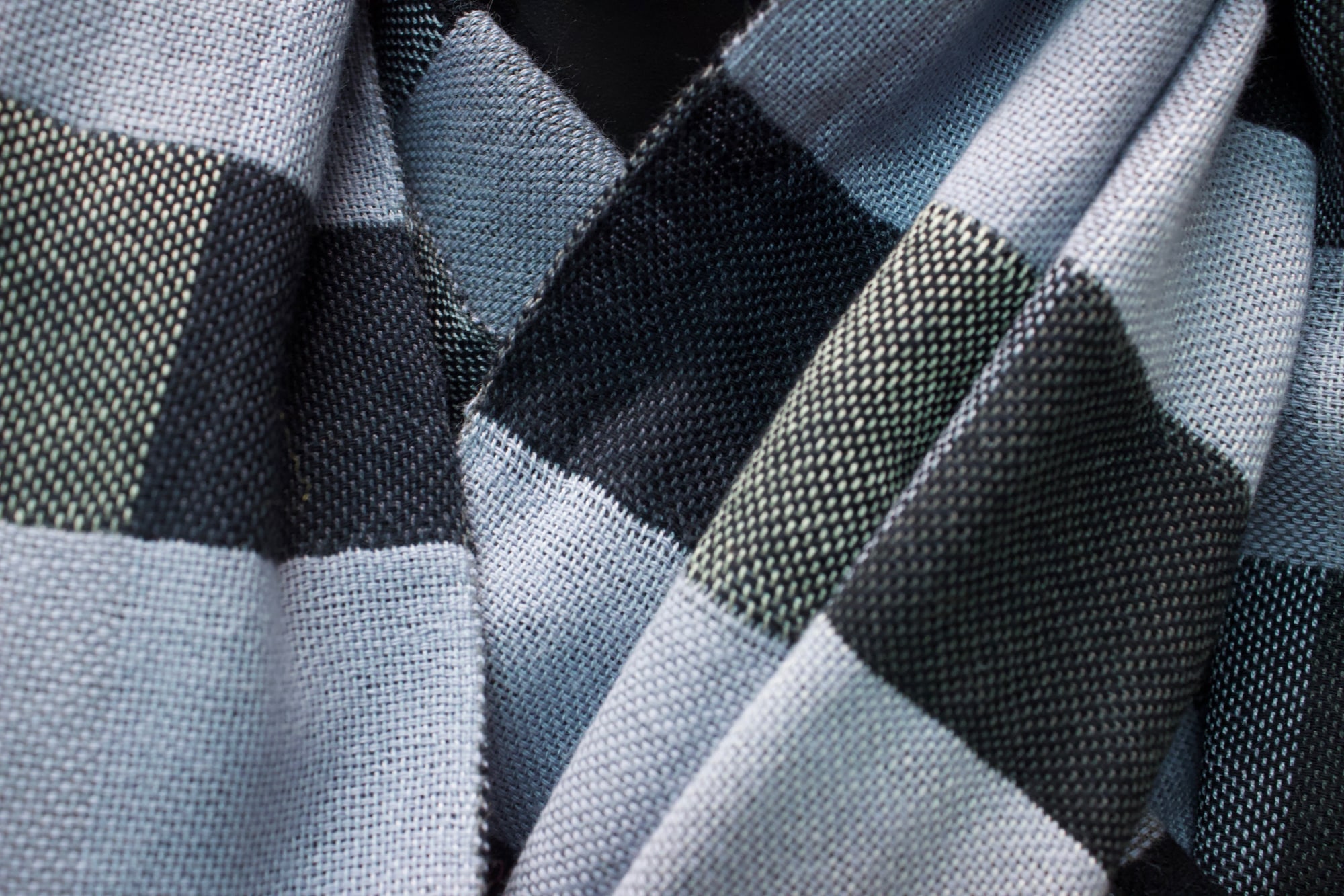 Scarf made from black, grey and blue cotton.