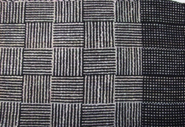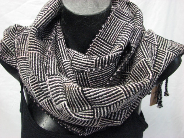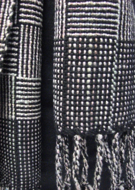 Scarf made from black merino and pinkish hand spun wool/silk.