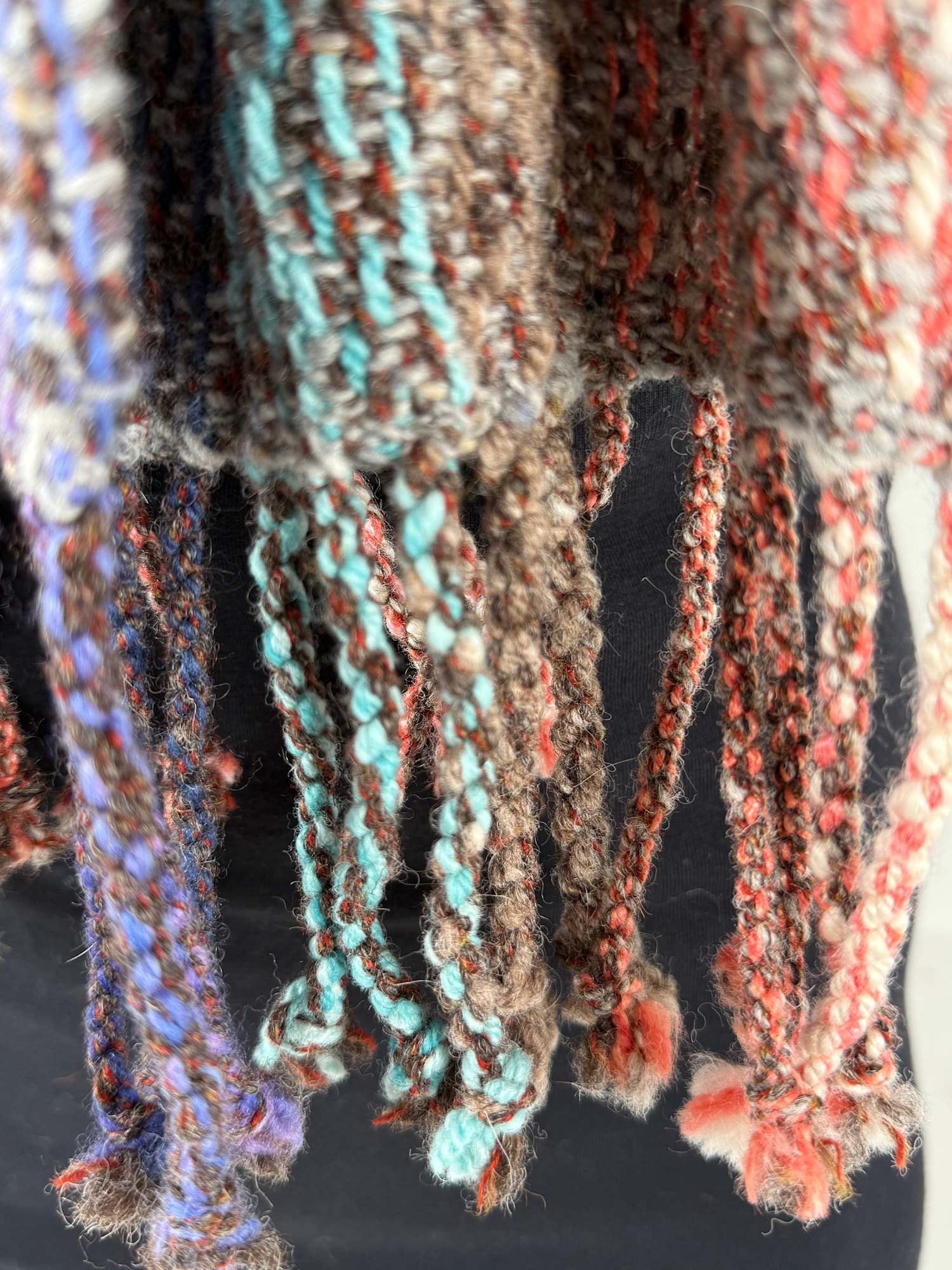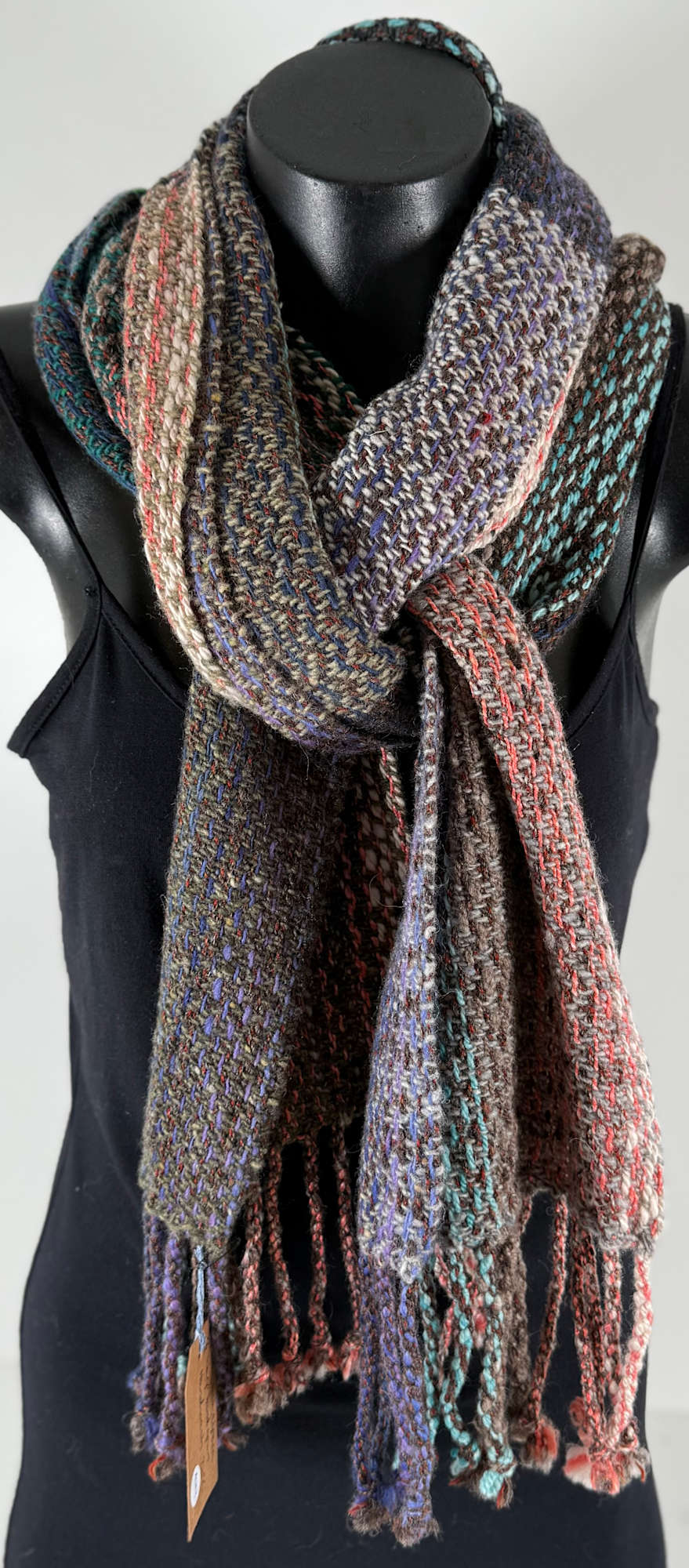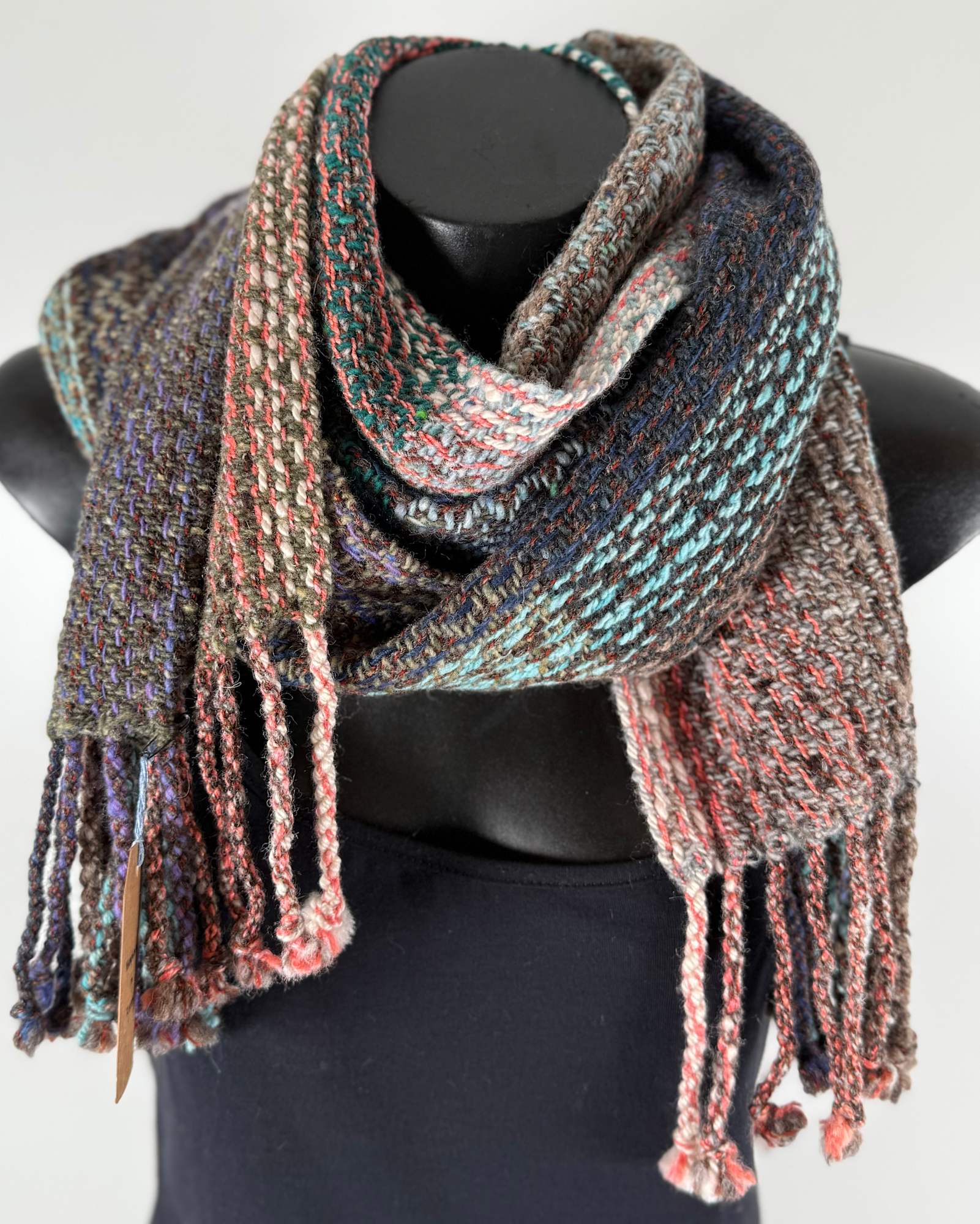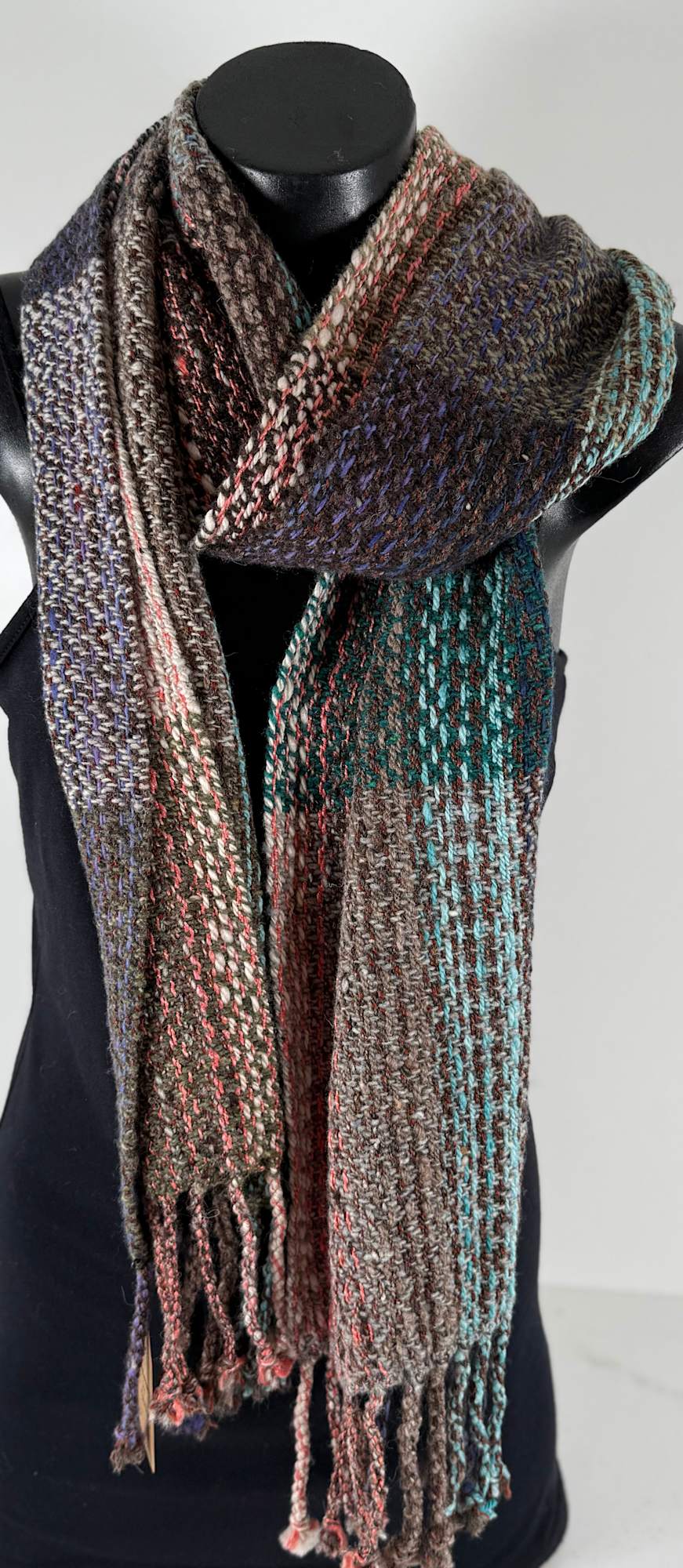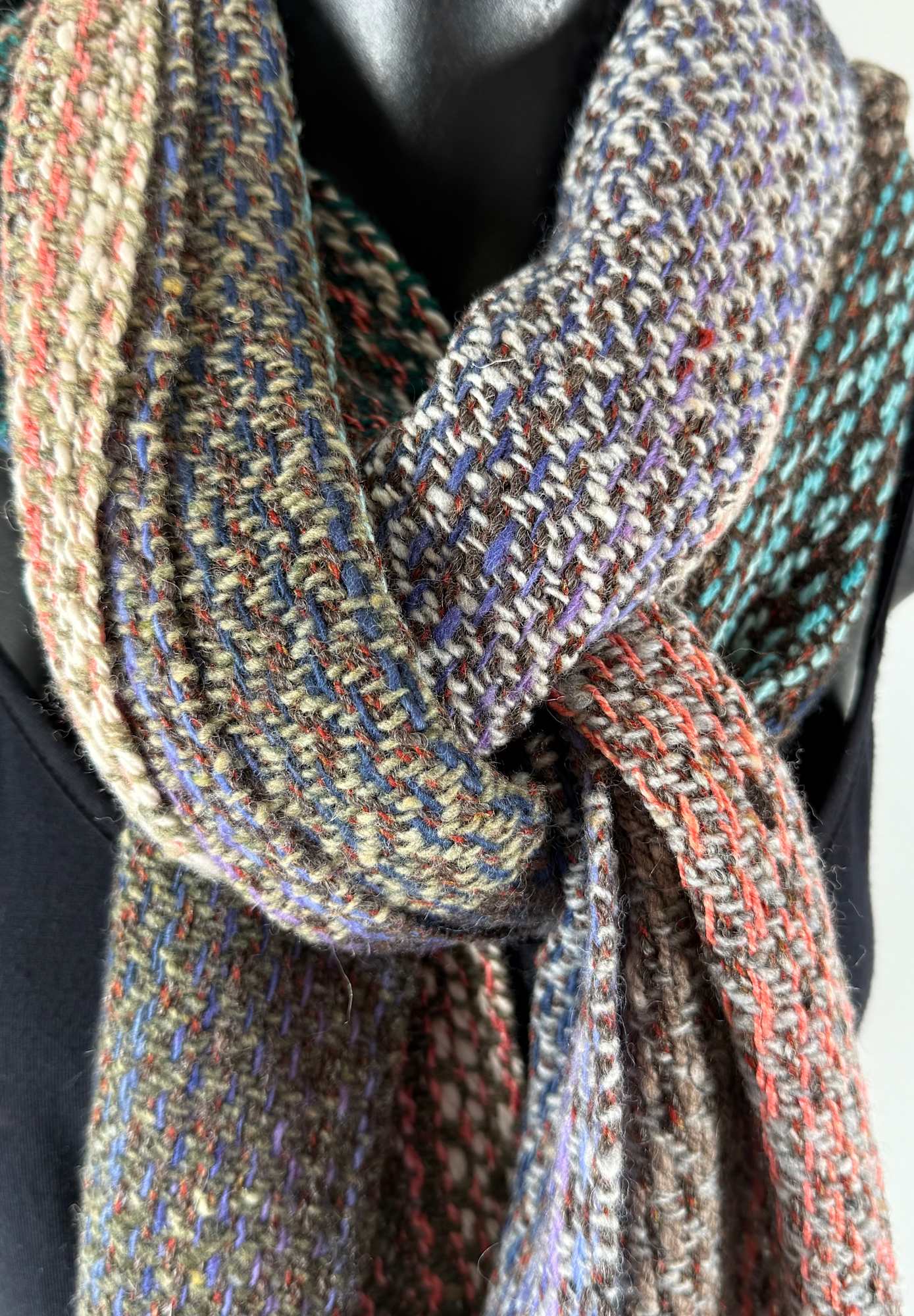 Scarf made from wool silk and alpaca in a multitude of colours. Warp is hand spun. Twill pattern.