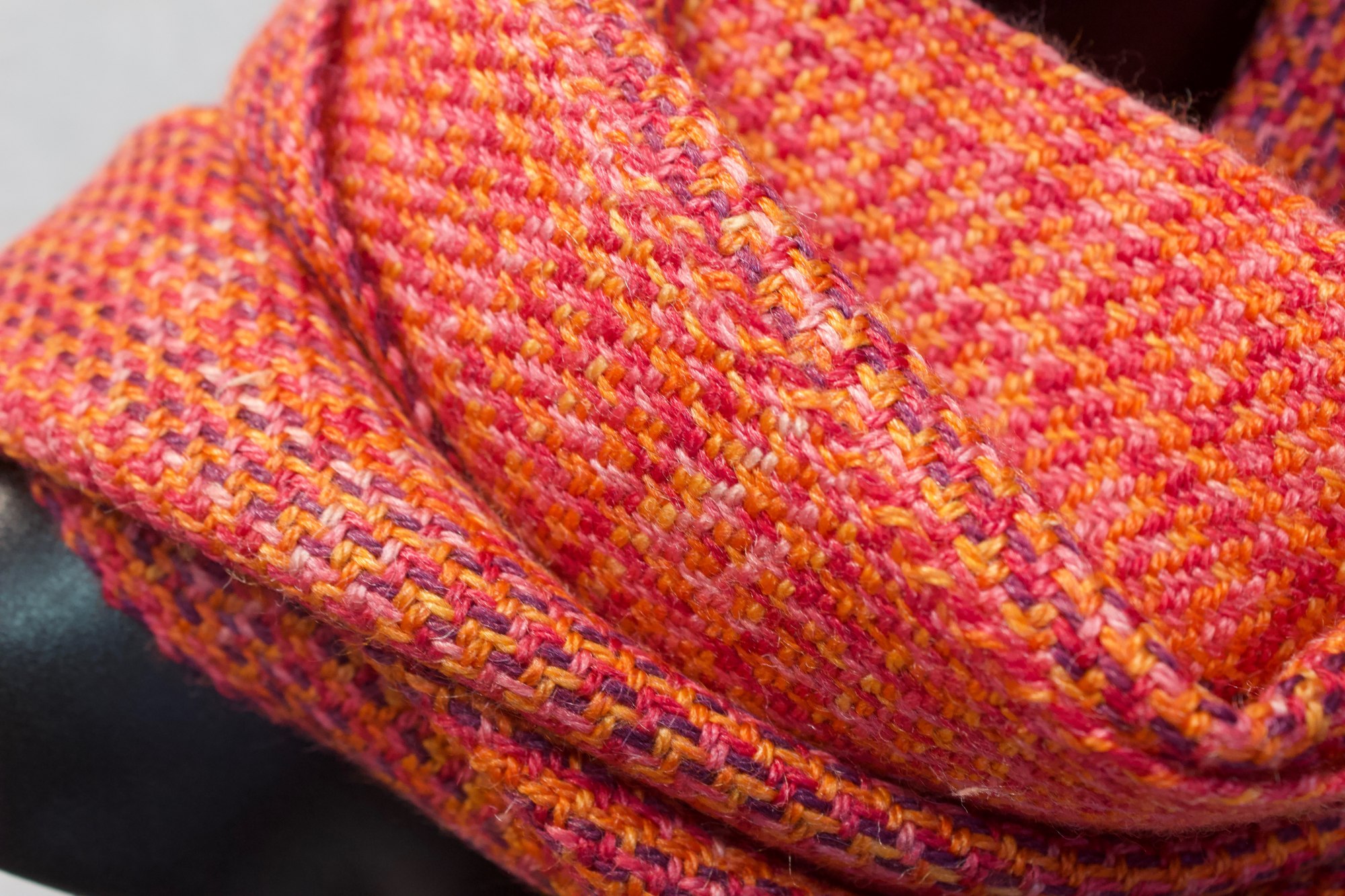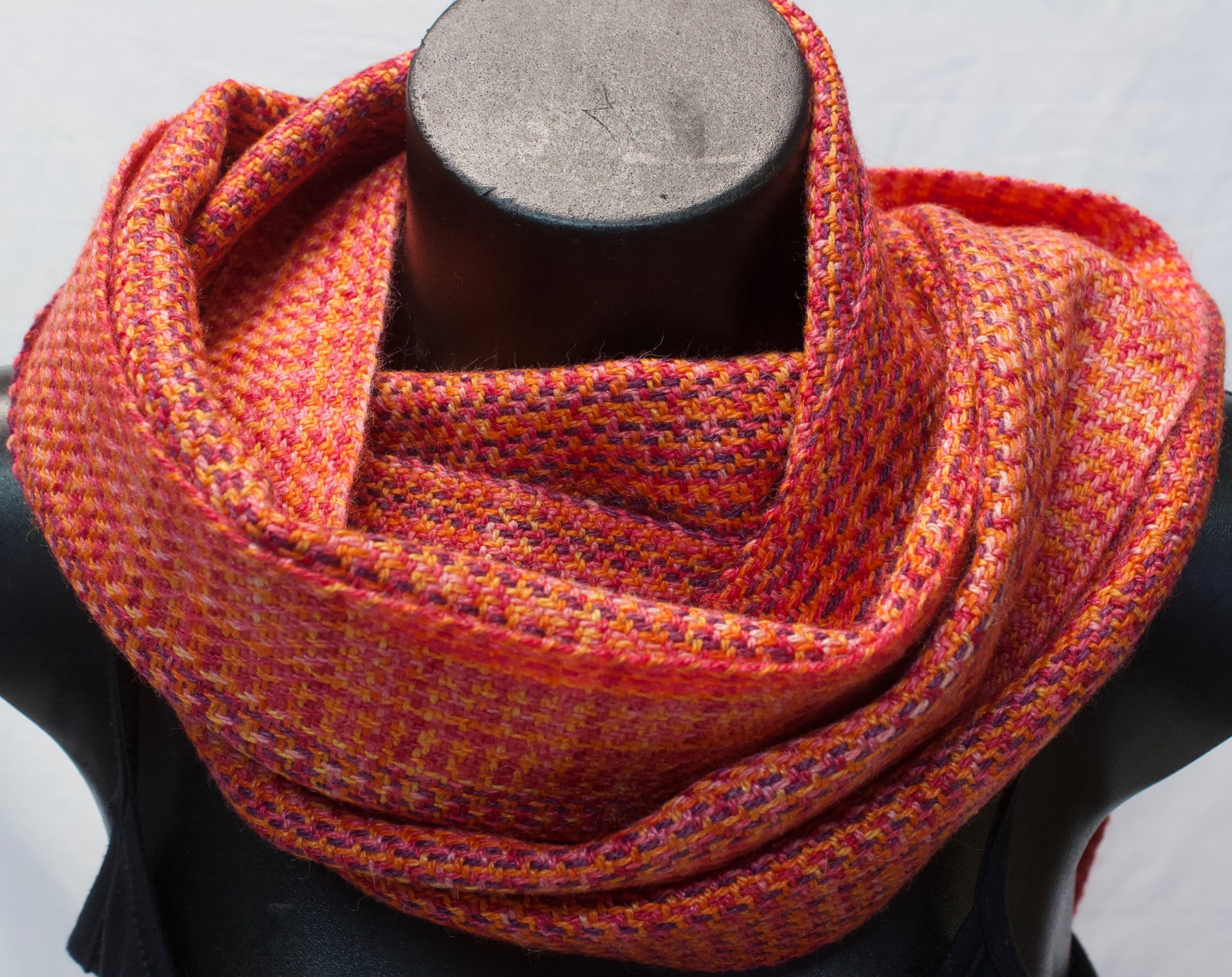 Scarf made from hand dyed wool/silk in salmon pink and purple.