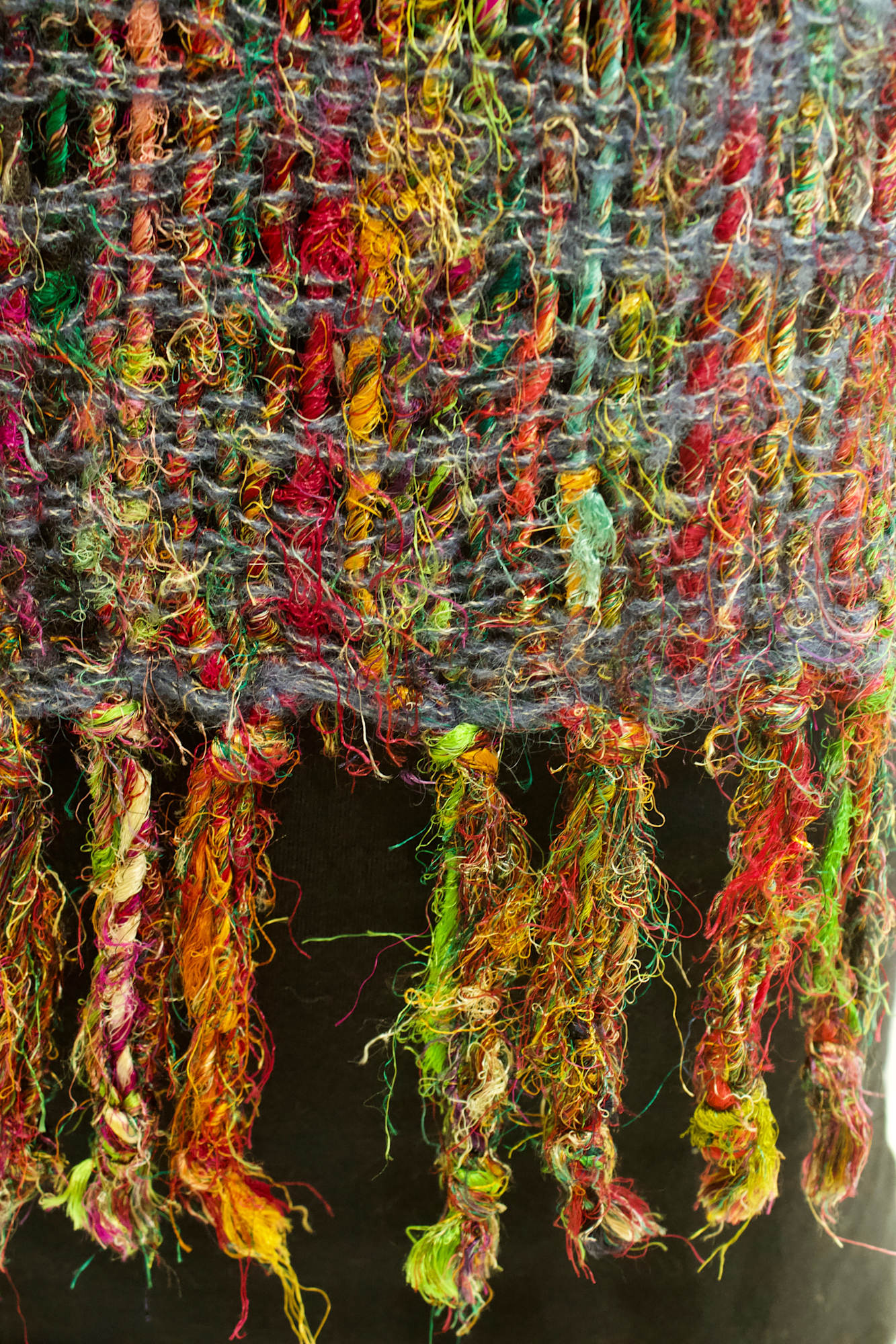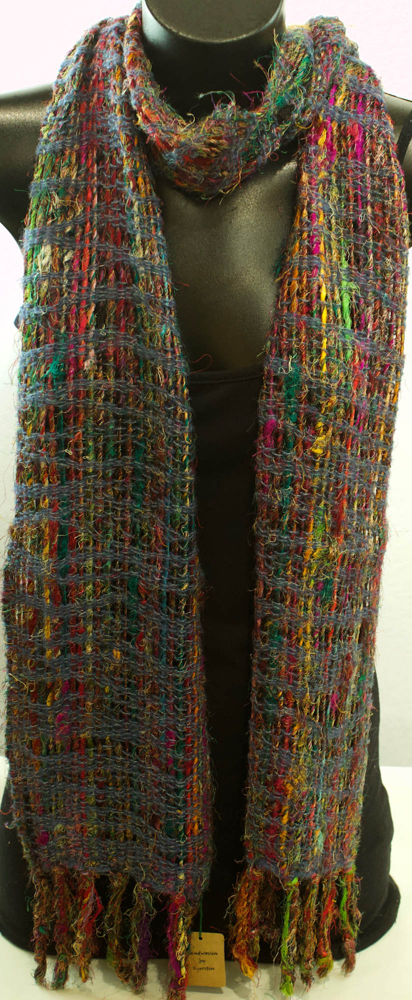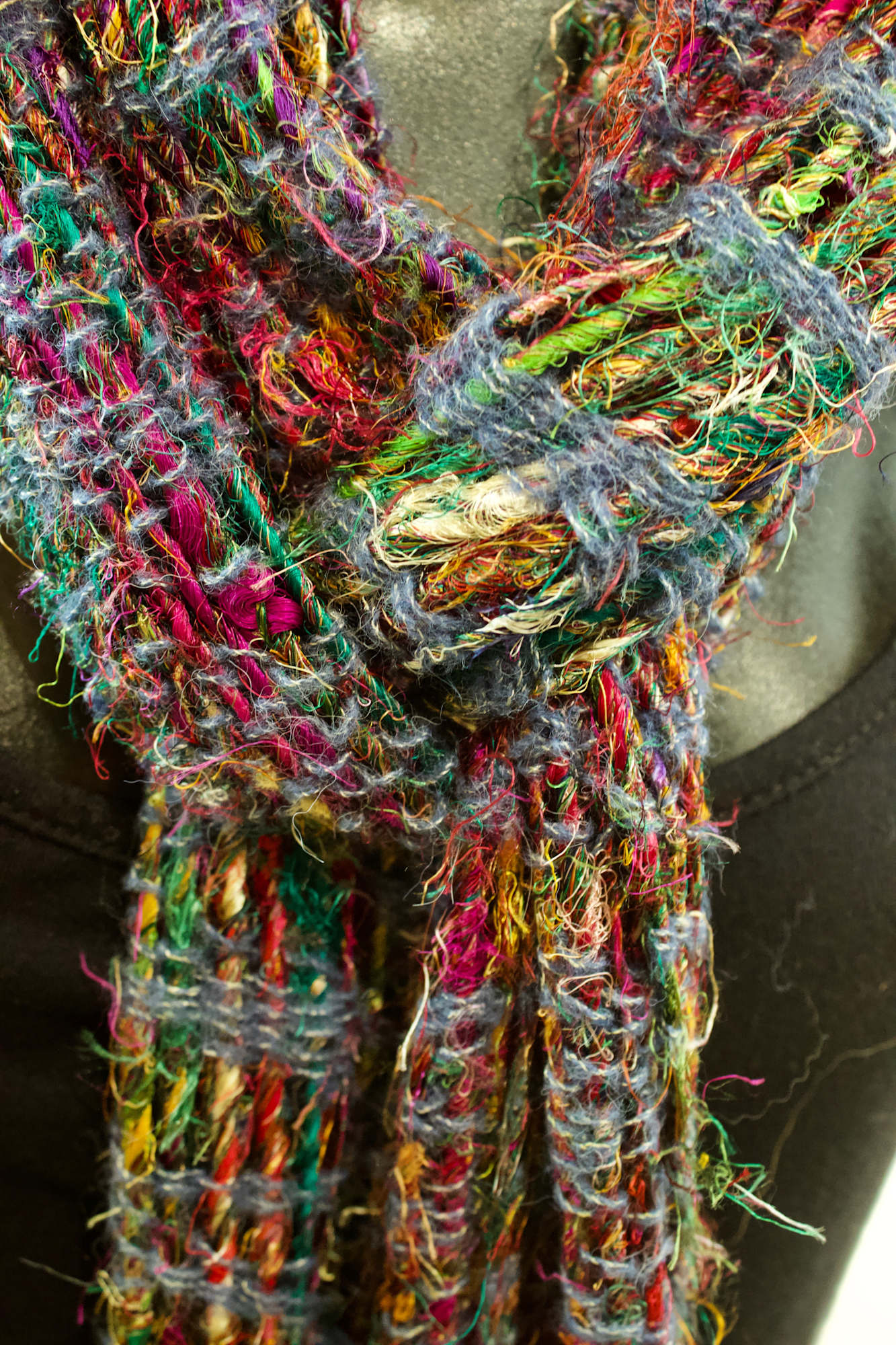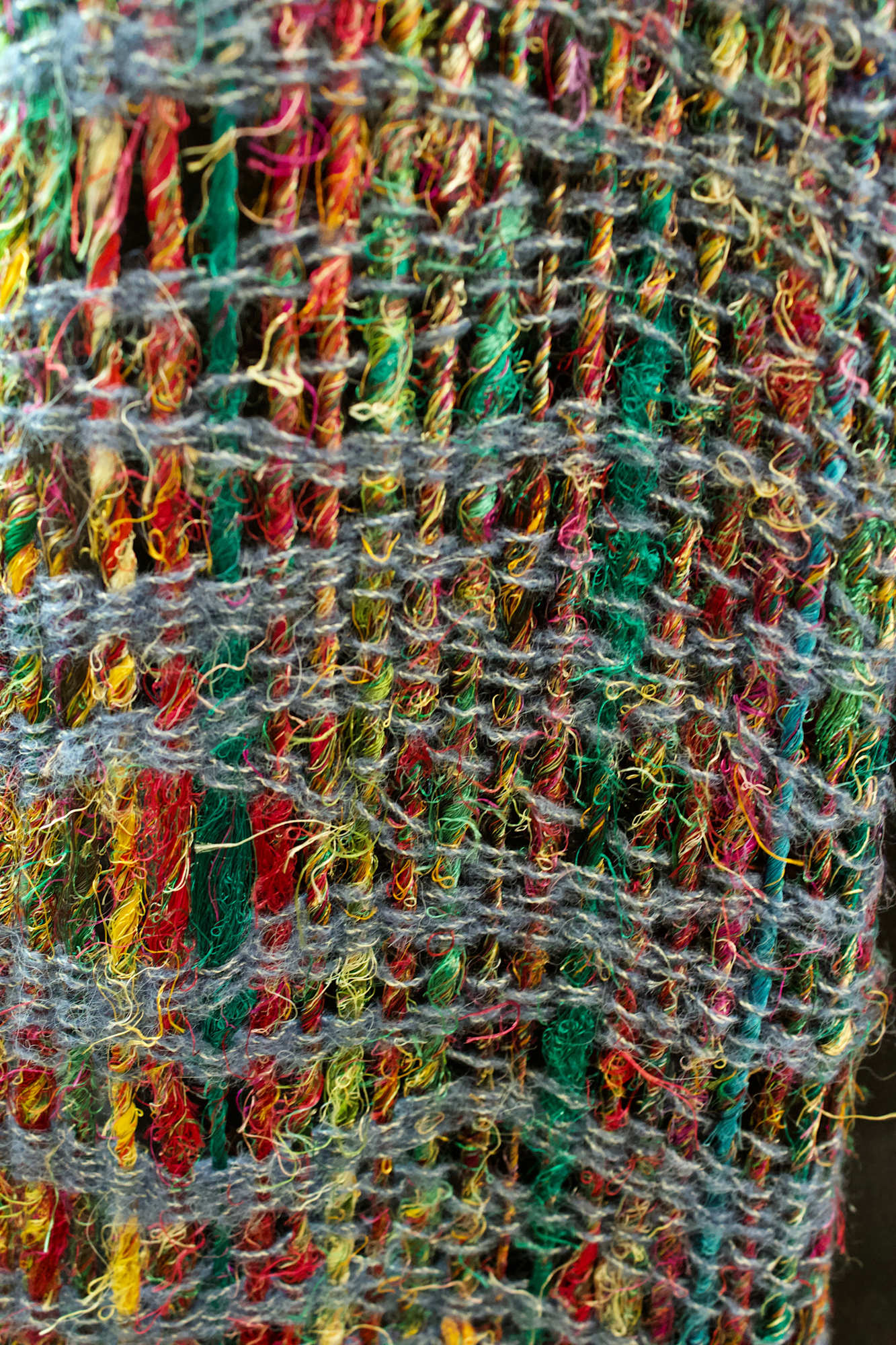 Scarf made from recycled, multicoloured sari silk warp and blue alpaca/silk weft. Extremely open, plain weave.