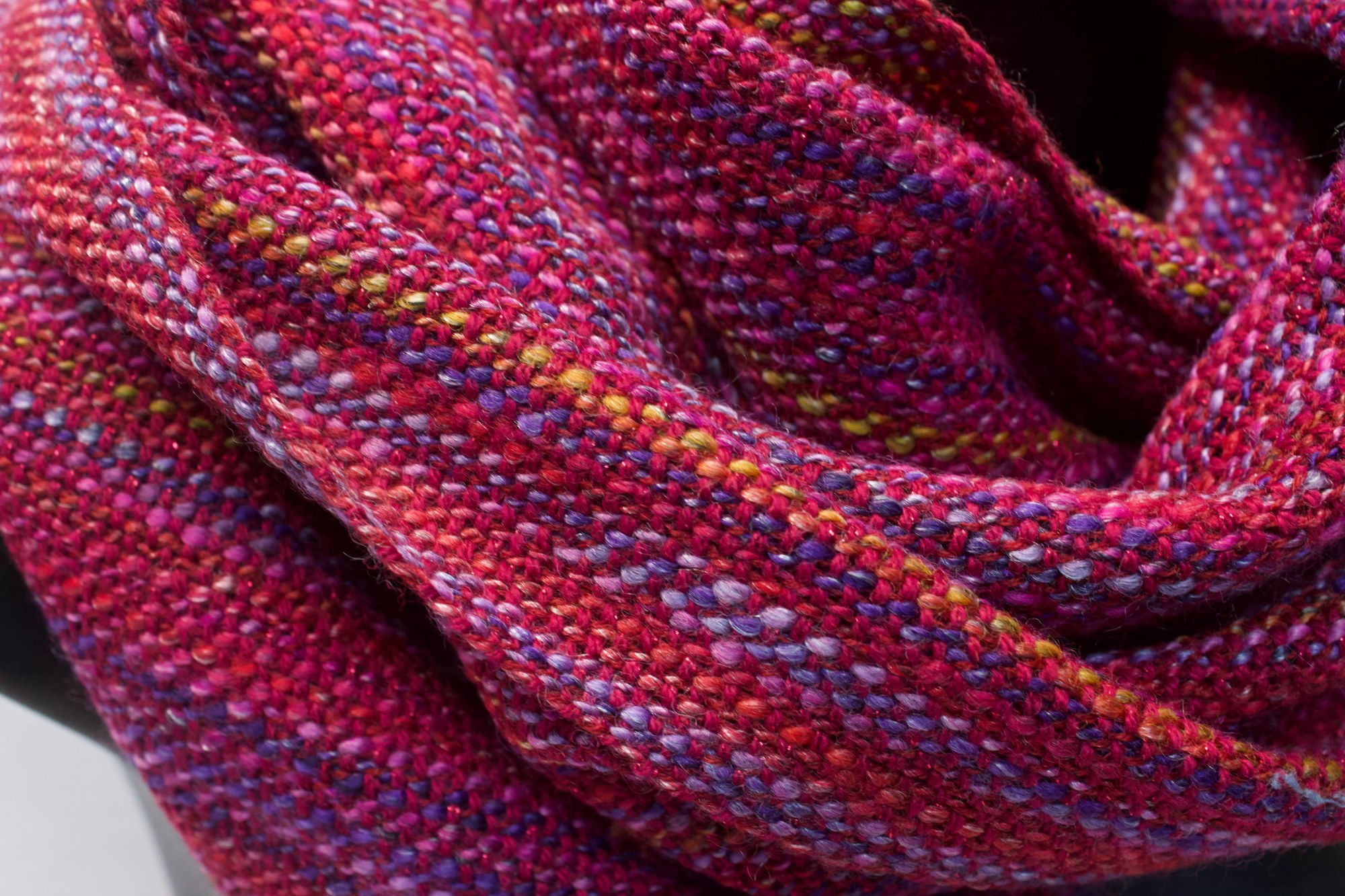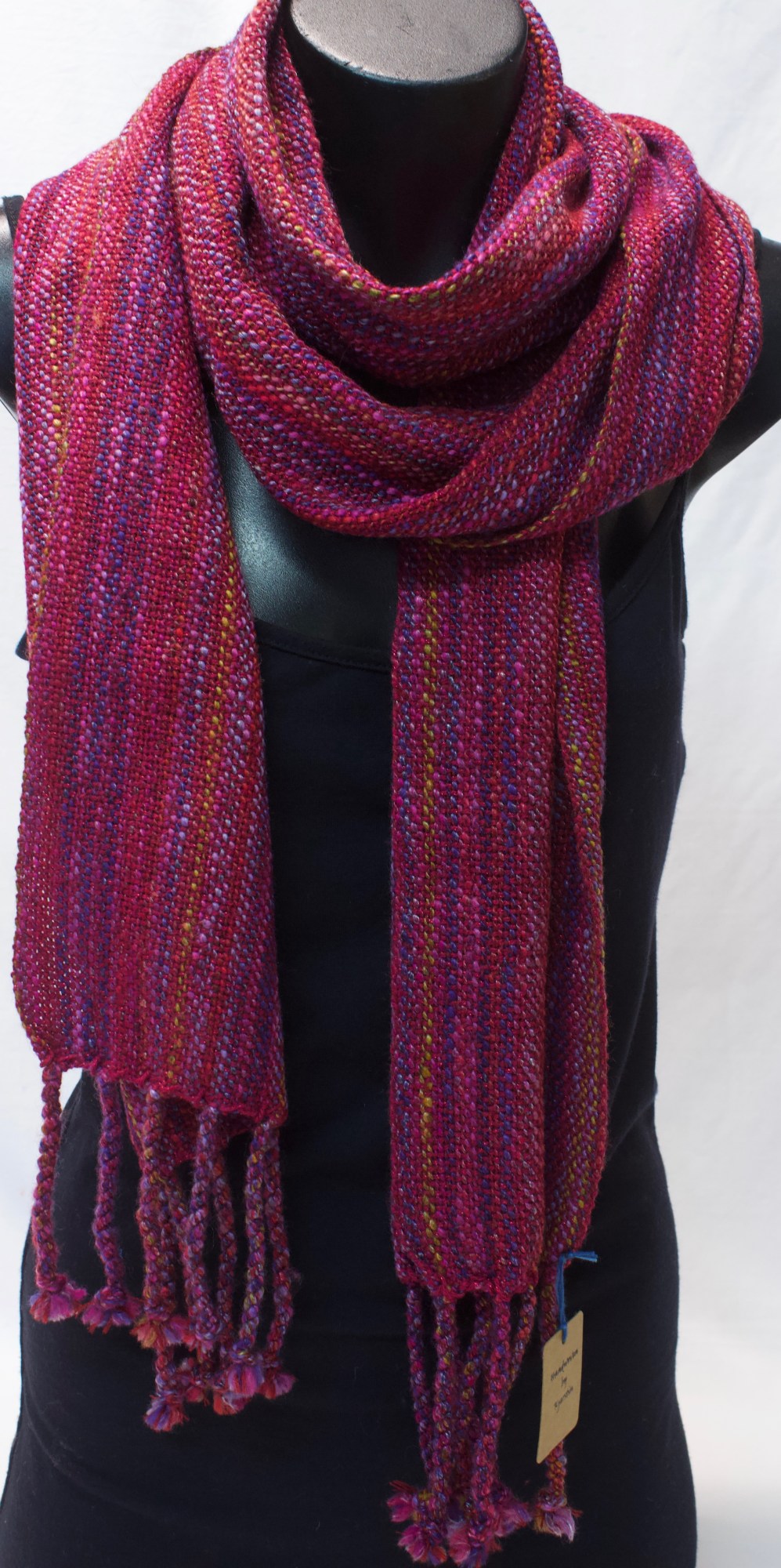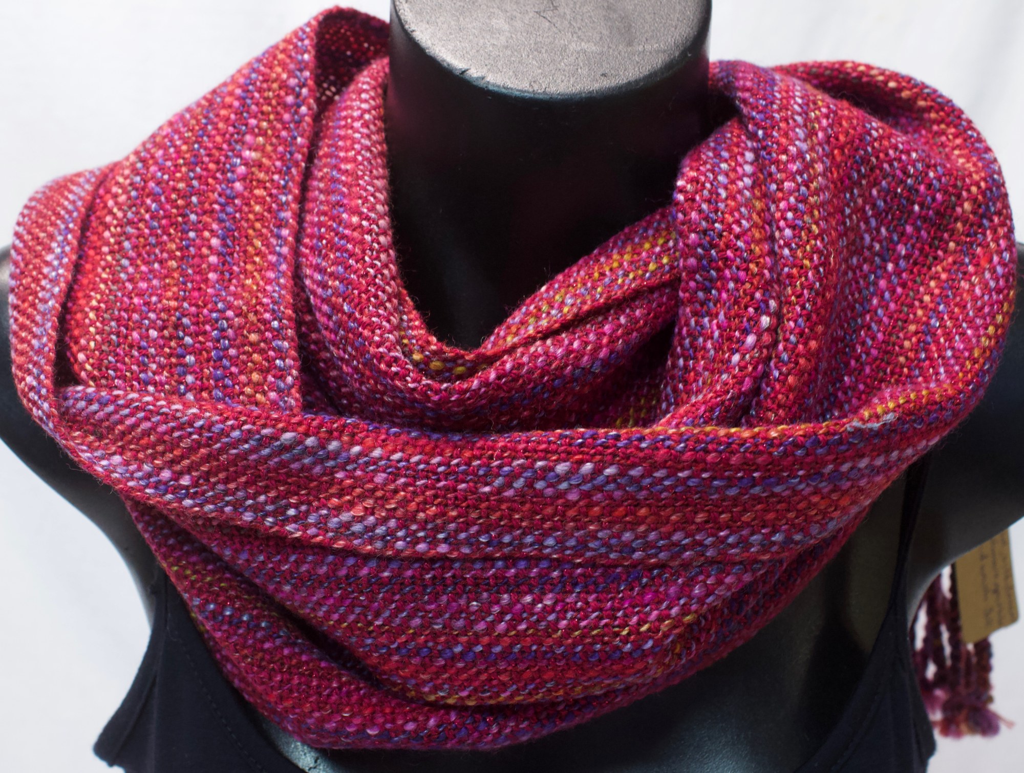 Scarf made from hand spun warp in red, blue and purple wool, silk and tencel.