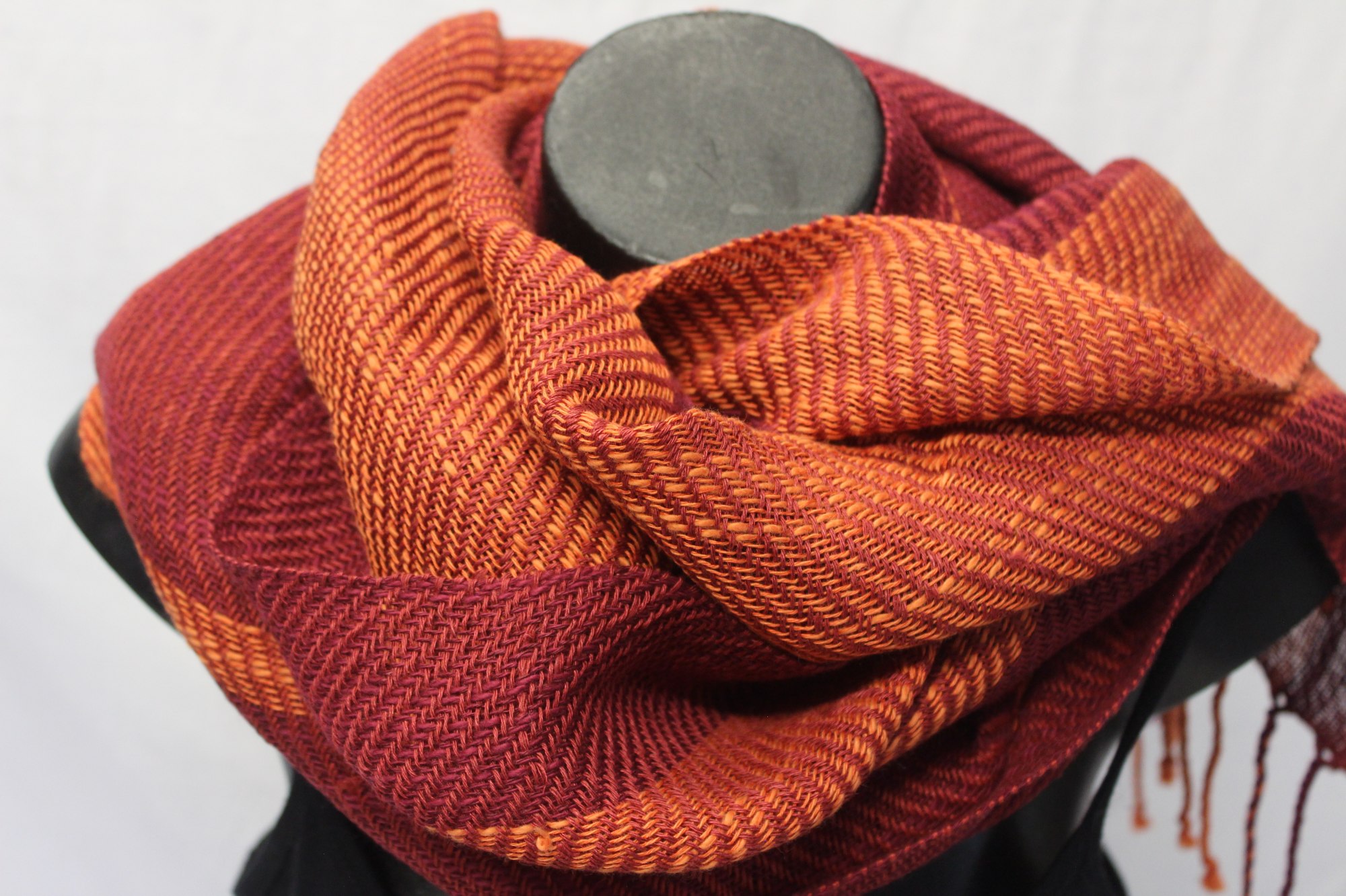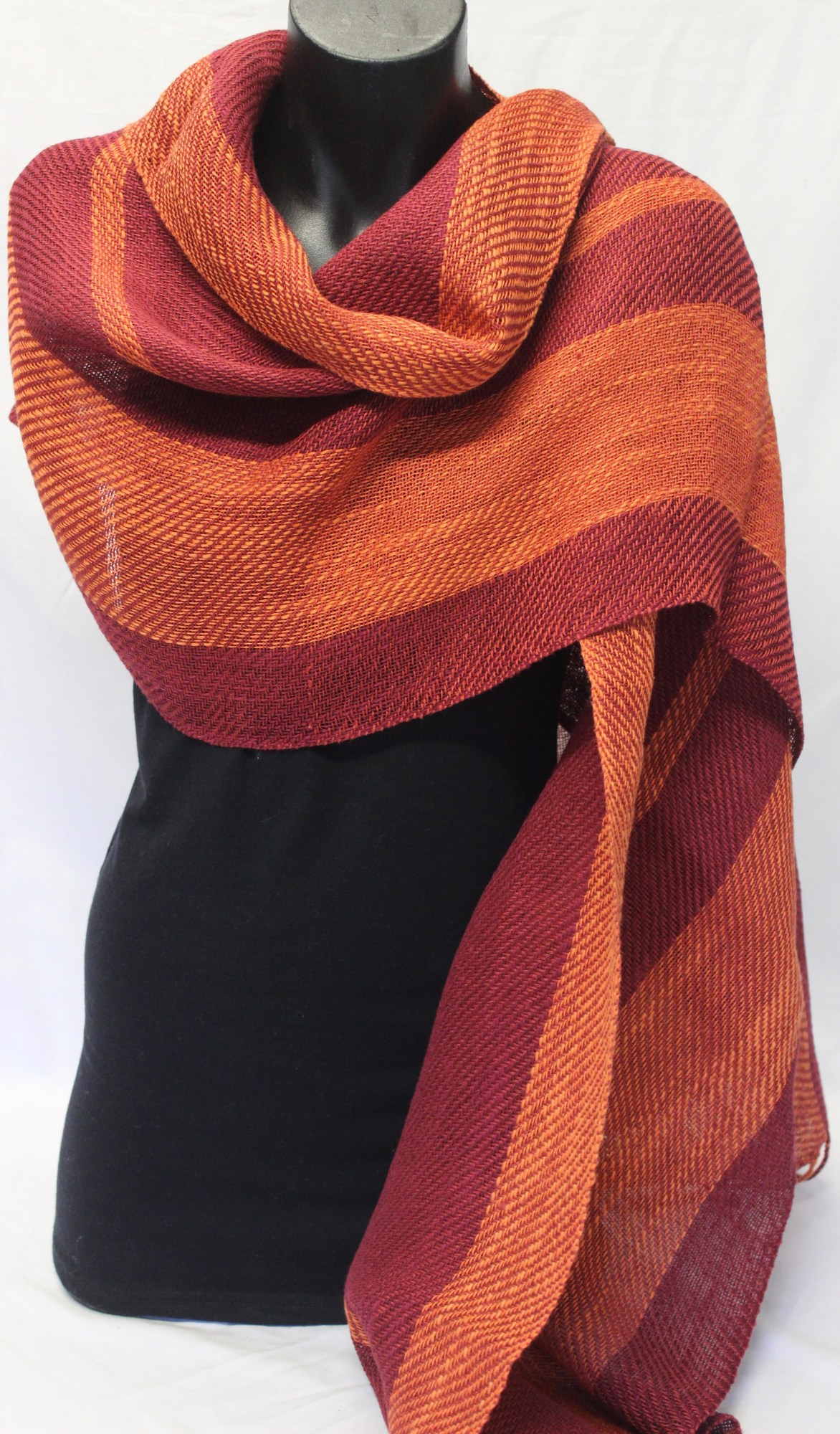 Shawl made from wine red and orange cottolin.